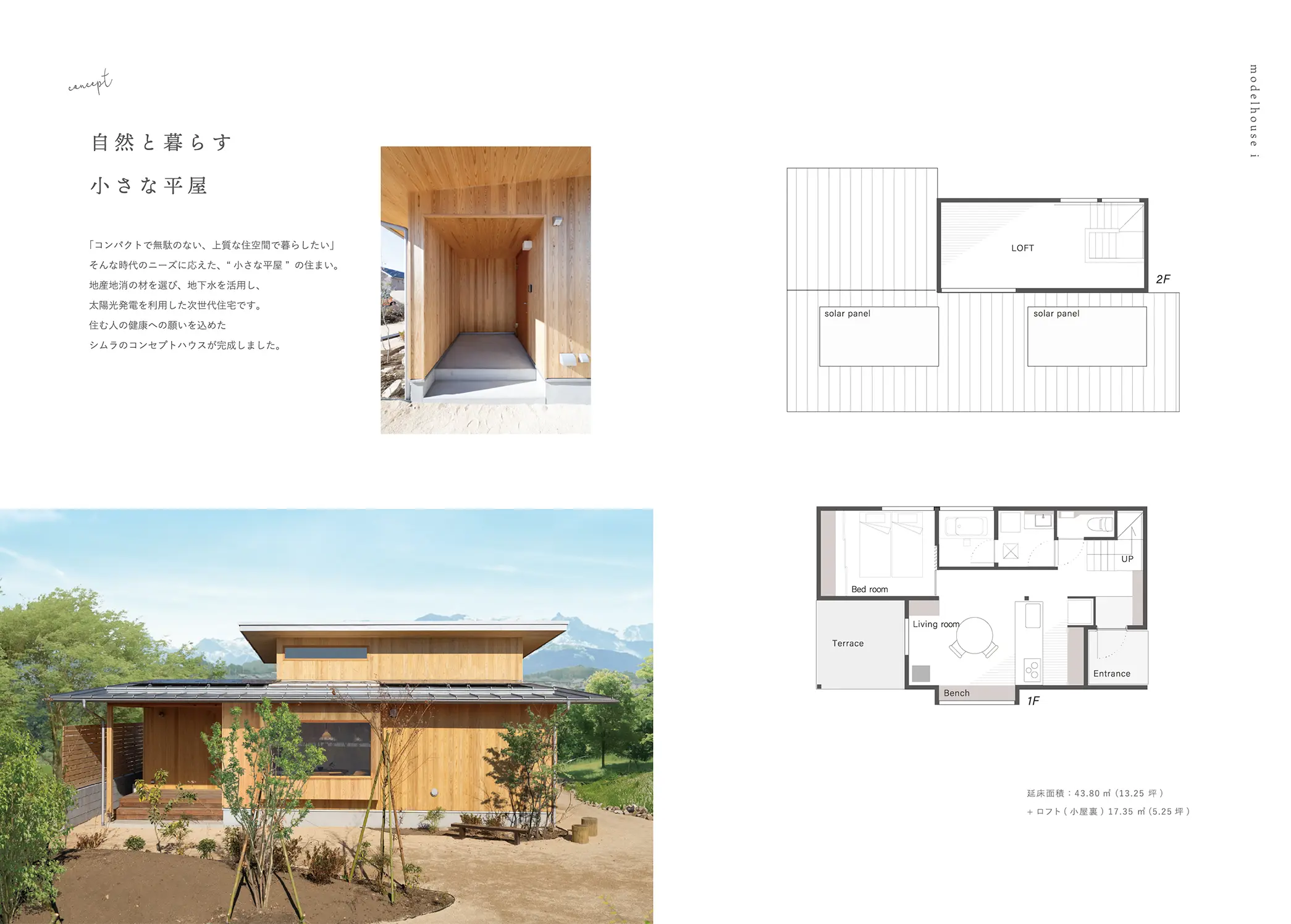 「コンパクトで無駄のない、上質な住空間で暮らしたい」そんな時代のニーズに応えた、小さな平屋の住まい。地産地消の材を選び、地下水を活用し、太陽光発電を利用した次世代住宅です。住む人の健康への願いを込めたシムラのコンセプトハウスが完成しました。