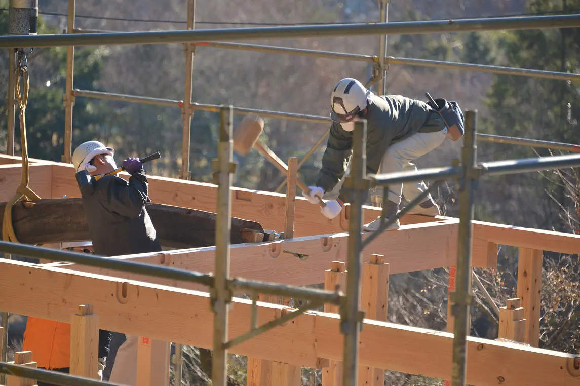 古材の梁を再生利用することもあるシムラの家。簡単には組み上がらないため、現場でミリ単位で調整しています。