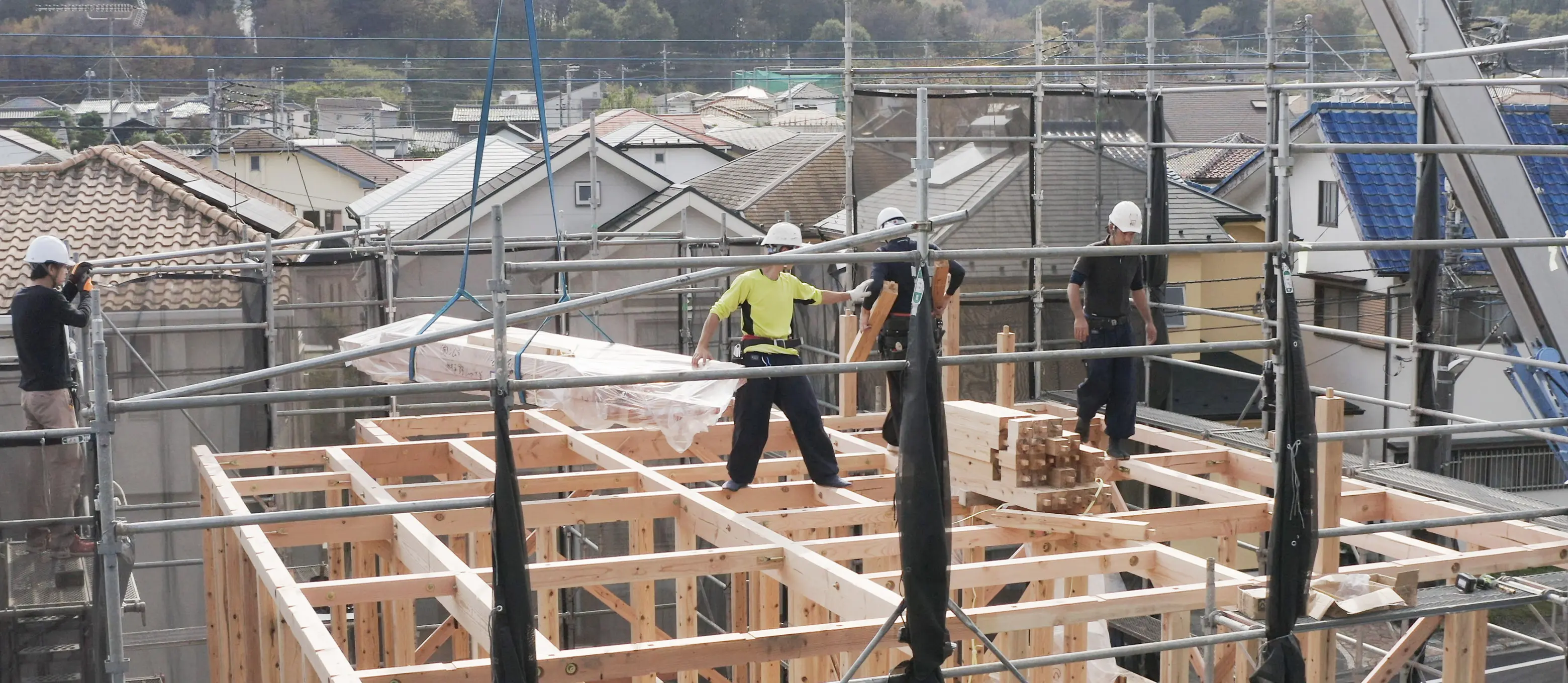 柱や梁がどんどん組み上がっていく様は壮観。プランニングした家が形になっていく、ワクワクする瞬間です。