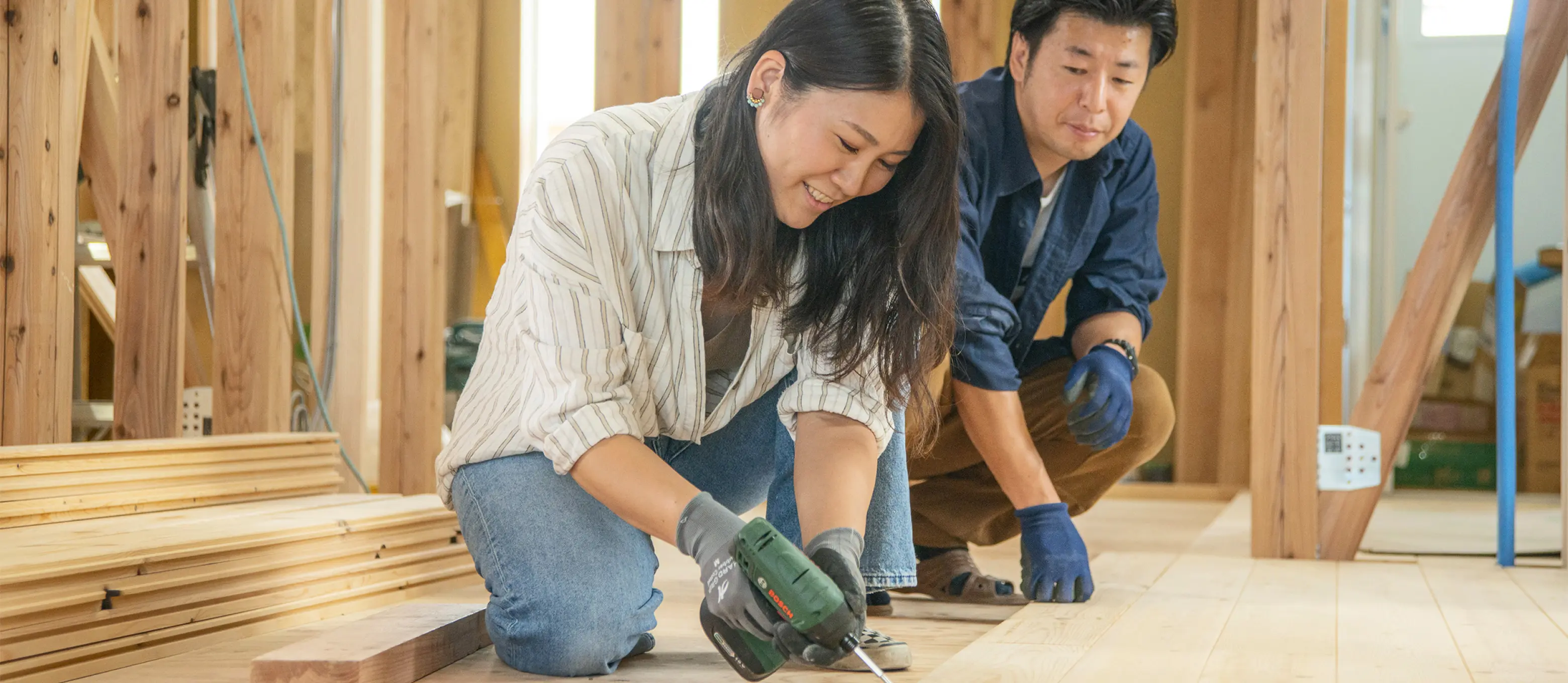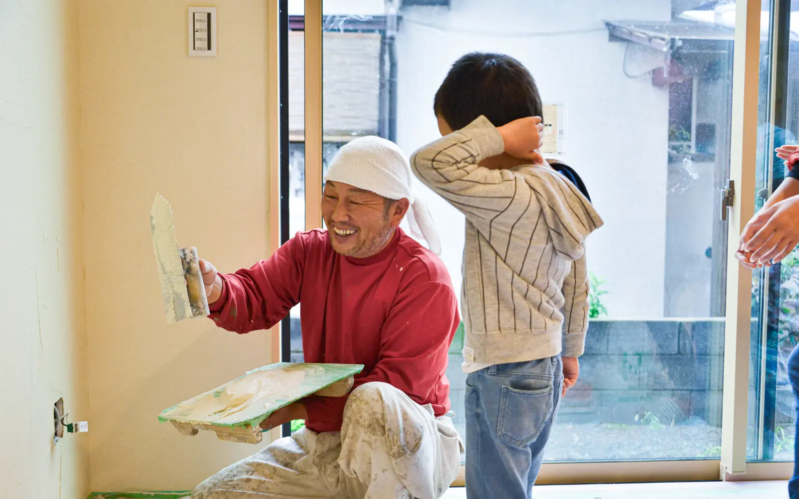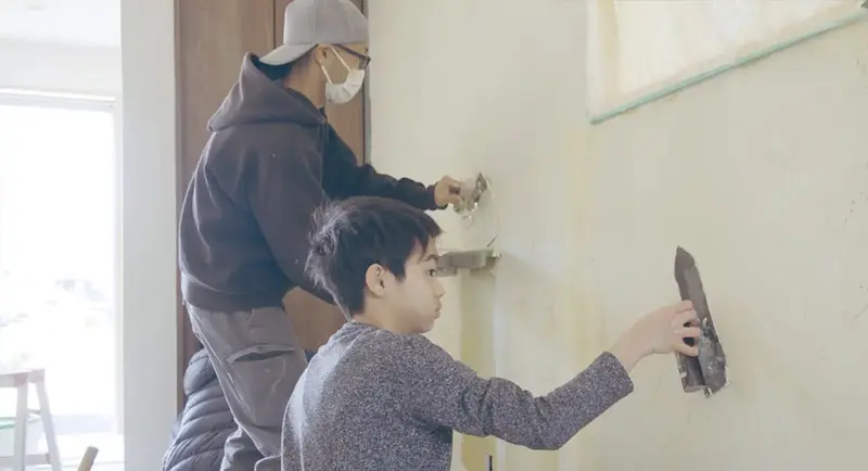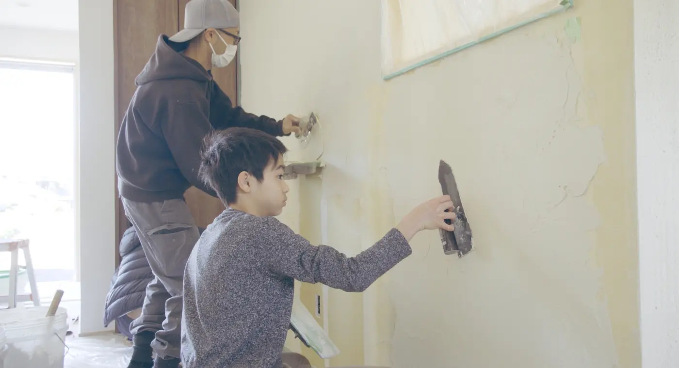 6個あるワークショップの中でも一番人気があるのは、本格的なコテ塗りを家族で楽しめる「左官体験(漆喰壁を塗る体験)」です。リビングや玄関など場所を選び、家族みんなで挑戦。家族やペットの手型を壁に残したり、好きな飾りを壁に埋め込んだりと、自由な発想で思うままに楽しんでください。そこに刻まれた体験は、いつしか愛着を⽣み、家族にとって大切な思い出となってくれるはずです。床を一枚張る、壁を塗るにしても、きっと子どもたちにとっては、驚きと発見の連続です。一つの場所を仕上げるにしても、数多の工程があり、こんなに丁寧に、多くの手間をかけてつくっているんだということを学びます。職人さんの技術に、間近で触れるまたとないチャンス。ただ体験するだけでない、職人とともにつくりながら、ものづくりの学びと感動を得ることができます。