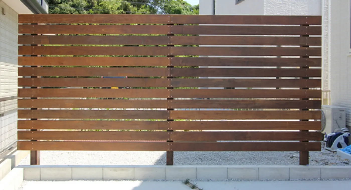 木の塀の横板張り。あらかじめ立てられた支柱に、木の横板を取り付けていきます。木の塀が完成すると、お家がより素敵になりますよ!