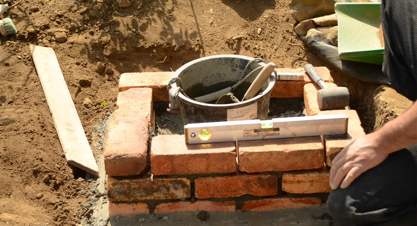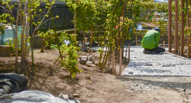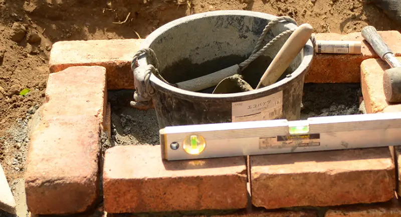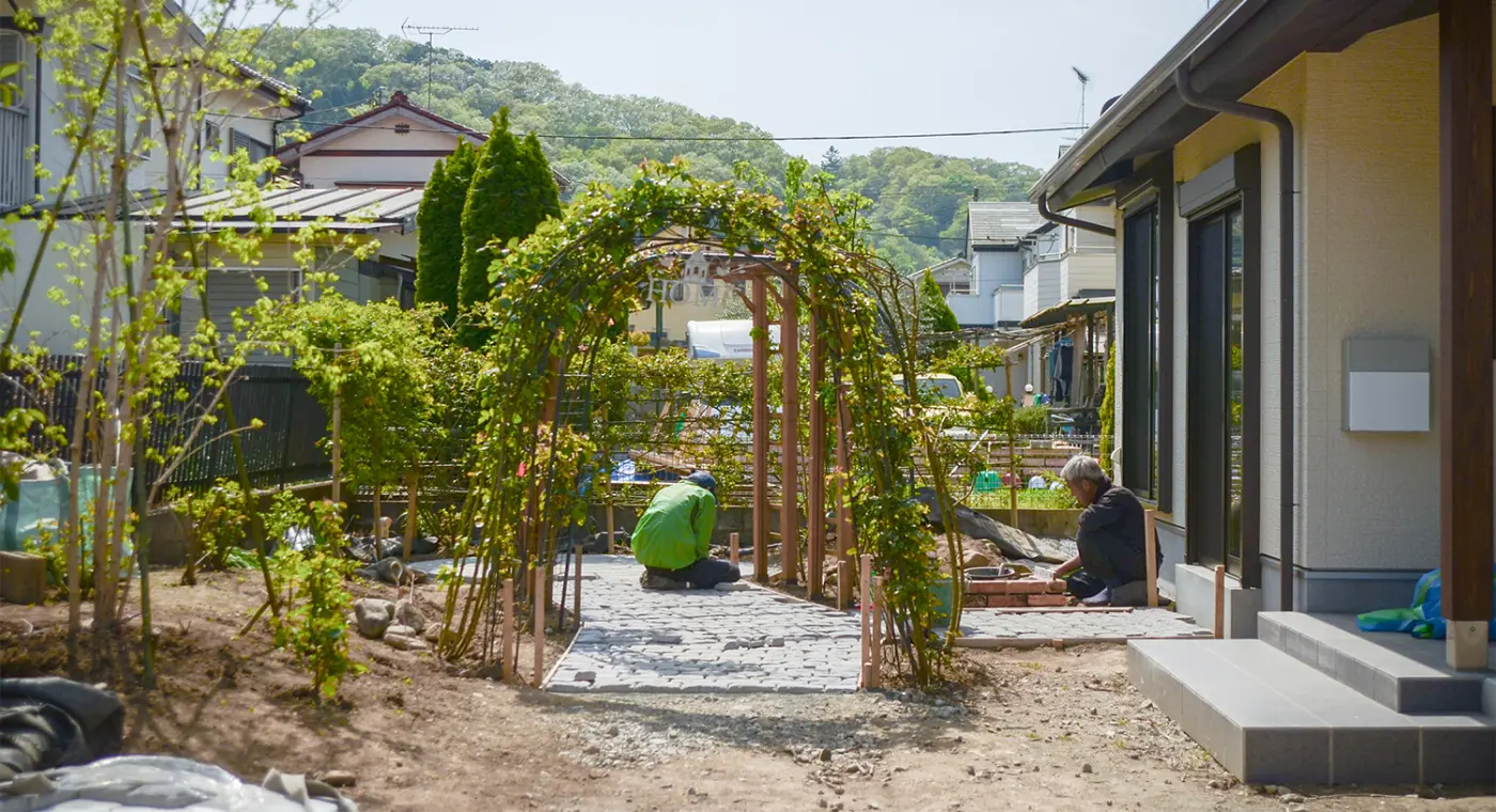 レンガや石などを積んで花壇をつくります。四角や曲線など、お好きな形で全体のバランスを見ながらつくります。住まわれてから植えるお花選びも楽しくなりますね。