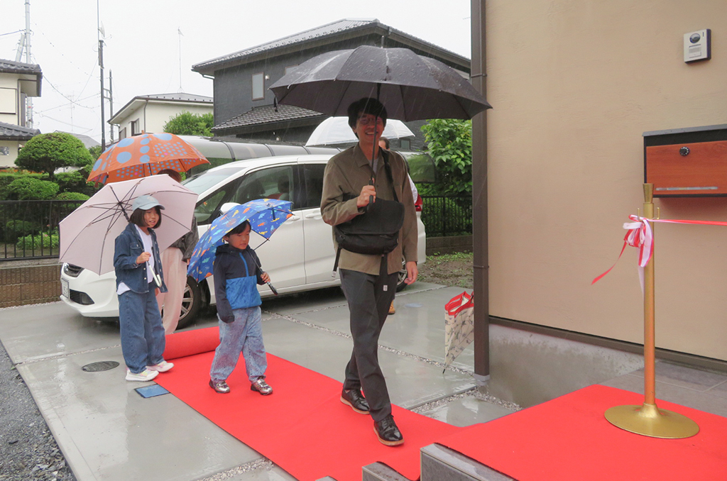 大雨の中、社長も傘を差してご家族に付き添いながら、式を支えてくださいました。