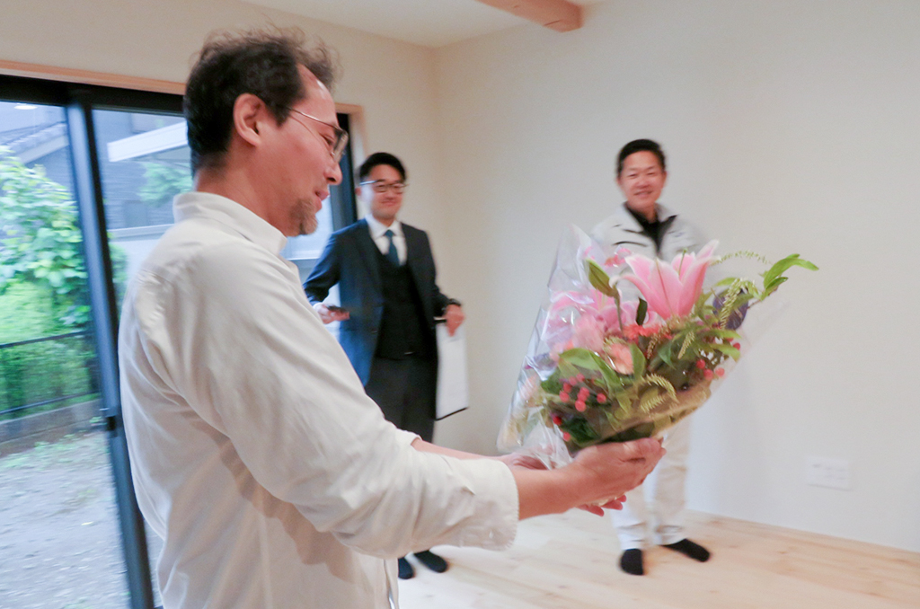 お祝いのお言葉のあとは、設計担当から花束の贈呈をいたしました。