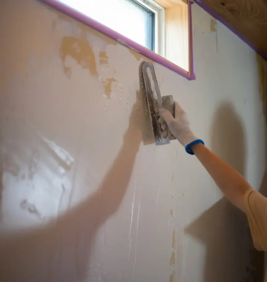 コテ板に材料をのせ、壁に均一に伸ばしていく下塗りから始まります。