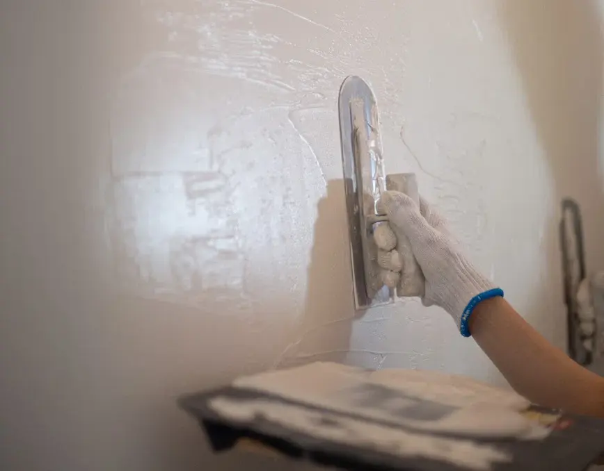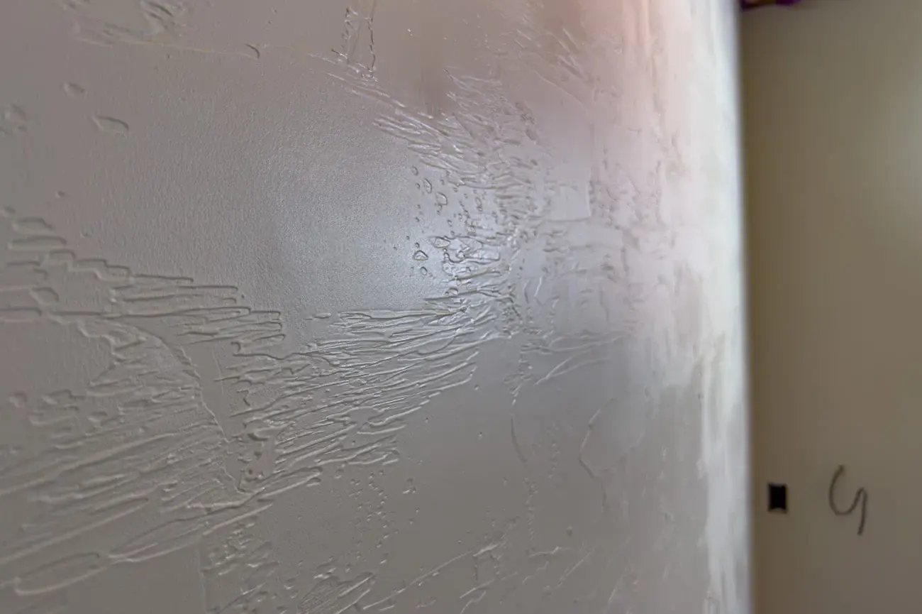乾きとの勝負になる二度塗りでは、表面に凹凸を出して壁の表情をつくっていきます。