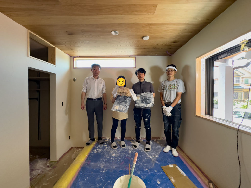設計担当の増田が「厚く塗ったほうが調湿性能が(少し)上がるのでお得ですよ」との言葉に一同納得。