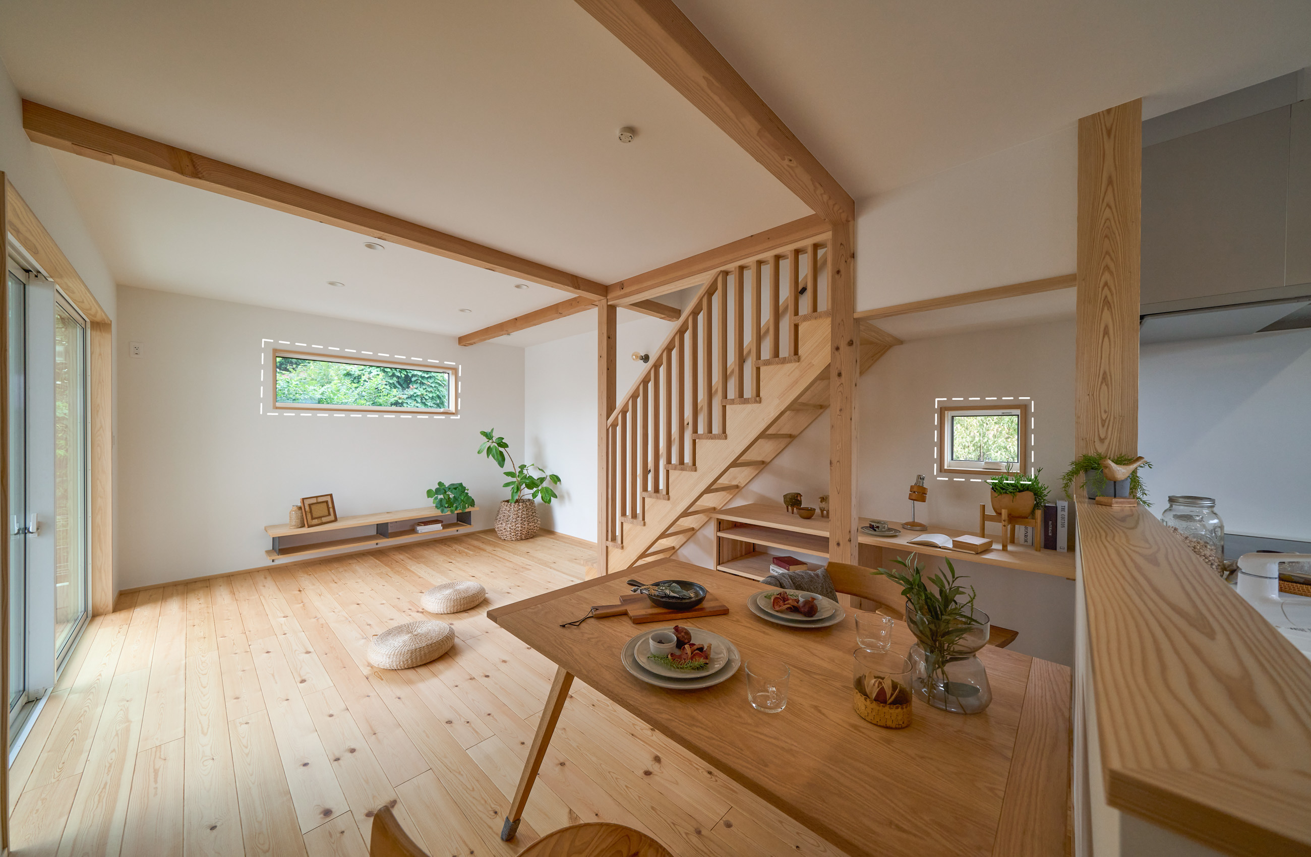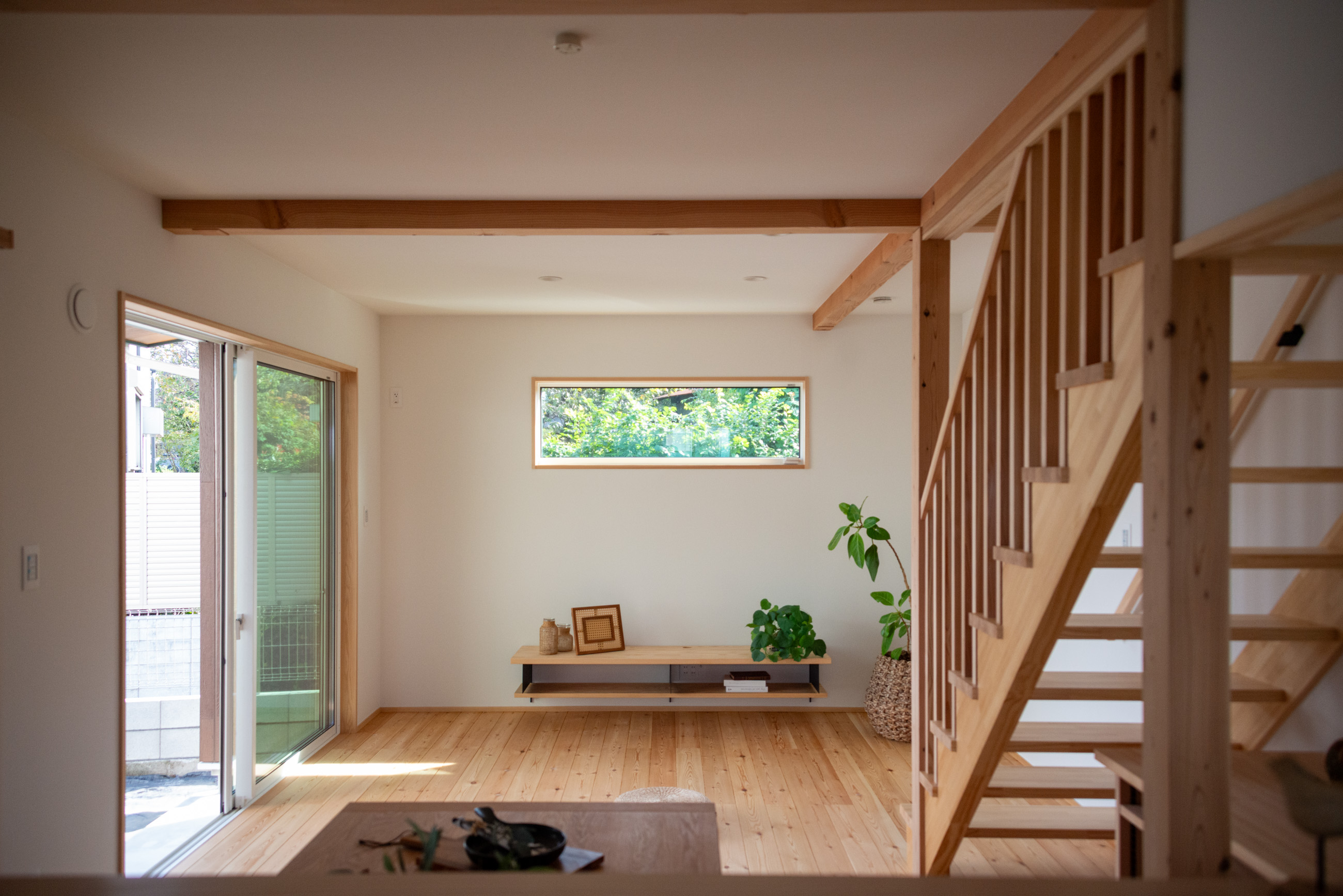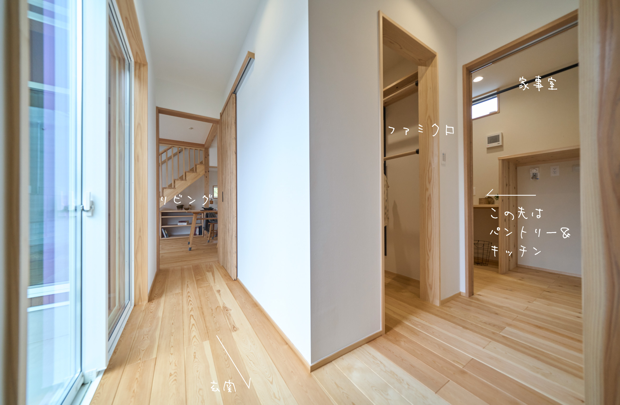 開催日 10月25日(土)・26日(日) 開催時間 10:00〜 / 14:00〜 「お庭を眺められるリビングと、家事動線の良い暮らしやすい家を」とご希望された建主様。旗竿地をうまく活かした建物配置により、リビングの大きな掃き出し窓からは奥行きのある庭の景色を楽しめます。また、玄関から家事室・ファミリークローゼット・キッチン・パントリーへと回遊できる、動きやすい家事動線を実現しました。リビング横には家族でシェアできるワークスペースを、さらに集中して仕事に取り組める書斎も設けています。加えて、可変できる子供部屋や細やかに計画された収納、すっきりと隠せるロールスクリーン用の埋め込みボックスなど、日々の暮らしを心地よく整える工夫を随所に凝らしました。 こんな方におすすめのお住まい ワークスペースや書斎をお考えの方 木の質感や自然素材にこだわりたい方 回遊動線や家事効率を重視する共働き世帯の方 将来的な家族の変化に対応できる住まいをお考えの方 自分たちの生活にフィットする収納や設備にこだわりたい方 リビングからの景色にもこだわりたいとお考えの方 無駄のないシンプル設計をご希望の方 見どころポイント 土地の条件を上手に活かしたリビングの設計 将来的に2部屋に可変できる子供部屋 動きやすいぐるっと回遊できる家事動線 洗濯家事がスムーズに、一階のファミリークローゼット 衣類が見やすく取り出しやすい寝室クローゼット 家族でシェアできるリビングワークスペース 集中できる「こもれる書斎」スペース 目線と風景を考慮したピクチャーウィンドウ ロールスクリーンのスッキリ目隠し収納ボックス 性能値について ■UA値(外皮平均熱貫流率)/0.41 W/㎡・K ■C値/0.44 ㎠/㎡ 見どころPick Up 半中庭を楽しむ間取り 「プールやガーデニングなどを楽しめる中庭のような庭が欲しい」という建主様。L字型の配置で室内空間の広さも確保した「半中庭」のプランに。リビングの大きな掃き出し窓と、廊下の窓からお庭を眺められます。 景色を切り取るピクチャーウィンドウ 近隣は緑豊かな住宅街。配置を工夫して、人の目線は遮りながらも美しい景色を切り取る大小の窓を設置。リビングを心地よくする工夫の一つ。 ぐるっと回遊できる家事動線 玄関からぐるっと回遊できる家事動線。玄関→ファミクロ→家事室(兼脱衣所)→パントリー→キッチン→リビング→廊下→玄関と、動線上に家事設備も充実。 家事室にはガス乾燥機を設置予定。1Fにファミリークローゼットを設けたことで洗濯後の服を仕舞うのも楽ちん。お庭にもすぐに出られるので、外干しでも動線がスムーズ。 完成見学会ご予約フォーム 開催日時 10月25日(土)・26日(日) 10:00〜 / 14:00〜 開催場所 健幸工房 シムラ 最寄駅青梅線小作駅 徒歩19分 集合場所 【健幸工房シムラ】にご来店いただき、個別にご案内いたします。 完全予約制となります。 お電話【0428-33-9555】または【予約フォーム】にてお申し込み下さい。 ※)設計打ち合わせ中のお客様は、設計担当者にお問い合わせください。 ※)お客様の大切なお家をお借りしての見学会です。 抱っこの赤ちゃん以外の、小学生以下のお子様は無料託児サービスをご利用いただくか、ご家族交代でのご見学をお願いいたします。 託児サービスは満員となることがございます。お早めにご予約ください。 託児サービス 無料予約制 『子供と一緒だとゆっくり見られない』『走り回って傷をつけないか心配』という声を受けて、シムラの見学会では無料託児サービスを実施!専任のシッターがお子様を責任持ってお預かりいたします。見学会ご予約の際にお申し込みください。 託児予約 予約フォームまたはお電話 託児場所 健幸工房シムラ / スタジオ棟2F あそび場 予約締切 託児のお申込みは見学希望日の2営業日前の15:00まで 予約時の注意 お子様のお名前・性別・年齢(月齢まで)をご記載ください。 アレルギーや持病、その他配慮が必要なお子様に関する情報も些細なことでも構いませんので必ずお知らせください。 ※託児をご希望の場合、お子様のお名前・性別・年齢(月齢まで)をお伝えください。 ※水分やオムツなど持参品にお名前をご記入の上、ひとまとめにしてお渡しください。 ※託児キャンセルの際は、ご連絡をお願いいたします。 ※アレルギーや持病、その他配慮が必要なお子様に関する情報も些細なことでも構いませんので必ずお知らせください。 ※託児サービスは満員となることがございます。お早めにご予約ください。 完成見学会ご予約フォーム Concept シムラが目指すのは「健やかで幸せに暮らせる家。」 こだわりの自然素材と木のぬくもりに包まれて 家族が生きていく。育っていく。身近な暮らしづくりをお手伝いさせて頂けたなら、私たちも幸せです。 シムラの家づくりへ