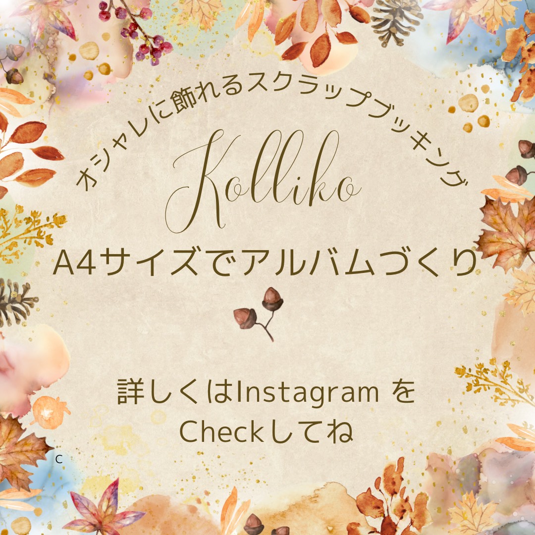 持ち物:写真(後から貼っていただいても大丈夫です)、ボンドのり、ハサミ、テープのり、スクラップブッキングをされている方はいつものクロップ道具をお持ち下さい