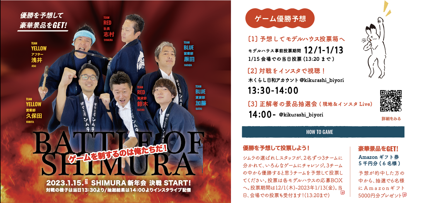 *参加方法* 12/1(木)~2023年1/13(金)の期間、各モデルハウスの応募専用BOXから参加できます。 ゲームの対戦模様は、新年会当日インスタライブにて13:30- 配信予定。 予想的中者の中から景品が当たる抽選会の模様は、 当日14:00頃より、インスタライブで発表します(*^^*)