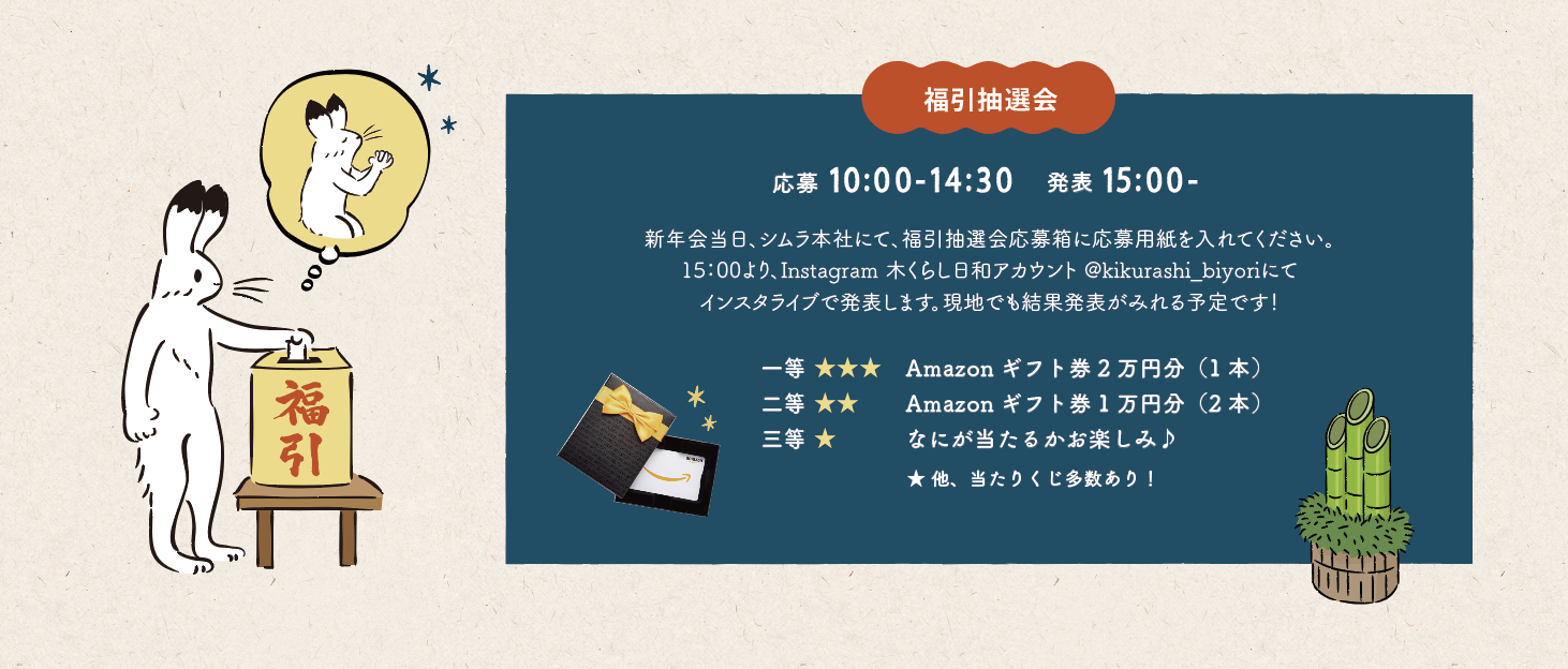 新年会当日、15:00より、Instagram 木くらし日和アカウント@kikurashi_biyoriにて インスタライブで発表します\(^o^)/ 現地でも結果発表がみれる予定です!