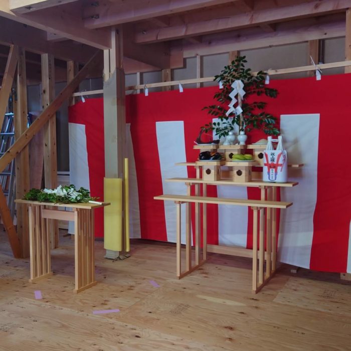 モデルハウスの中にも紅白幕をはり、祈祷の祭壇が準備されています。