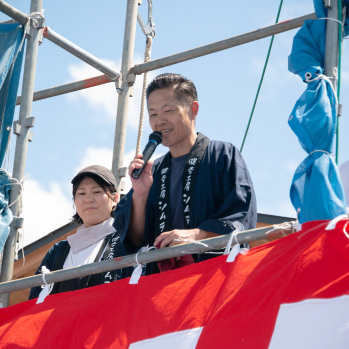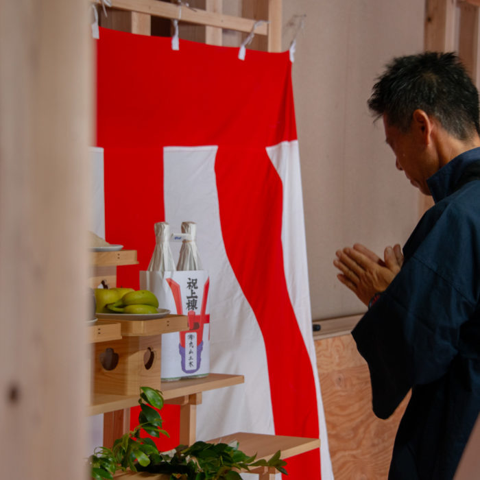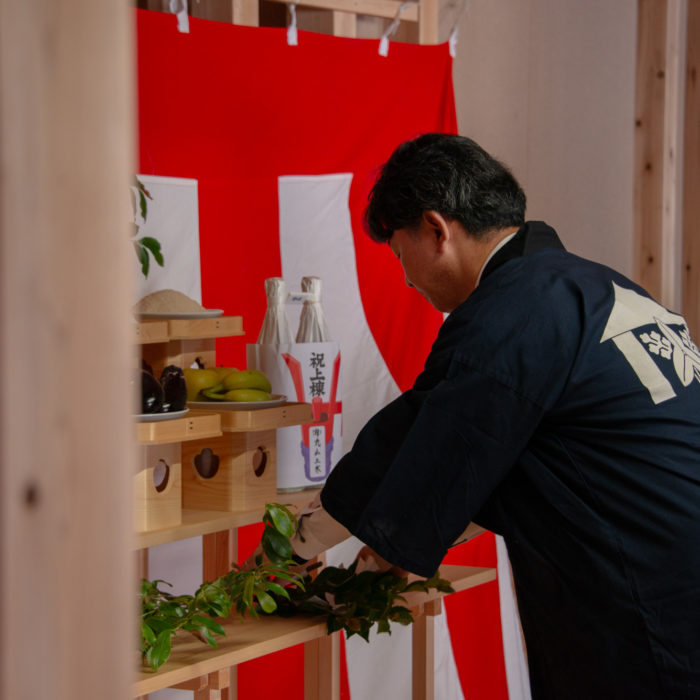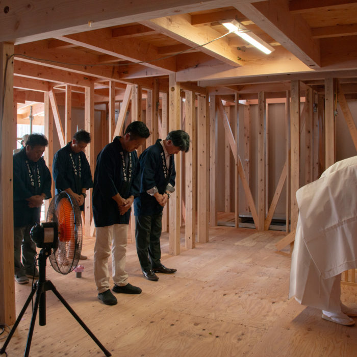 社長、専務、現場監督、大工が玉串を捧げてお祈りします。