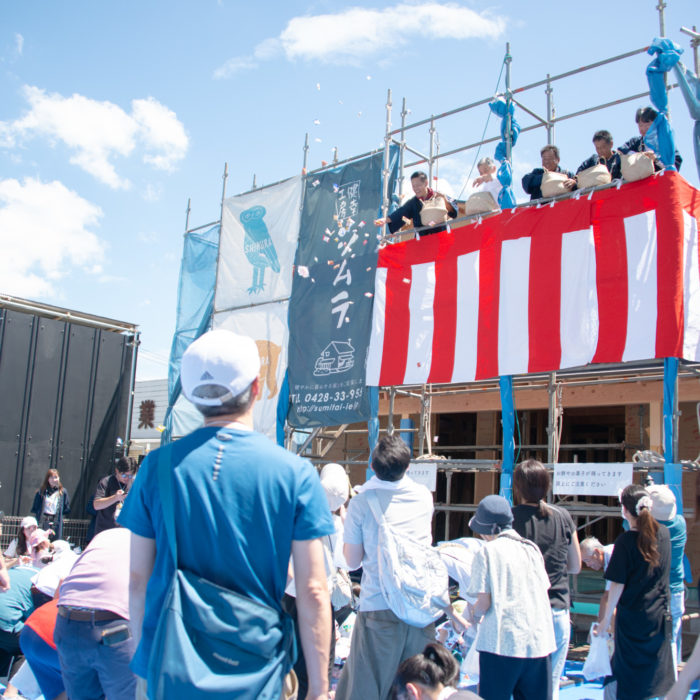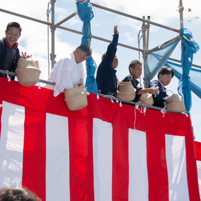 「そーれ」という掛け声とともにお客様の頭上からお餅やお菓子が舞っていきます。