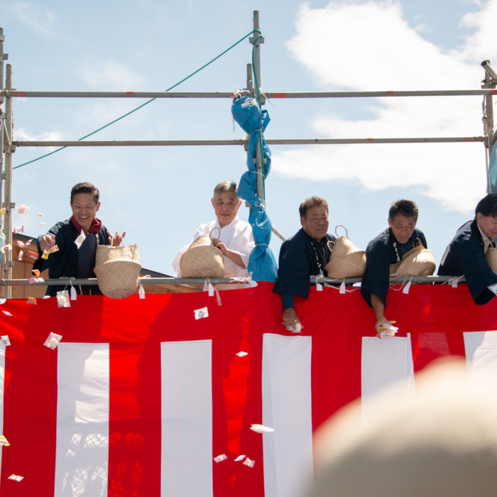 前方には小さなお子様たちが袋をもってお餅やお菓子まきに備えています。