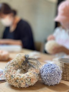 みなさん、もくもくと布リースを作っていきます。この集中した時間がストレス発散になるんですよね。わかります!ワタシもやりたいwww