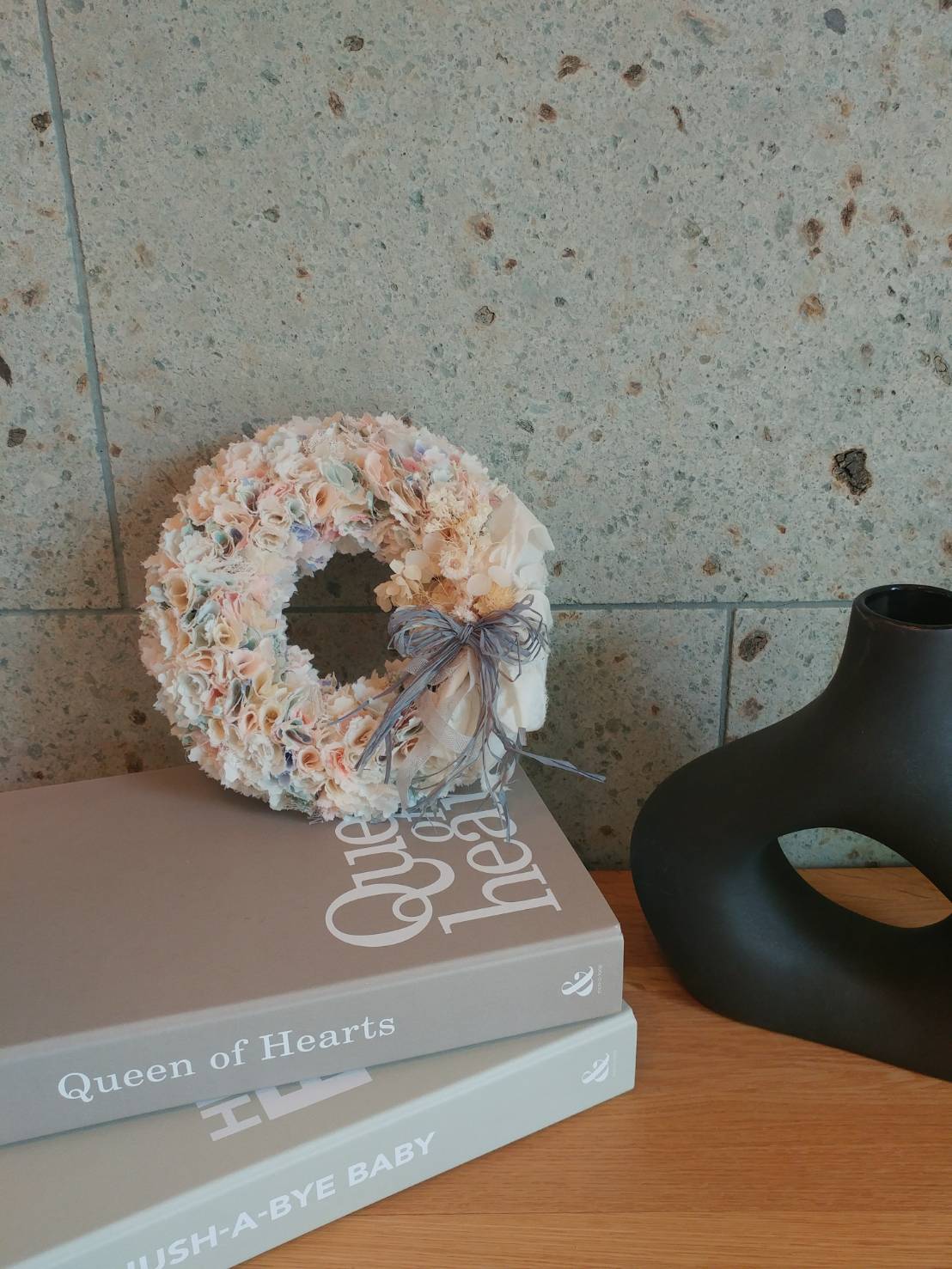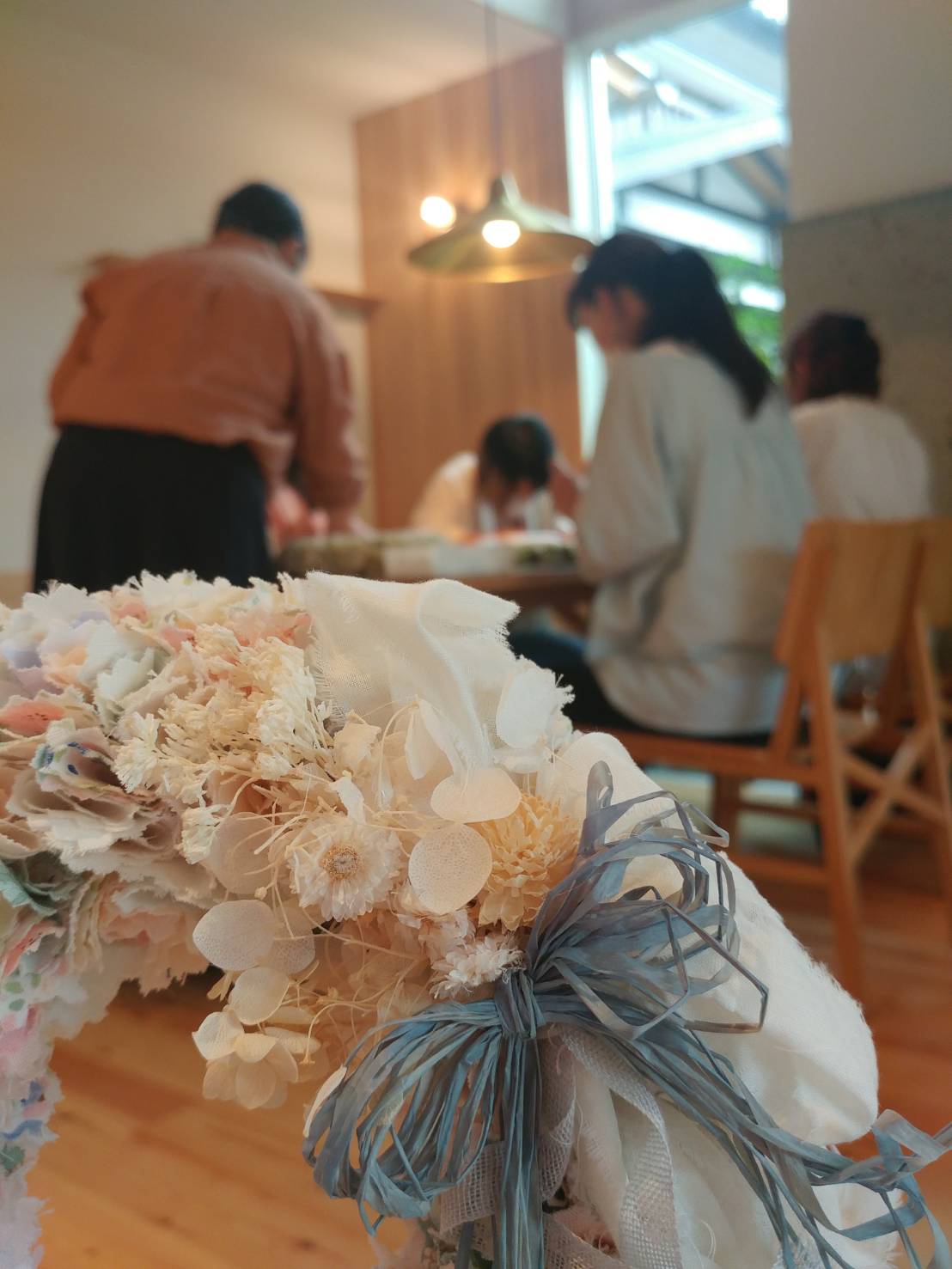 最後にドライフラワーやリボンなどの飾りをグルーガンでつけます。