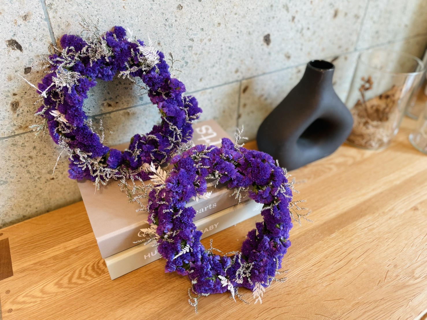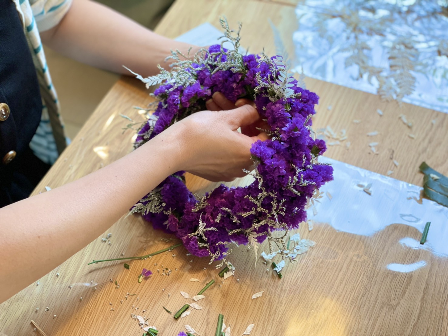 本日開催イベントは「幸せを運ぶ彩りリース~スターチスを使ったリースづくり」