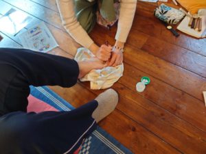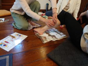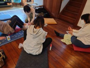 先生のレクチャーに合わせて自分で実際に足をもみ、