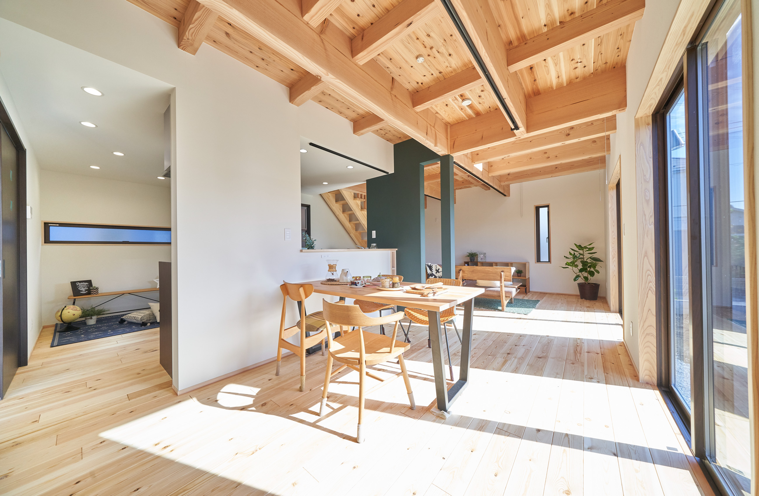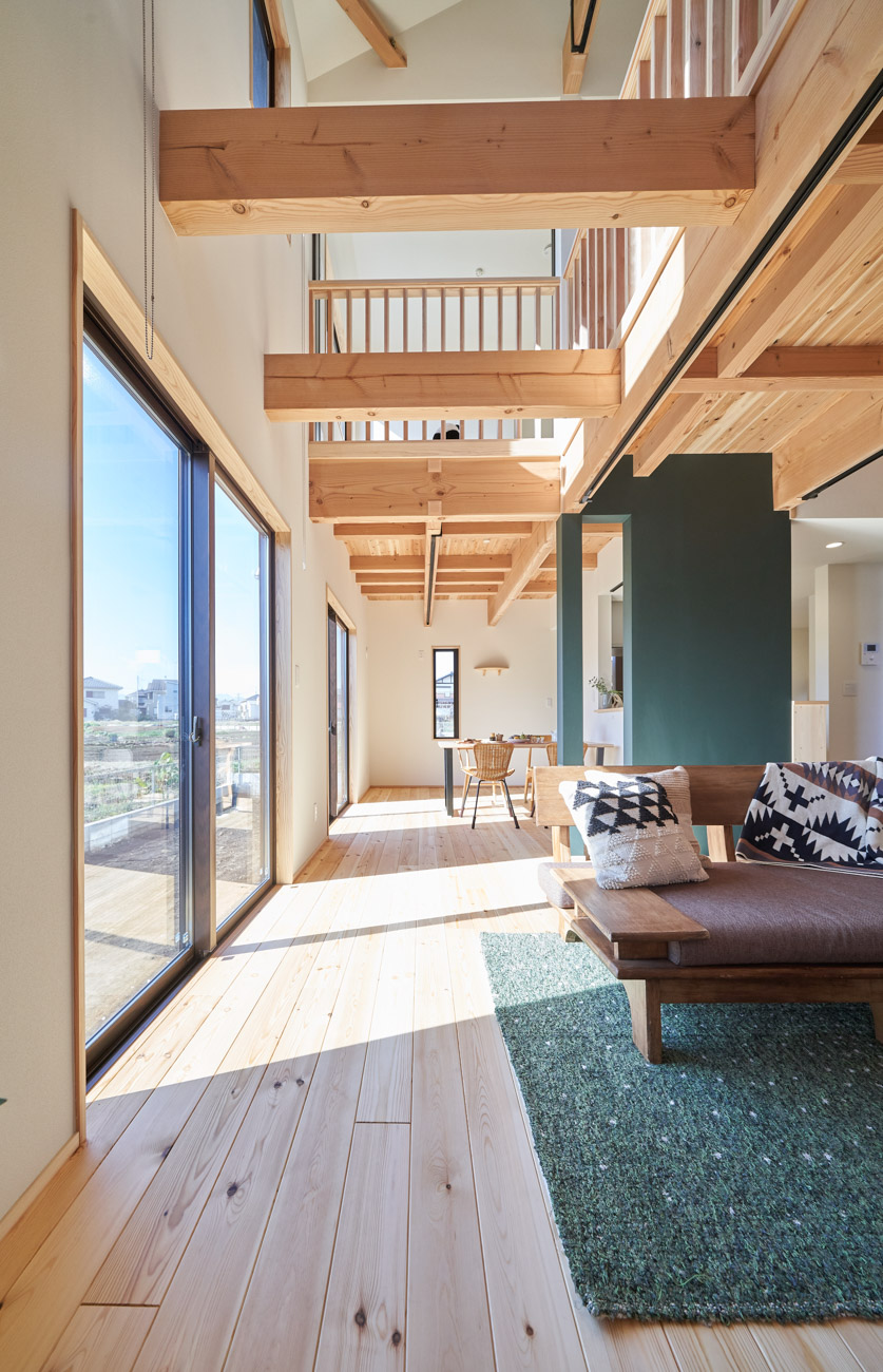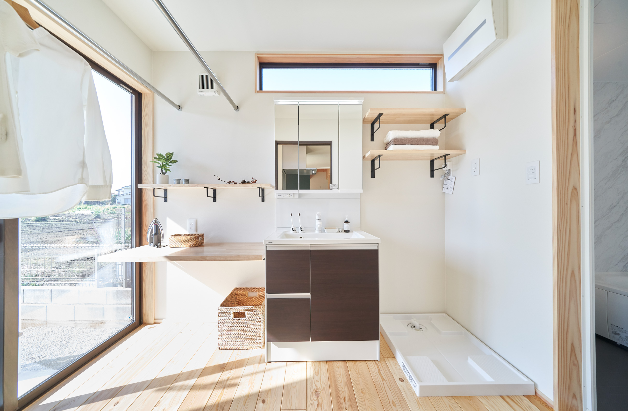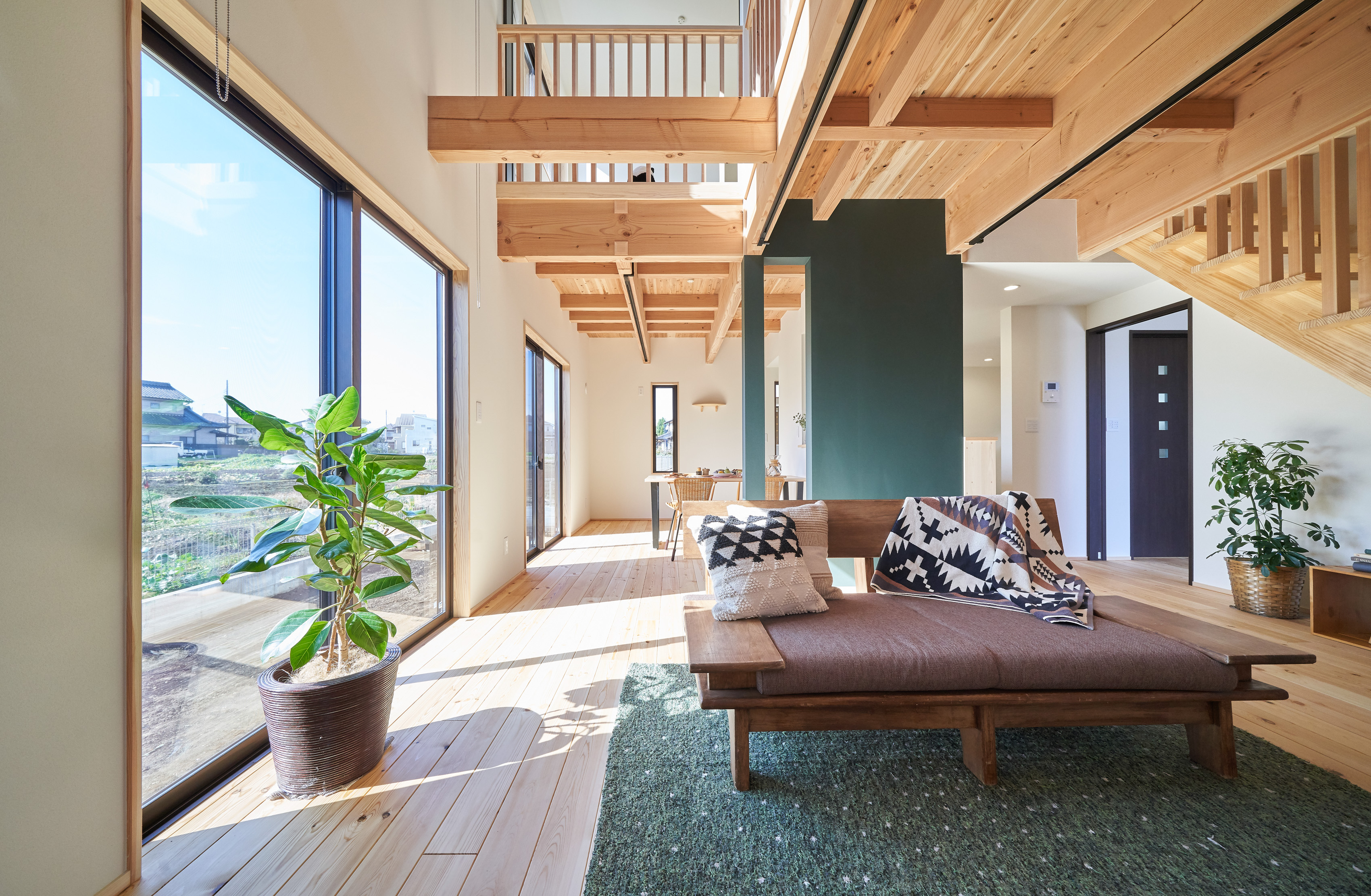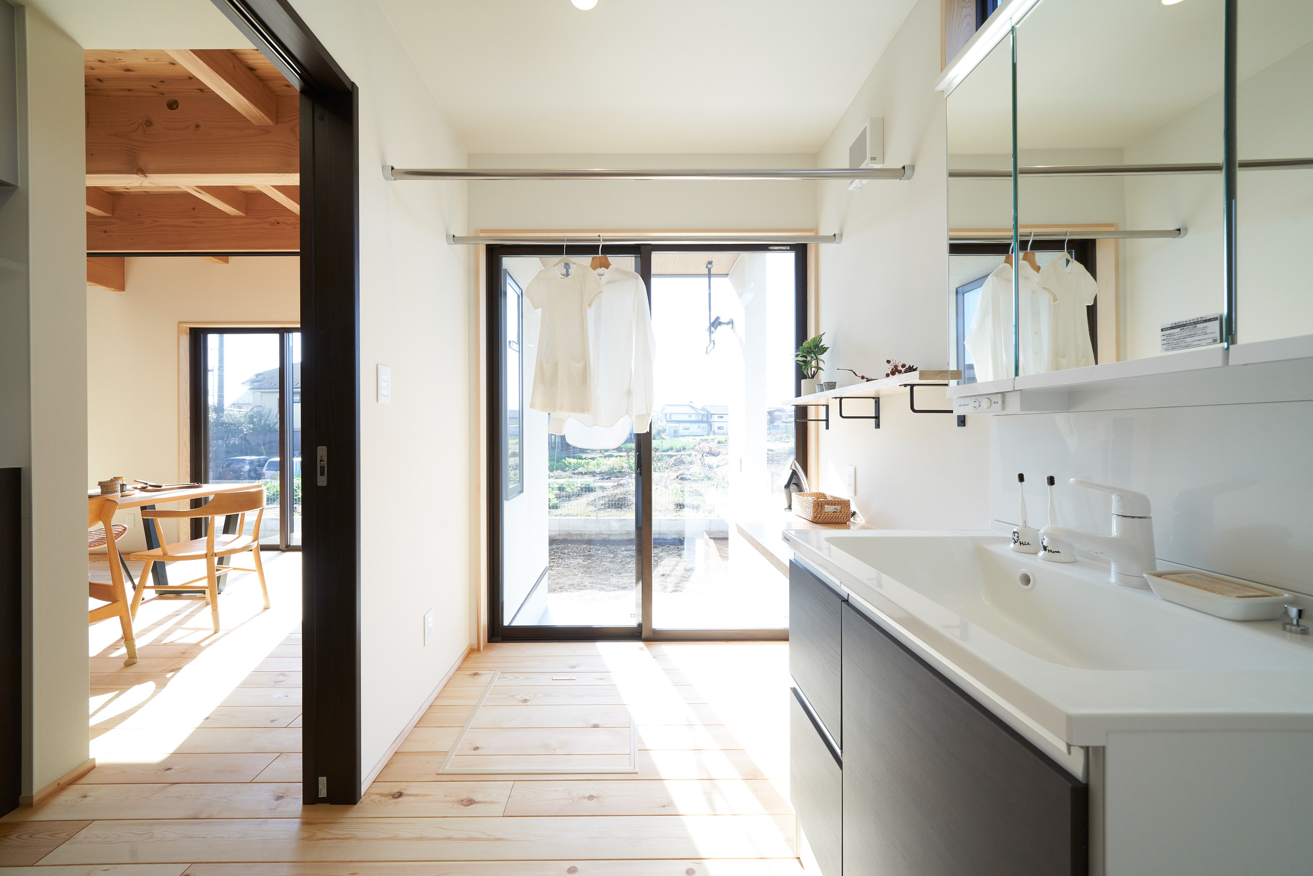 南側の開口部を多く設け、陽光をたっぷり取り込み、風の通りを邪魔することのないプランニングで室内はいつも心地よい空気に包まれます。吹き抜けで上下階はつながり、ランドラースペースや回遊動線で暮らしやすさは抜群。広さを体感できる開放的なお住まいです。 1F 広々明るい吹き抜けリビング 使いやすいランドリースペース 2F 吹抜けで繋がるファミリースペース