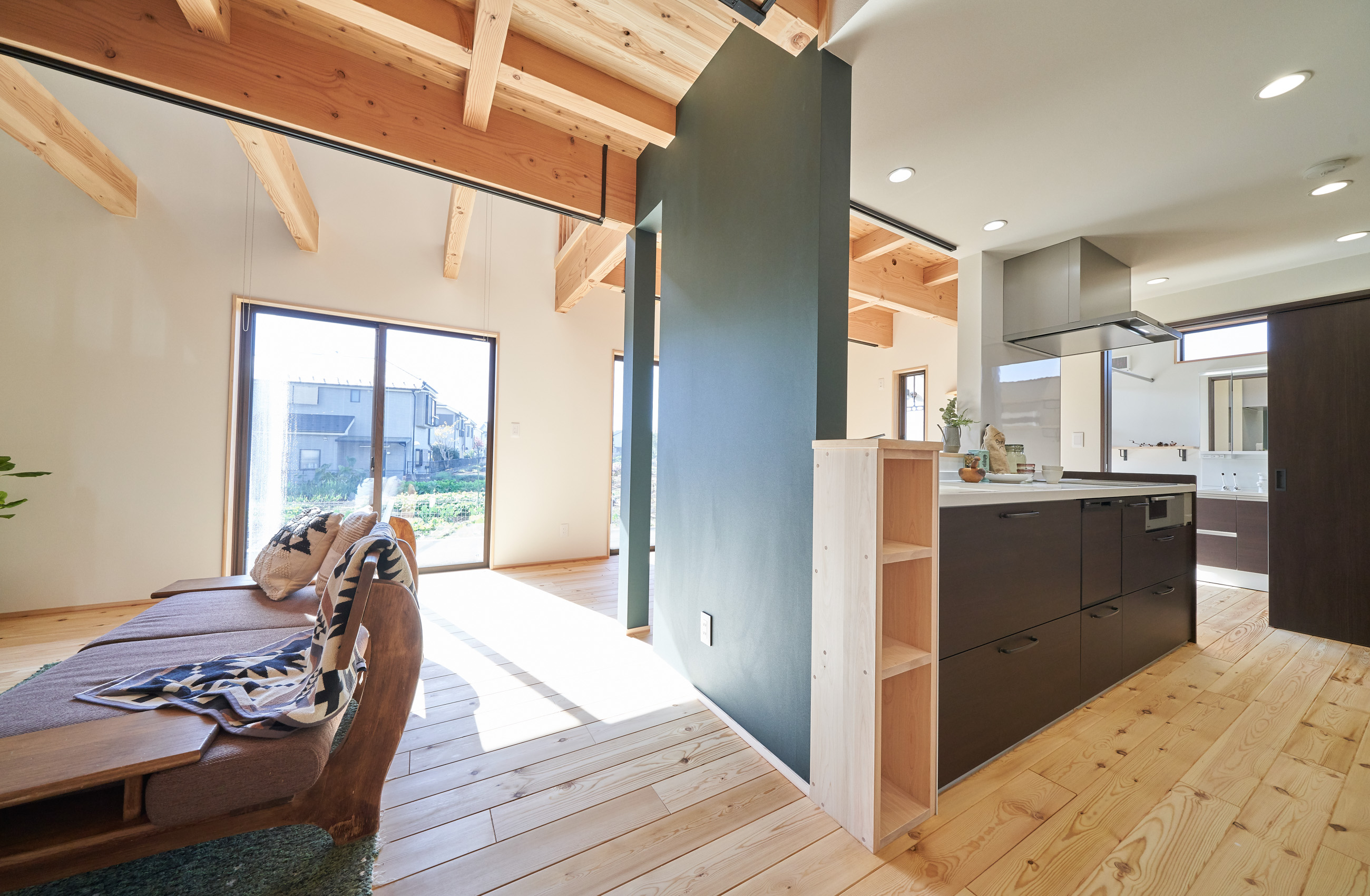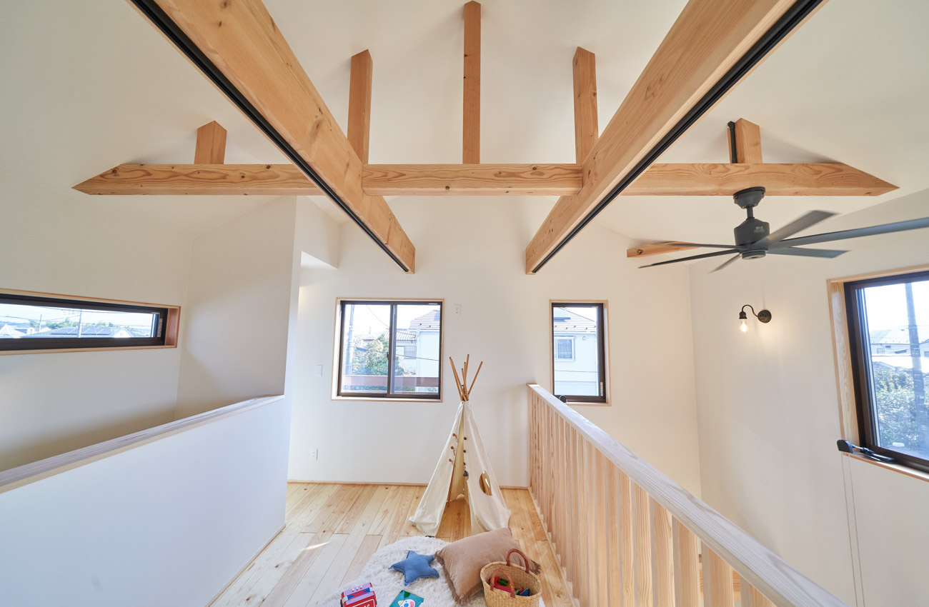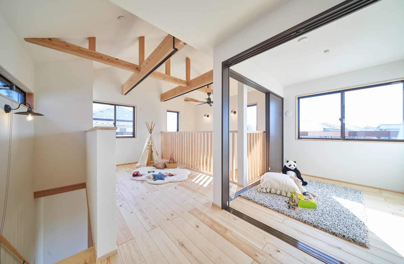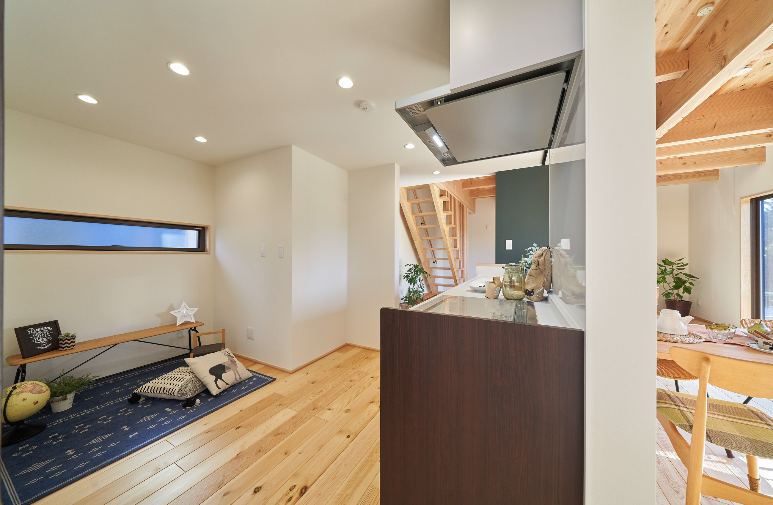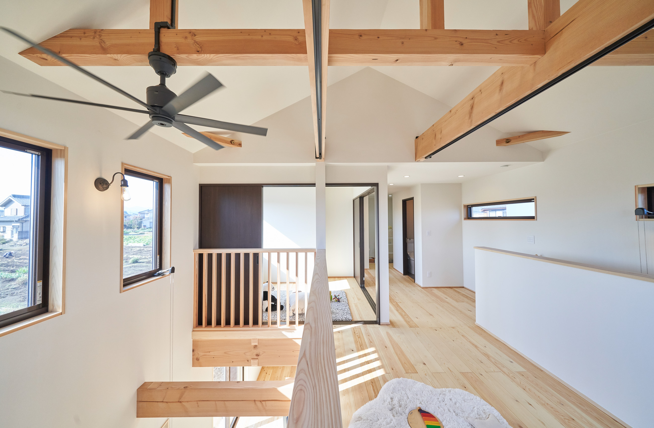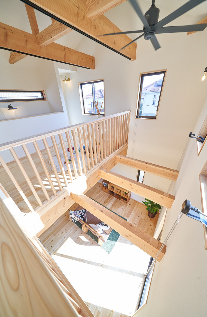 南側の開口部を多く設け、陽光をたっぷり取り込み、風の通りを邪魔することのないプランニングで室内はいつも心地よい空気に包まれます。吹き抜けで上下階はつながり、ランドラースペースや回遊動線で暮らしやすさは抜群。広さを体感できる開放的なお住まいです。 1F 広々明るい吹き抜けリビング 使いやすいランドリースペース 2F 吹抜けで繋がるファミリースペース