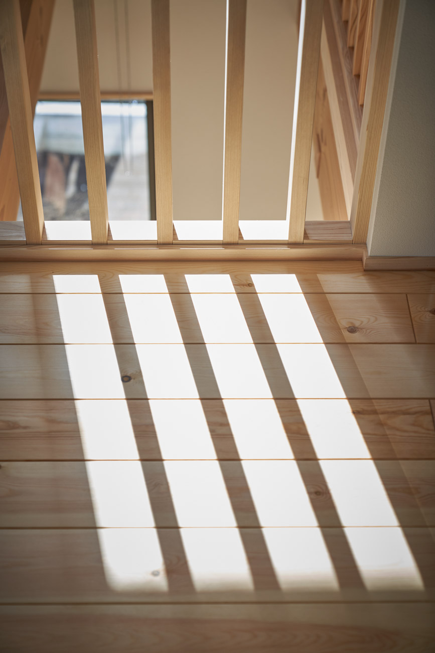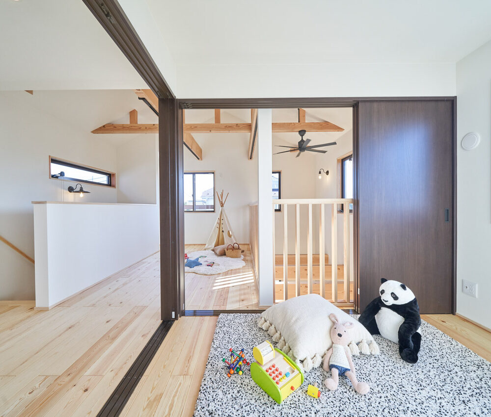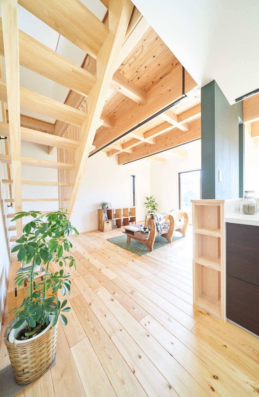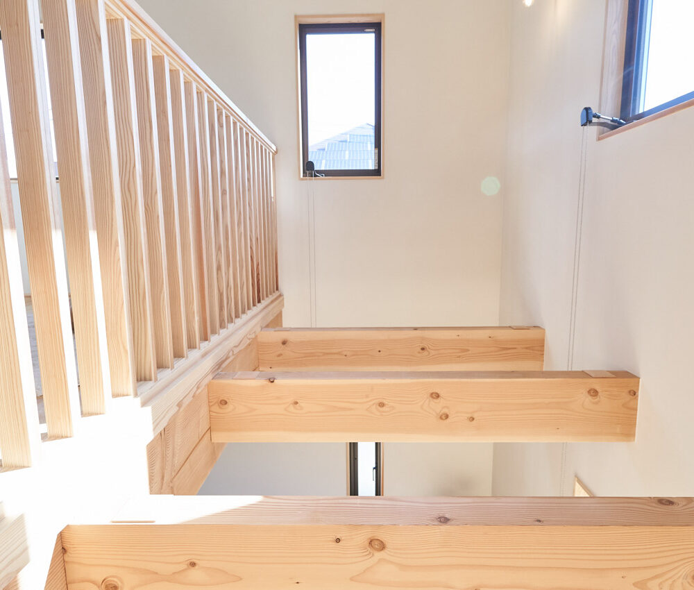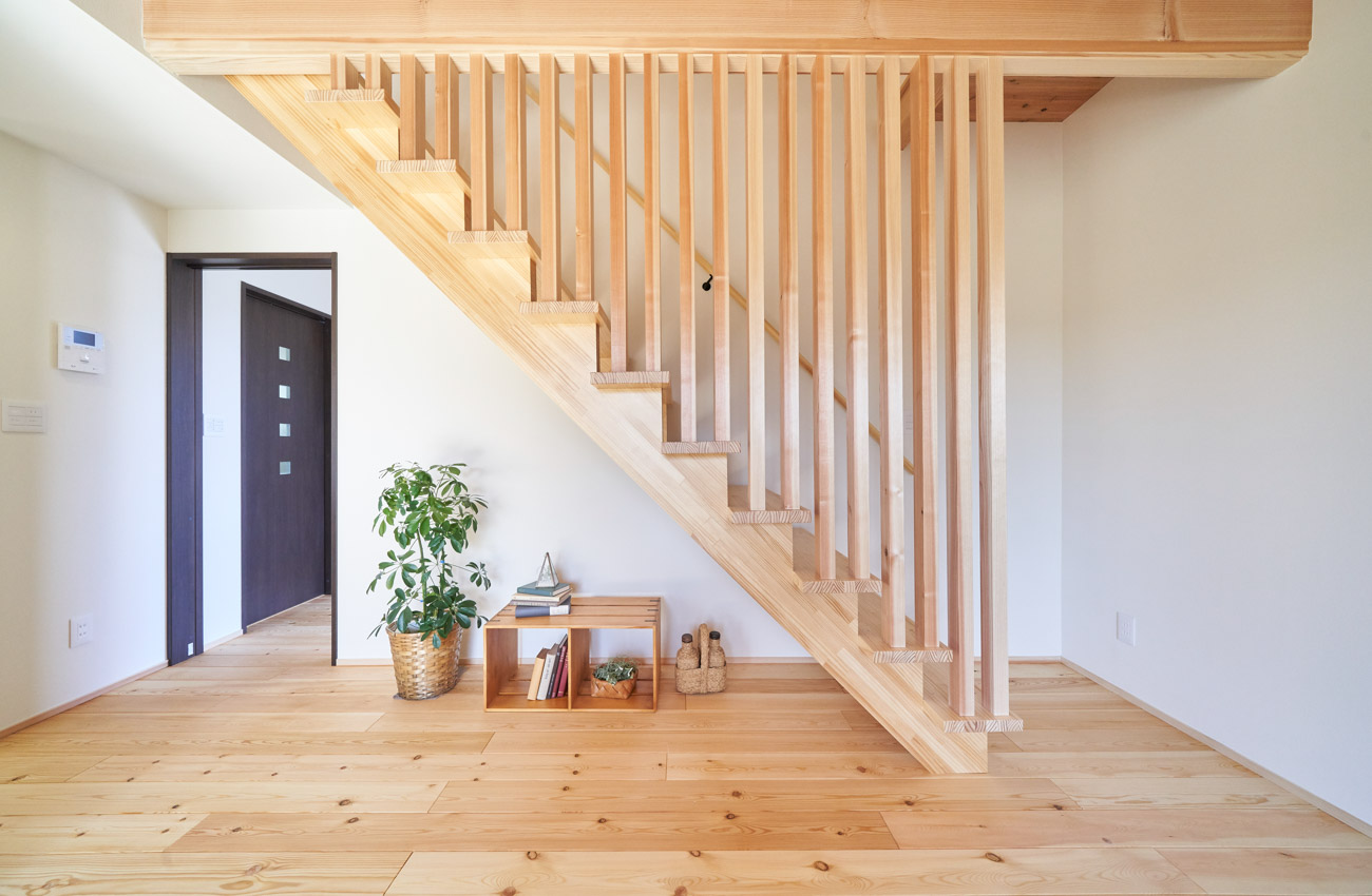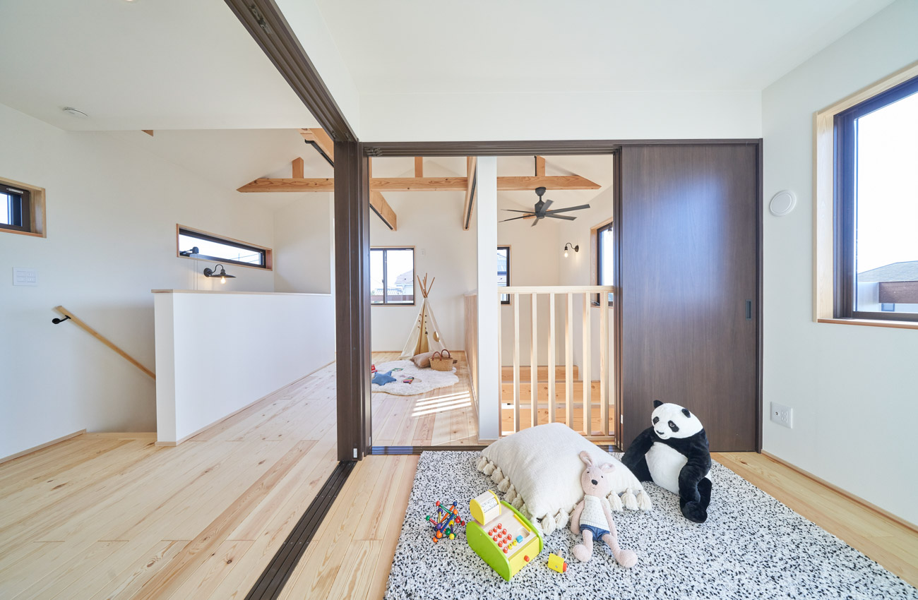 南側の開口部を多く設け、陽光をたっぷり取り込み、風の通りを邪魔することのないプランニングで室内はいつも心地よい空気に包まれます。吹き抜けで上下階はつながり、ランドラースペースや回遊動線で暮らしやすさは抜群。広さを体感できる開放的なお住まいです。 1F 広々明るい吹き抜けリビング 使いやすいランドリースペース 2F 吹抜けで繋がるファミリースペース
