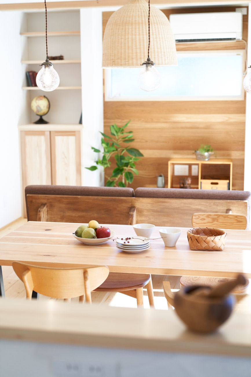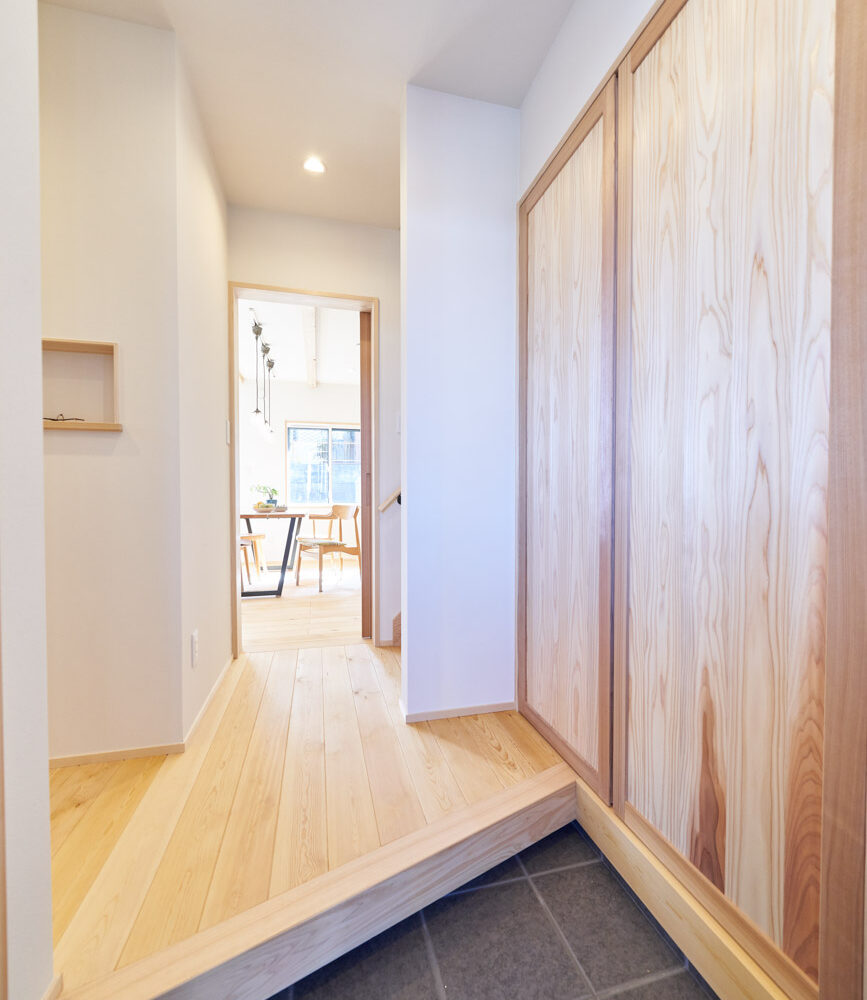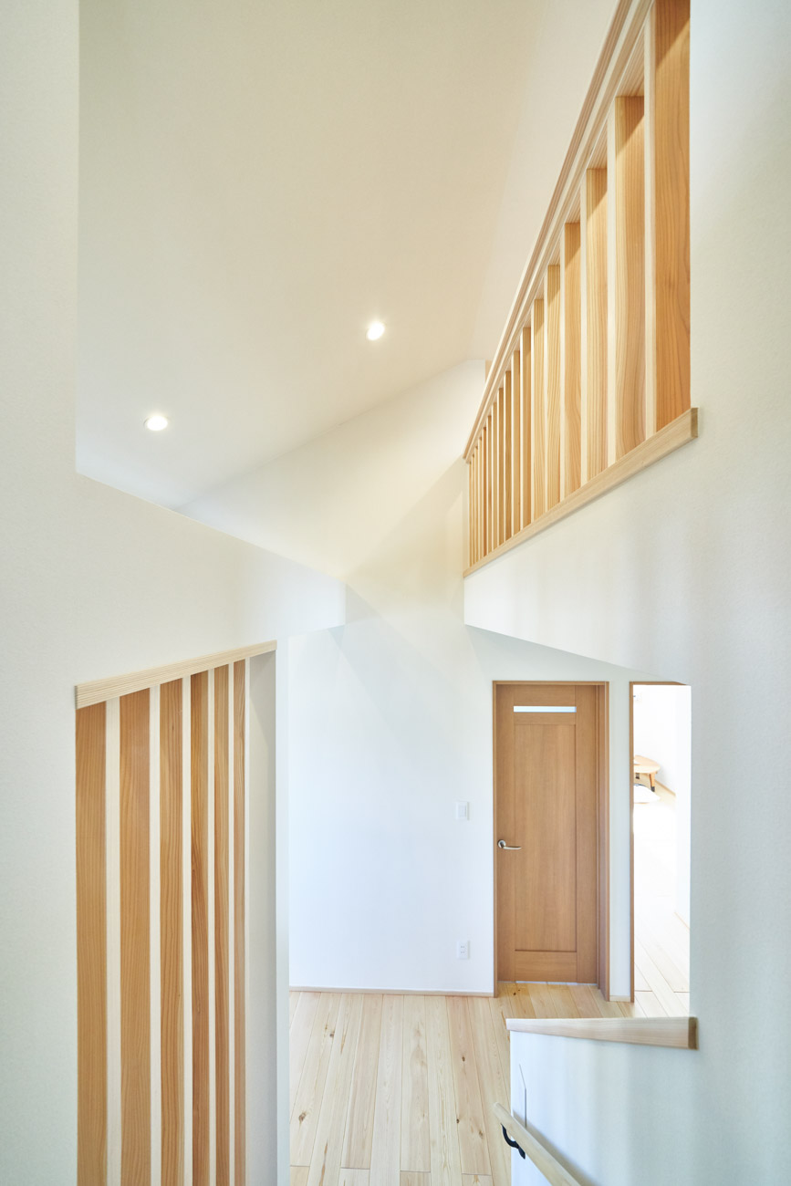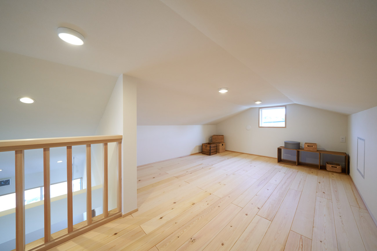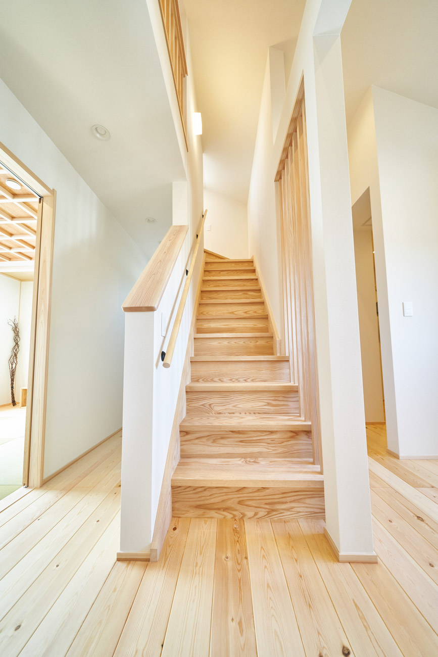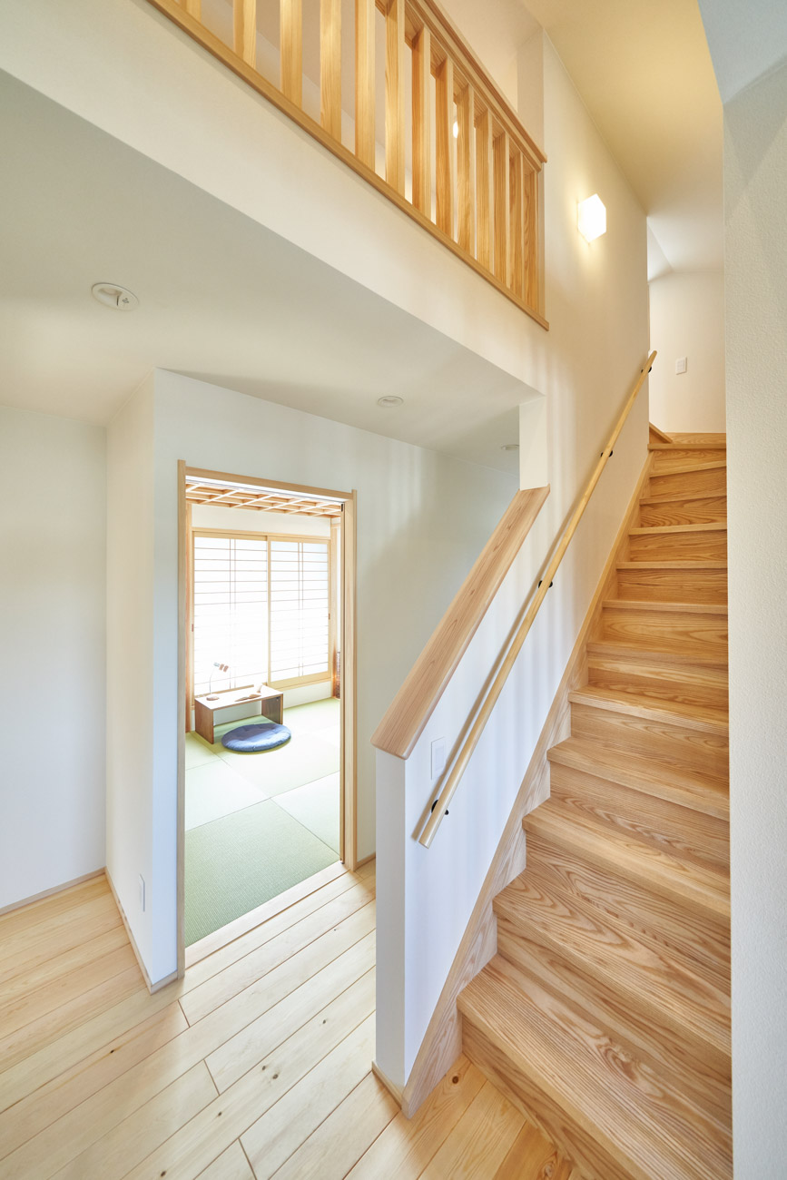 お住まいの建て直しをされた建主様ご一家。これまでの暮らしで不便だった部分など、たくさんお話を伺いました。無駄を省き、ご希望を上手に描いた暮らしやすいプランニング。無垢の床や建具、漆喰壁にオークのアクセントウォールなど、一つひとつ丁寧に選んだ質の良い材たち。設計・材・工法すべてにこだわり、年月を重ねるごとに愛着の湧く、心地よい空間デザインのお住まいとなりました。 目線を遮らず、光を大きく取り込む 居心地よいリビング。 家族があつまる1階のリビング。南側の大きな掃き出し窓はお庭への出入りもしやすく室内への採光も抜群。目線を遮る壁などは配置せず、広さを体感できる居心地の良い空間デザインです。 一つひとつ質の良いものを選び、 ずっと愛せる場所をつくる。 造作建具や階段、アクセントウォールなど、目に肌に触れる随所に無垢のアイテムを採用。床や梁とともに、経年で優しく変化していく様をずっと楽しめる素材です。目にも心にもここち良くずっと愛せる場所となります。 2F 格天井の粋な和室 2階の主寝室は贅沢にしつらえた和室。格式高い無垢の格天井が畳と合間って日本人の落ち着く空間を演出。 適材適所の収納やライブラリースペースなど、 暮らしに合わせた設備 ご家族に合わせた個室、ロフトやパントリーなどの各所の収納、共有のライブラリースペース、外には広い下屋をもつ自転車置き場など暮らしに合わせた設備が動線上に上手に配置されています。 太陽光パネルやハイブリッド給湯器を設置し、エネルギーの再利用や効率化を。さらに「消費エネルギーの見える化&一元管理」が可能なHEMSシステムを導入。アプリで簡単に管理できるお住まいです。