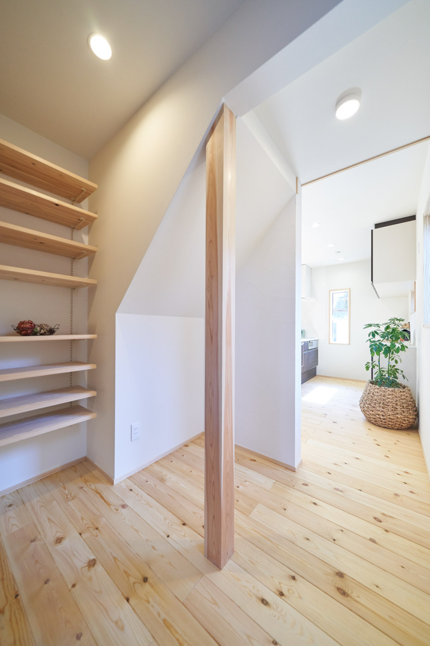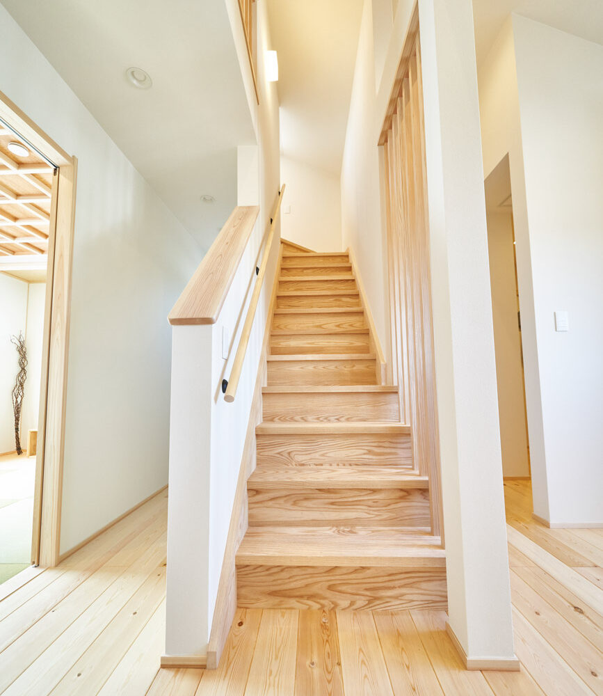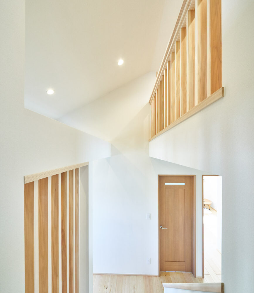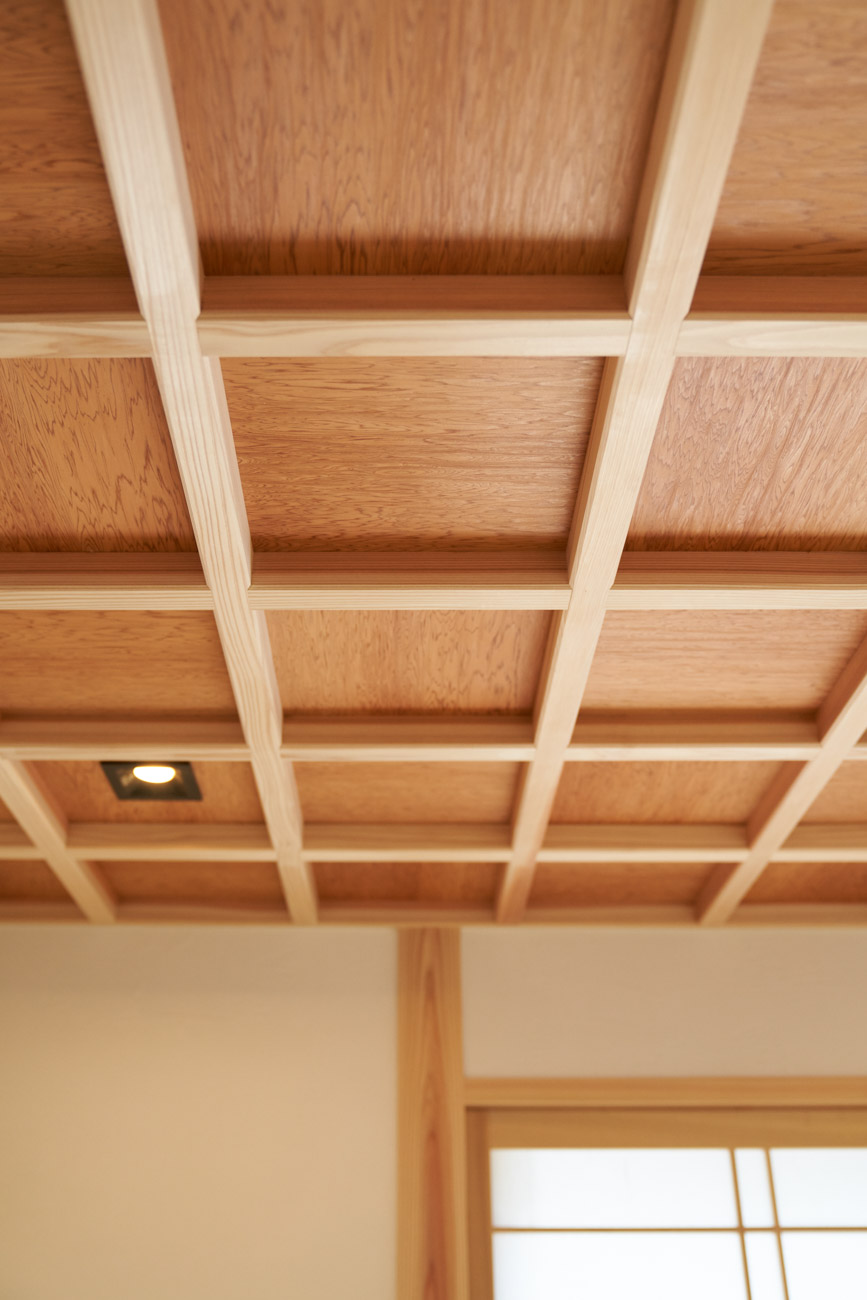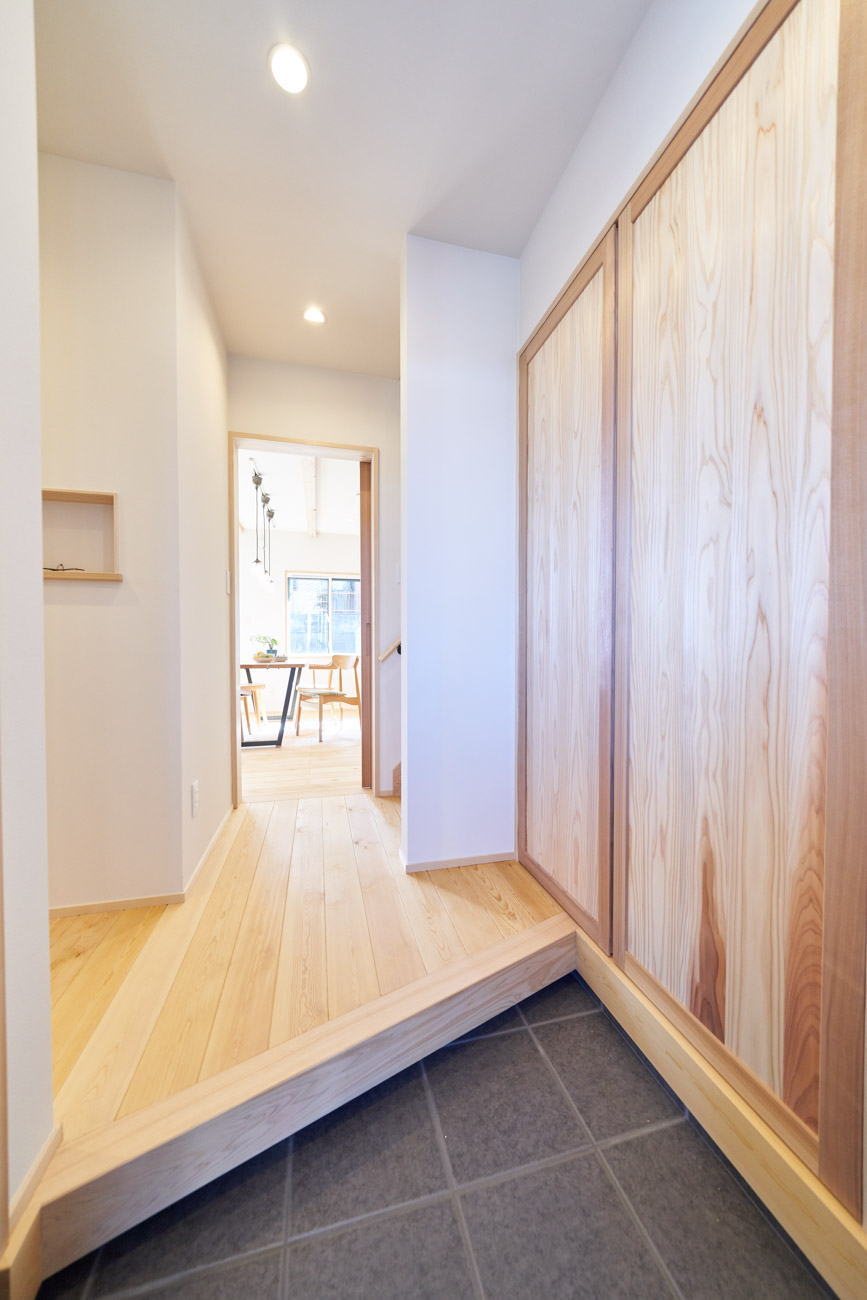 お住まいの建て直しをされた建主様ご一家。これまでの暮らしで不便だった部分など、たくさんお話を伺いました。無駄を省き、ご希望を上手に描いた暮らしやすいプランニング。無垢の床や建具、漆喰壁にオークのアクセントウォールなど、一つひとつ丁寧に選んだ質の良い材たち。設計・材・工法すべてにこだわり、年月を重ねるごとに愛着の湧く、心地よい空間デザインのお住まいとなりました。 目線を遮らず、光を大きく取り込む 居心地よいリビング。 家族があつまる1階のリビング。南側の大きな掃き出し窓はお庭への出入りもしやすく室内への採光も抜群。目線を遮る壁などは配置せず、広さを体感できる居心地の良い空間デザインです。 一つひとつ質の良いものを選び、 ずっと愛せる場所をつくる。 造作建具や階段、アクセントウォールなど、目に肌に触れる随所に無垢のアイテムを採用。床や梁とともに、経年で優しく変化していく様をずっと楽しめる素材です。目にも心にもここち良くずっと愛せる場所となります。 2F 格天井の粋な和室 2階の主寝室は贅沢にしつらえた和室。格式高い無垢の格天井が畳と合間って日本人の落ち着く空間を演出。 適材適所の収納やライブラリースペースなど、 暮らしに合わせた設備 ご家族に合わせた個室、ロフトやパントリーなどの各所の収納、共有のライブラリースペース、外には広い下屋をもつ自転車置き場など暮らしに合わせた設備が動線上に上手に配置されています。 太陽光パネルやハイブリッド給湯器を設置し、エネルギーの再利用や効率化を。さらに「消費エネルギーの見える化&一元管理」が可能なHEMSシステムを導入。アプリで簡単に管理できるお住まいです。