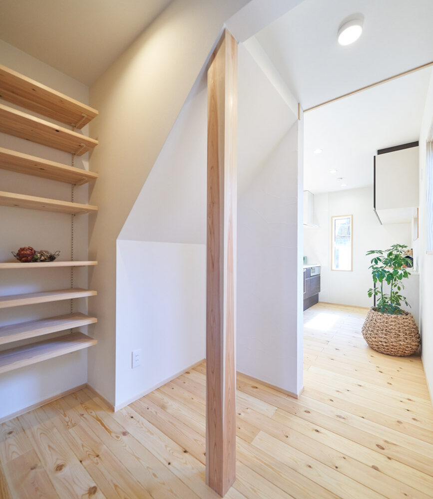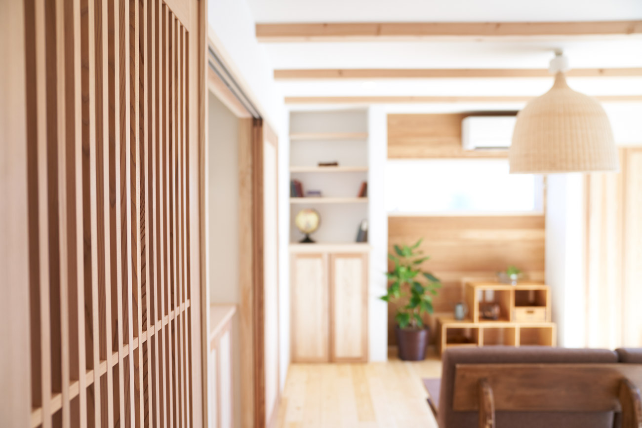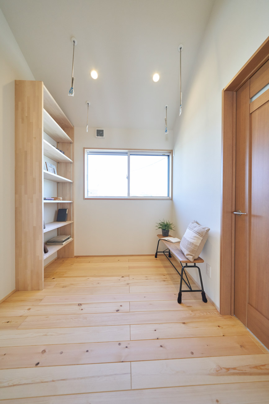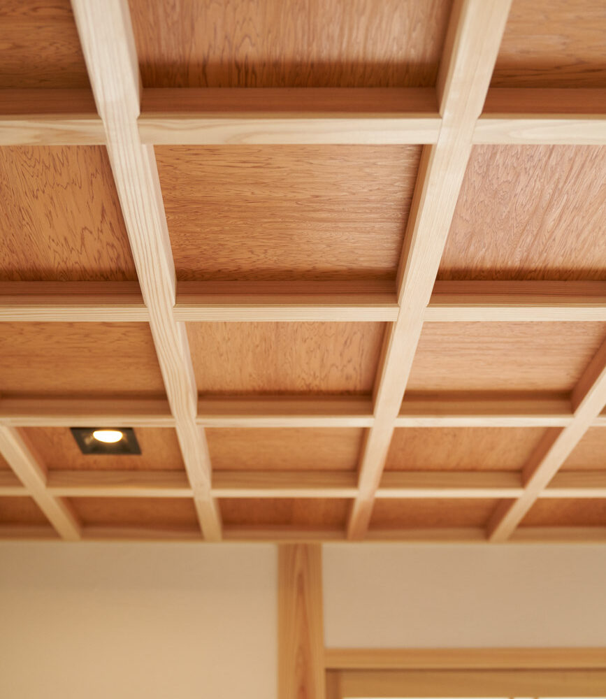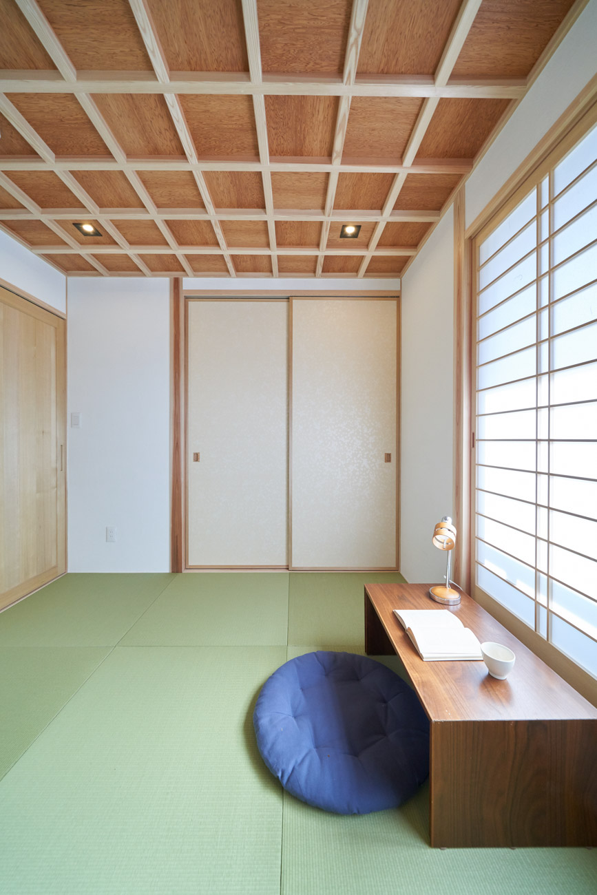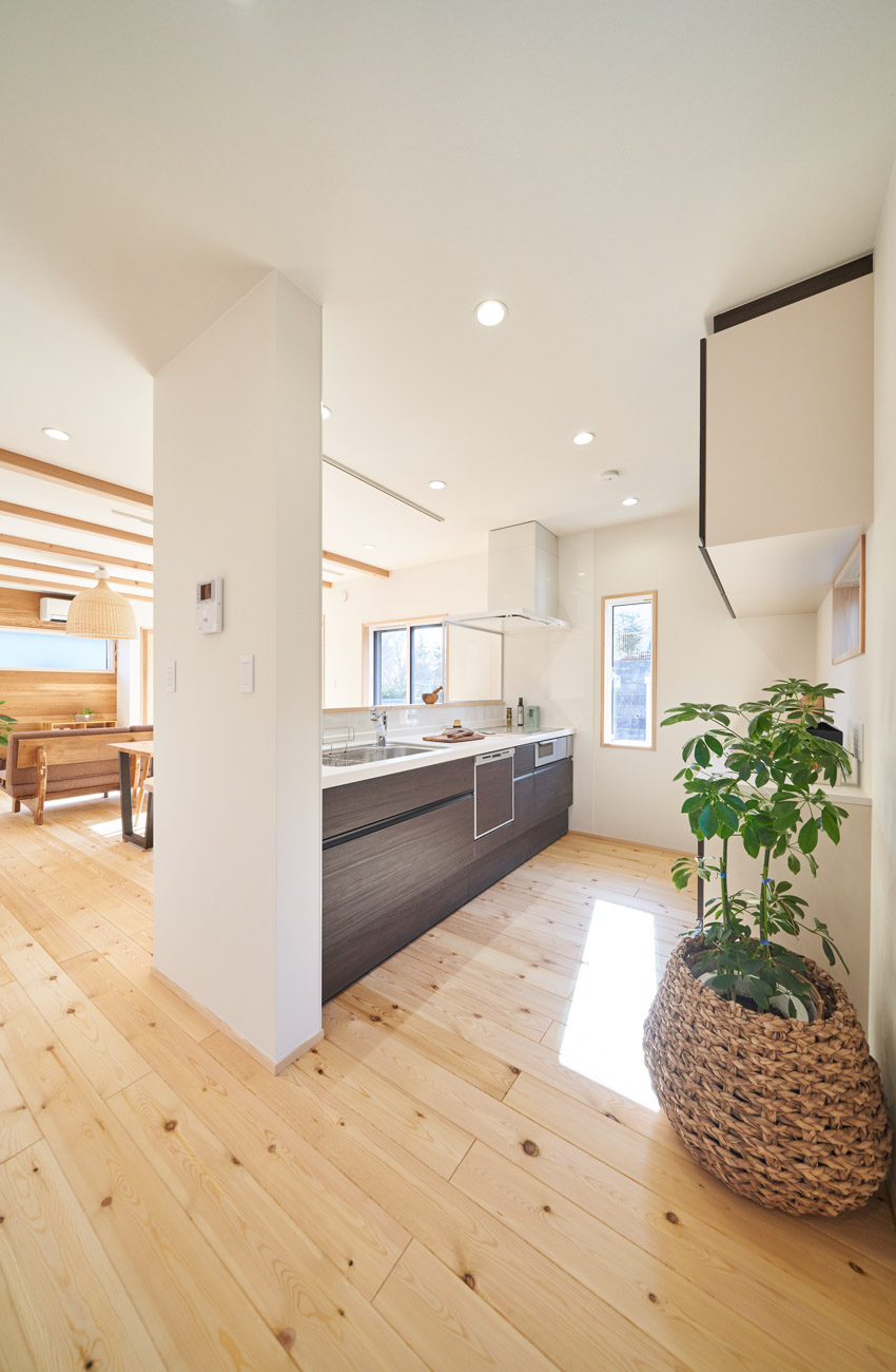 お住まいの建て直しをされた建主様ご一家。これまでの暮らしで不便だった部分など、たくさんお話を伺いました。無駄を省き、ご希望を上手に描いた暮らしやすいプランニング。無垢の床や建具、漆喰壁にオークのアクセントウォールなど、一つひとつ丁寧に選んだ質の良い材たち。設計・材・工法すべてにこだわり、年月を重ねるごとに愛着の湧く、心地よい空間デザインのお住まいとなりました。 目線を遮らず、光を大きく取り込む 居心地よいリビング。 家族があつまる1階のリビング。南側の大きな掃き出し窓はお庭への出入りもしやすく室内への採光も抜群。目線を遮る壁などは配置せず、広さを体感できる居心地の良い空間デザインです。 一つひとつ質の良いものを選び、 ずっと愛せる場所をつくる。 造作建具や階段、アクセントウォールなど、目に肌に触れる随所に無垢のアイテムを採用。床や梁とともに、経年で優しく変化していく様をずっと楽しめる素材です。目にも心にもここち良くずっと愛せる場所となります。 2F 格天井の粋な和室 2階の主寝室は贅沢にしつらえた和室。格式高い無垢の格天井が畳と合間って日本人の落ち着く空間を演出。 適材適所の収納やライブラリースペースなど、 暮らしに合わせた設備 ご家族に合わせた個室、ロフトやパントリーなどの各所の収納、共有のライブラリースペース、外には広い下屋をもつ自転車置き場など暮らしに合わせた設備が動線上に上手に配置されています。 太陽光パネルやハイブリッド給湯器を設置し、エネルギーの再利用や効率化を。さらに「消費エネルギーの見える化&一元管理」が可能なHEMSシステムを導入。アプリで簡単に管理できるお住まいです。