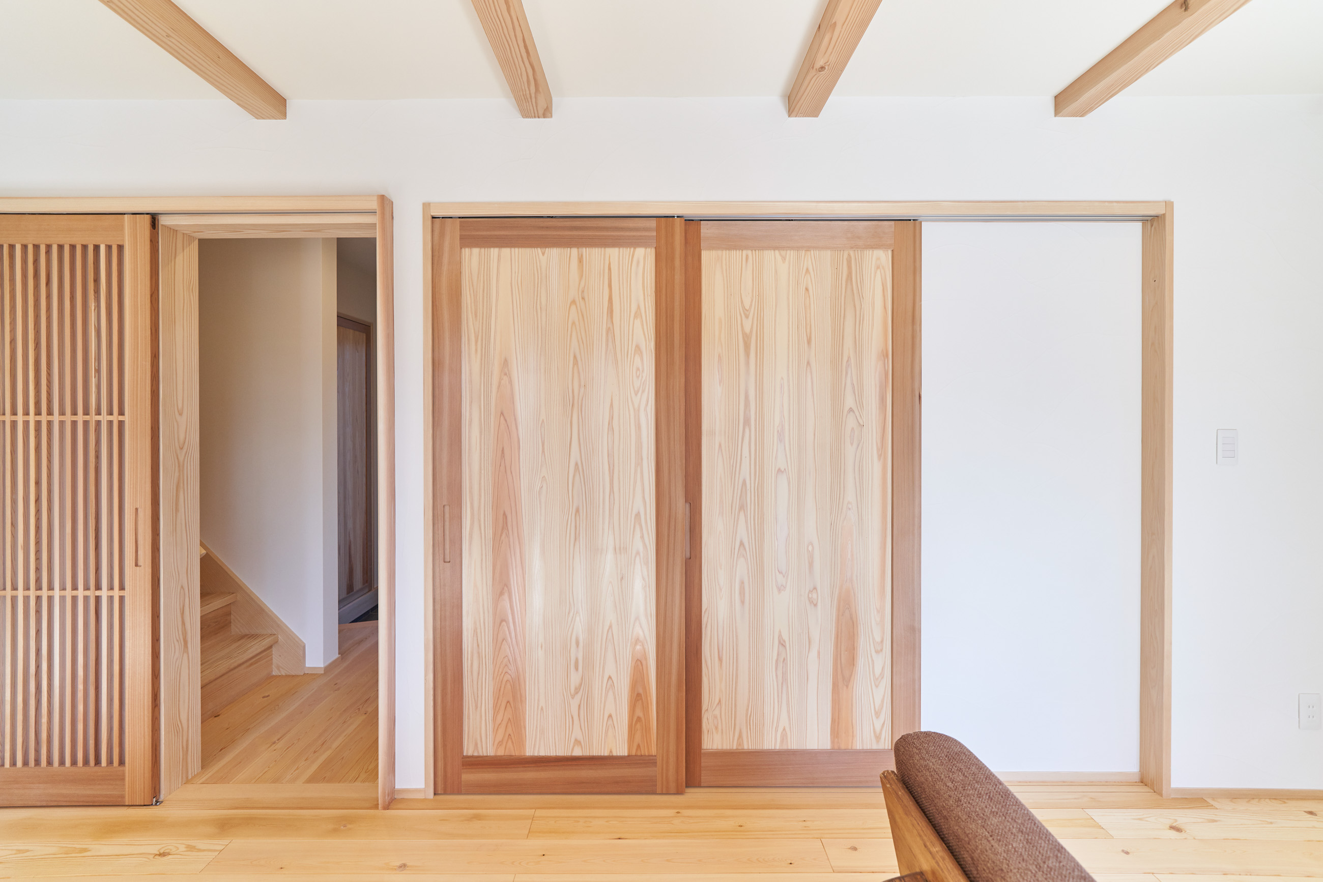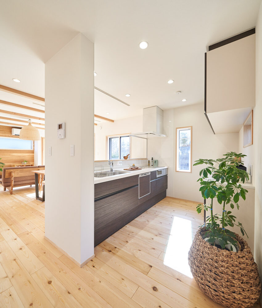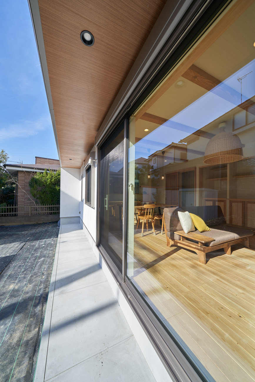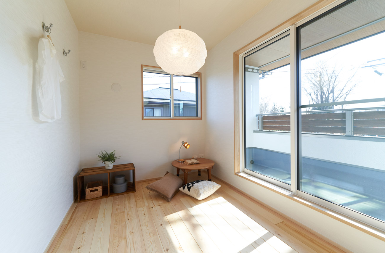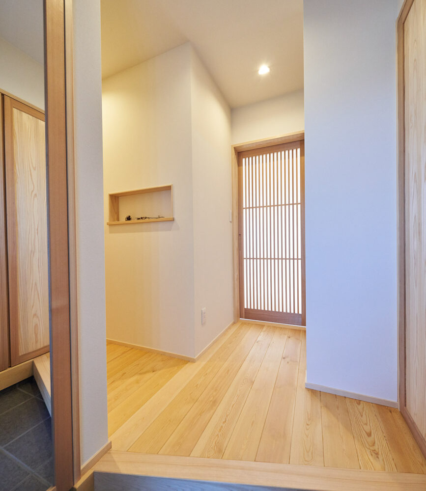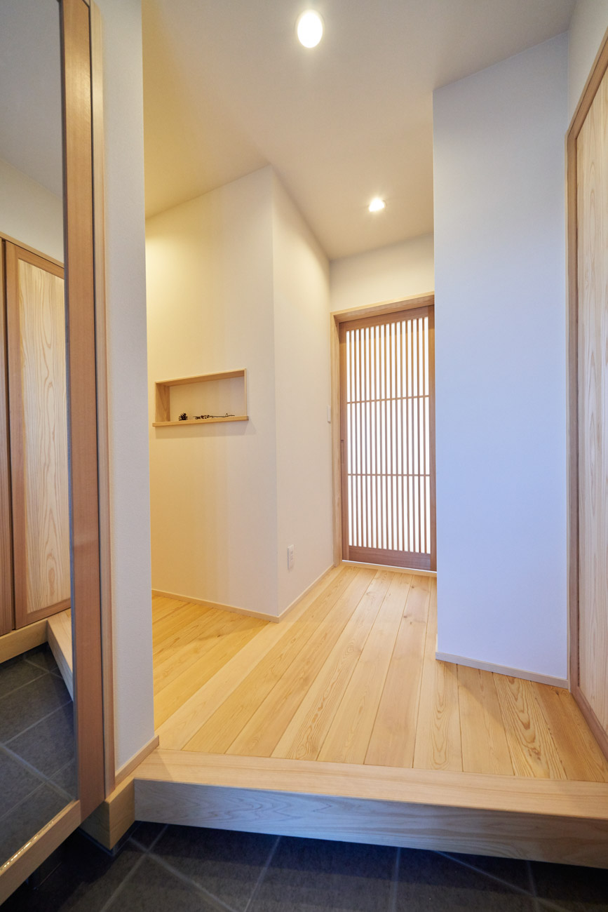お住まいの建て直しをされた建主様ご一家。これまでの暮らしで不便だった部分など、たくさんお話を伺いました。無駄を省き、ご希望を上手に描いた暮らしやすいプランニング。無垢の床や建具、漆喰壁にオークのアクセントウォールなど、一つひとつ丁寧に選んだ質の良い材たち。設計・材・工法すべてにこだわり、年月を重ねるごとに愛着の湧く、心地よい空間デザインのお住まいとなりました。 目線を遮らず、光を大きく取り込む 居心地よいリビング。 家族があつまる1階のリビング。南側の大きな掃き出し窓はお庭への出入りもしやすく室内への採光も抜群。目線を遮る壁などは配置せず、広さを体感できる居心地の良い空間デザインです。 一つひとつ質の良いものを選び、 ずっと愛せる場所をつくる。 造作建具や階段、アクセントウォールなど、目に肌に触れる随所に無垢のアイテムを採用。床や梁とともに、経年で優しく変化していく様をずっと楽しめる素材です。目にも心にもここち良くずっと愛せる場所となります。 2F 格天井の粋な和室 2階の主寝室は贅沢にしつらえた和室。格式高い無垢の格天井が畳と合間って日本人の落ち着く空間を演出。 適材適所の収納やライブラリースペースなど、 暮らしに合わせた設備 ご家族に合わせた個室、ロフトやパントリーなどの各所の収納、共有のライブラリースペース、外には広い下屋をもつ自転車置き場など暮らしに合わせた設備が動線上に上手に配置されています。 太陽光パネルやハイブリッド給湯器を設置し、エネルギーの再利用や効率化を。さらに「消費エネルギーの見える化&一元管理」が可能なHEMSシステムを導入。アプリで簡単に管理できるお住まいです。