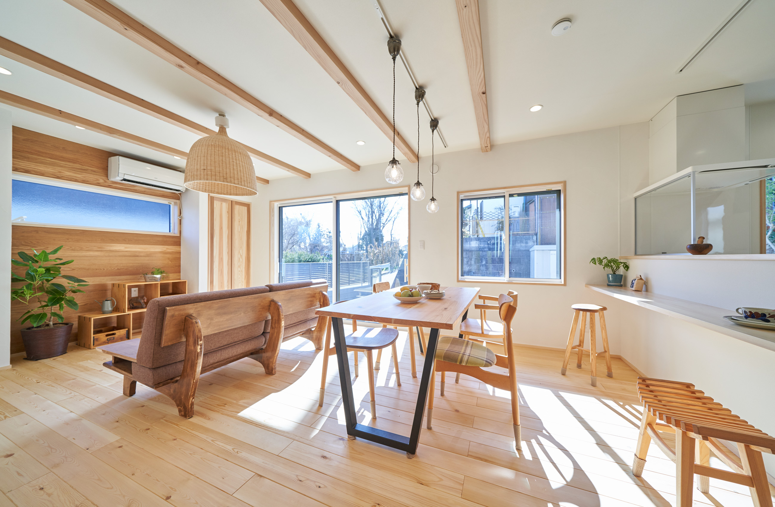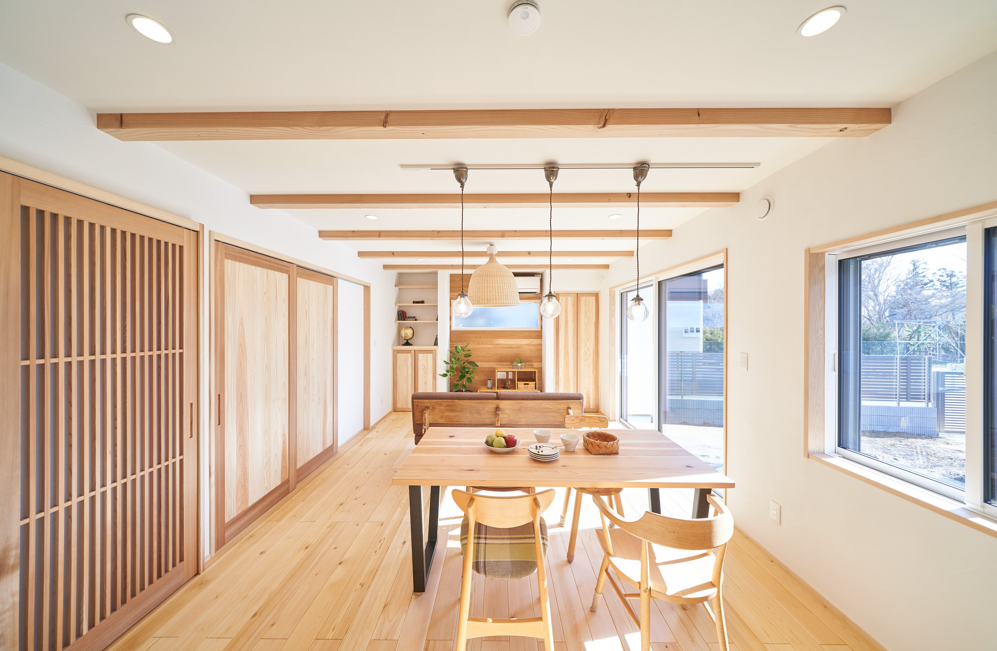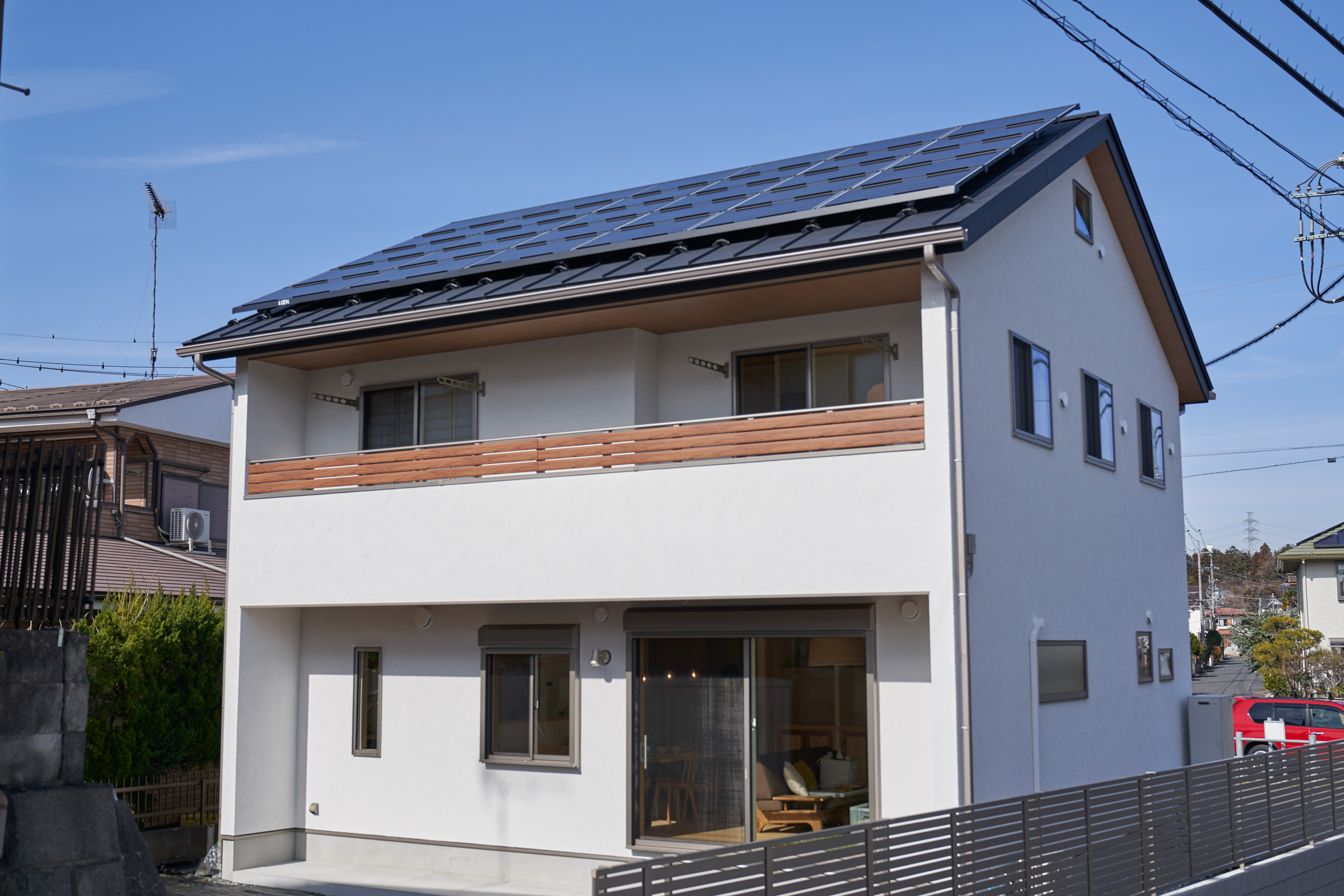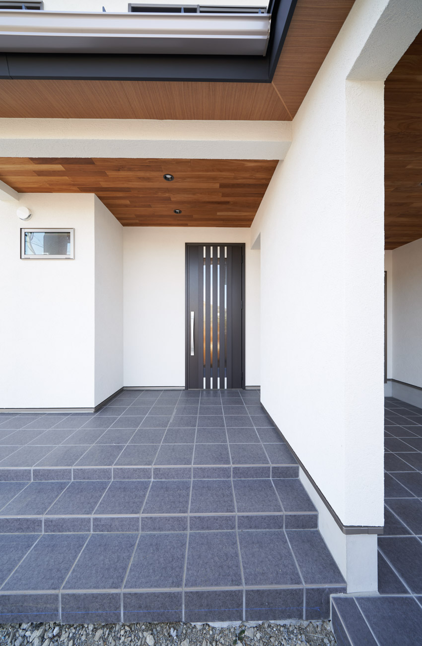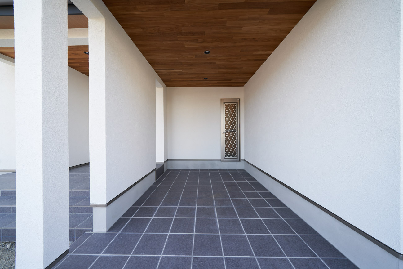 お住まいの建て直しをされた建主様ご一家。これまでの暮らしで不便だった部分など、たくさんお話を伺いました。無駄を省き、ご希望を上手に描いた暮らしやすいプランニング。無垢の床や建具、漆喰壁にオークのアクセントウォールなど、一つひとつ丁寧に選んだ質の良い材たち。設計・材・工法すべてにこだわり、年月を重ねるごとに愛着の湧く、心地よい空間デザインのお住まいとなりました。 目線を遮らず、光を大きく取り込む 居心地よいリビング。 家族があつまる1階のリビング。南側の大きな掃き出し窓はお庭への出入りもしやすく室内への採光も抜群。目線を遮る壁などは配置せず、広さを体感できる居心地の良い空間デザインです。 一つひとつ質の良いものを選び、 ずっと愛せる場所をつくる。 造作建具や階段、アクセントウォールなど、目に肌に触れる随所に無垢のアイテムを採用。床や梁とともに、経年で優しく変化していく様をずっと楽しめる素材です。目にも心にもここち良くずっと愛せる場所となります。 2F 格天井の粋な和室 2階の主寝室は贅沢にしつらえた和室。格式高い無垢の格天井が畳と合間って日本人の落ち着く空間を演出。 適材適所の収納やライブラリースペースなど、 暮らしに合わせた設備 ご家族に合わせた個室、ロフトやパントリーなどの各所の収納、共有のライブラリースペース、外には広い下屋をもつ自転車置き場など暮らしに合わせた設備が動線上に上手に配置されています。 太陽光パネルやハイブリッド給湯器を設置し、エネルギーの再利用や効率化を。さらに「消費エネルギーの見える化&一元管理」が可能なHEMSシステムを導入。アプリで簡単に管理できるお住まいです。