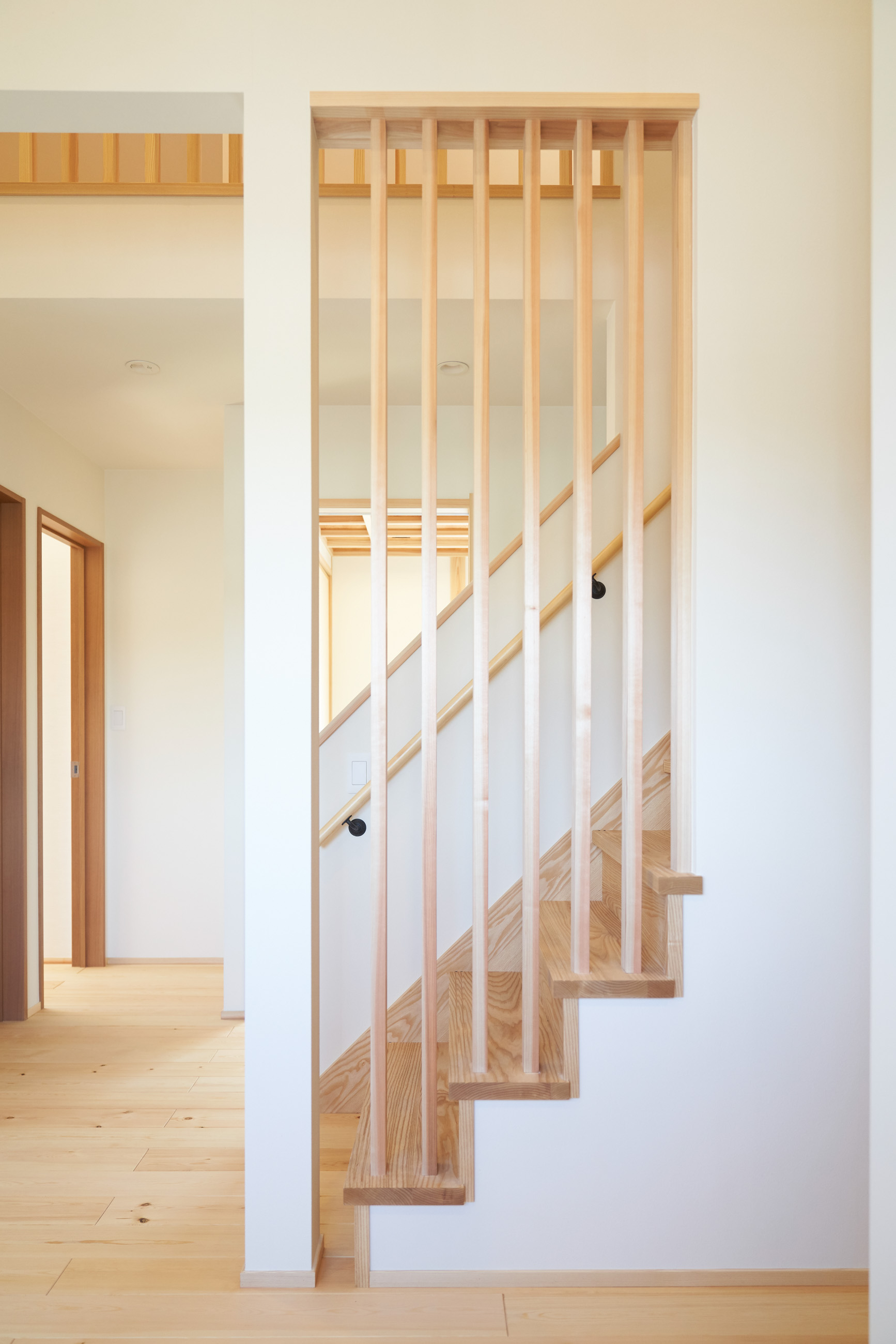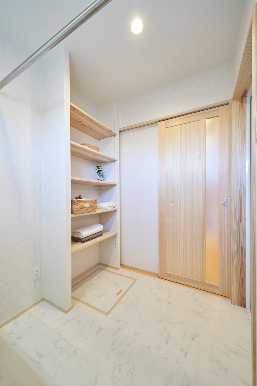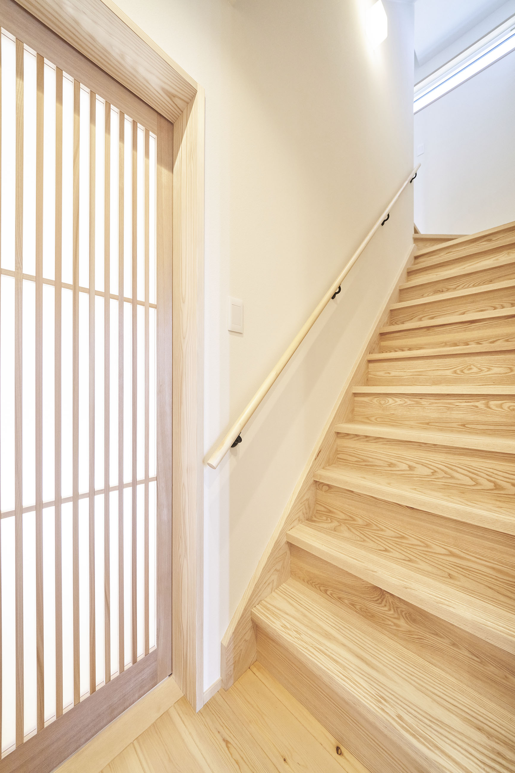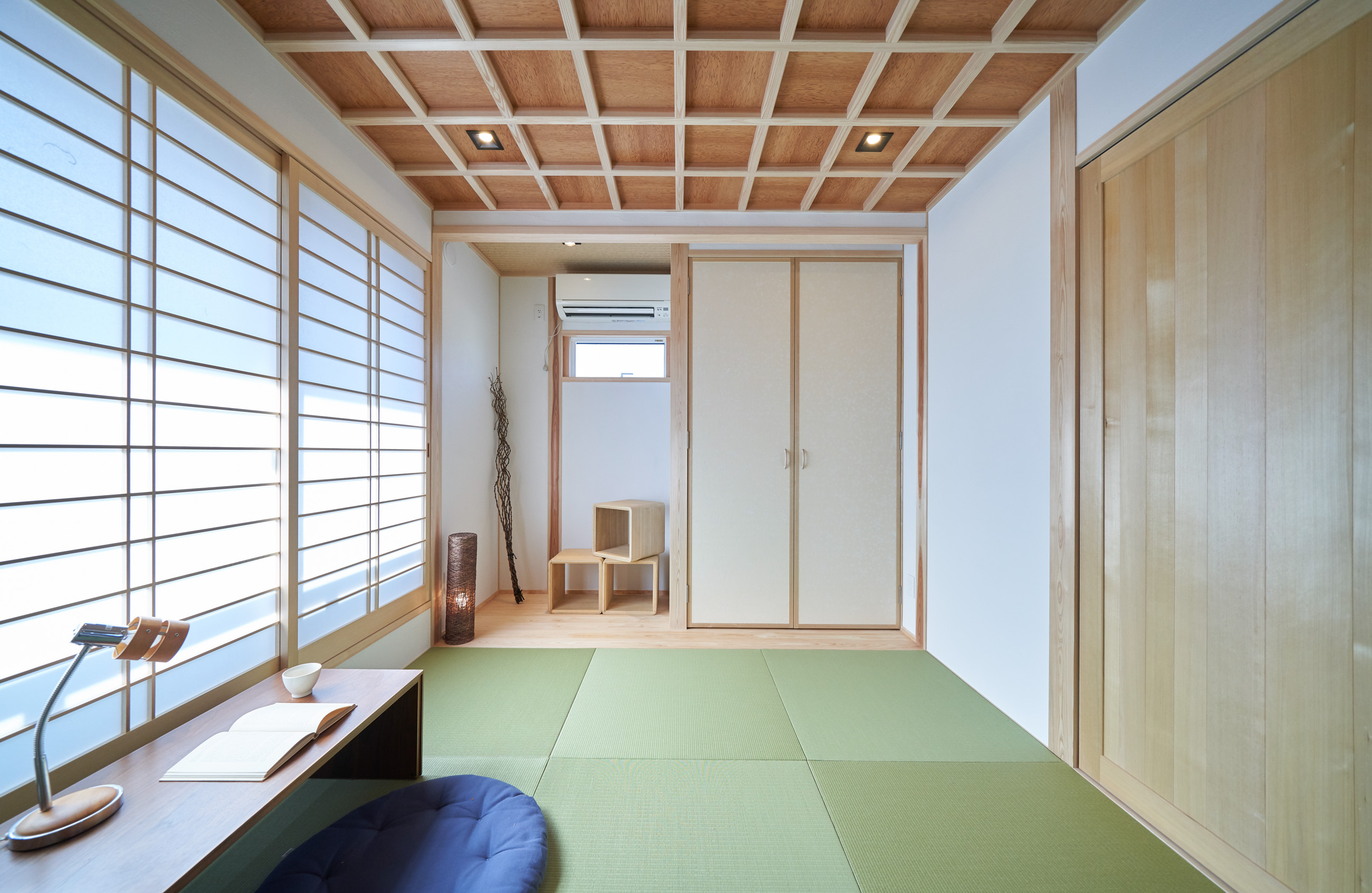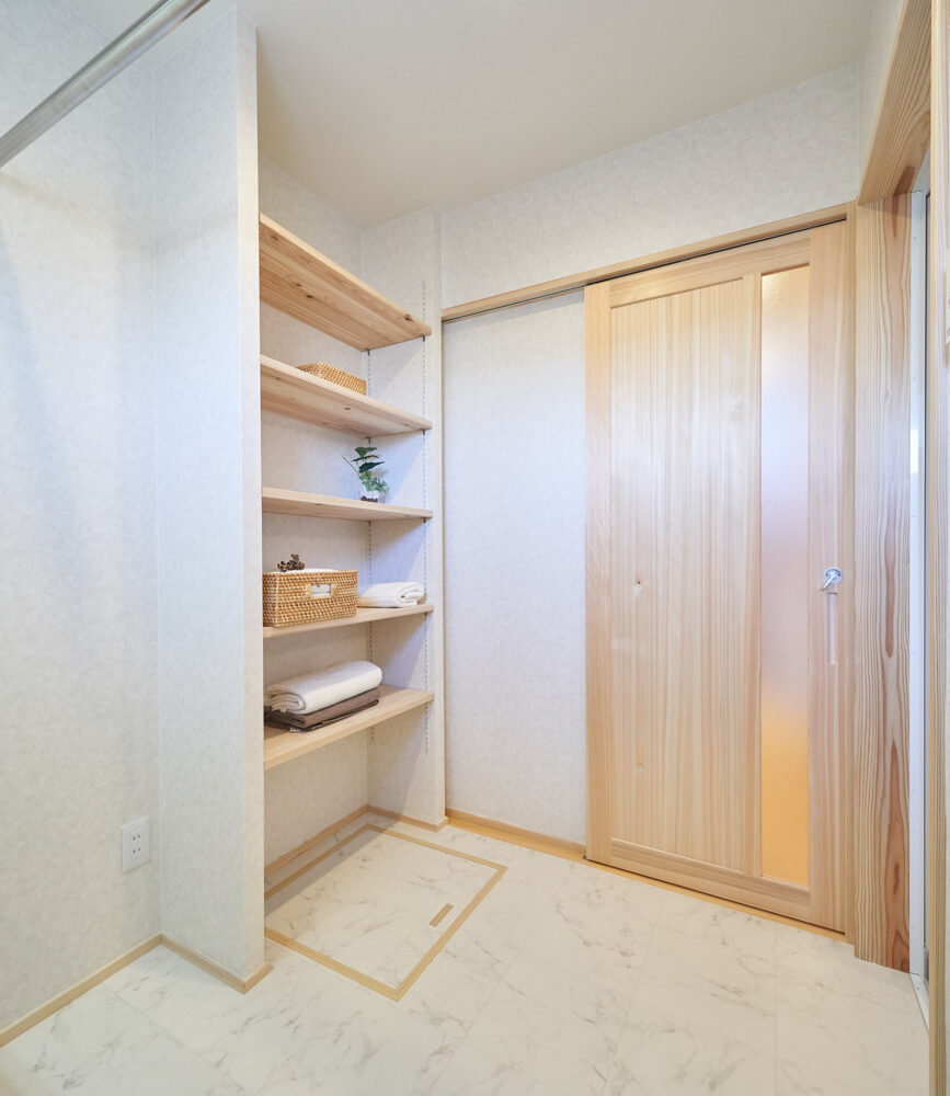 お住まいの建て直しをされた建主様ご一家。これまでの暮らしで不便だった部分など、たくさんお話を伺いました。無駄を省き、ご希望を上手に描いた暮らしやすいプランニング。無垢の床や建具、漆喰壁にオークのアクセントウォールなど、一つひとつ丁寧に選んだ質の良い材たち。設計・材・工法すべてにこだわり、年月を重ねるごとに愛着の湧く、心地よい空間デザインのお住まいとなりました。 目線を遮らず、光を大きく取り込む 居心地よいリビング。 家族があつまる1階のリビング。南側の大きな掃き出し窓はお庭への出入りもしやすく室内への採光も抜群。目線を遮る壁などは配置せず、広さを体感できる居心地の良い空間デザインです。 一つひとつ質の良いものを選び、 ずっと愛せる場所をつくる。 造作建具や階段、アクセントウォールなど、目に肌に触れる随所に無垢のアイテムを採用。床や梁とともに、経年で優しく変化していく様をずっと楽しめる素材です。目にも心にもここち良くずっと愛せる場所となります。 2F 格天井の粋な和室 2階の主寝室は贅沢にしつらえた和室。格式高い無垢の格天井が畳と合間って日本人の落ち着く空間を演出。 適材適所の収納やライブラリースペースなど、 暮らしに合わせた設備 ご家族に合わせた個室、ロフトやパントリーなどの各所の収納、共有のライブラリースペース、外には広い下屋をもつ自転車置き場など暮らしに合わせた設備が動線上に上手に配置されています。 太陽光パネルやハイブリッド給湯器を設置し、エネルギーの再利用や効率化を。さらに「消費エネルギーの見える化&一元管理」が可能なHEMSシステムを導入。アプリで簡単に管理できるお住まいです。