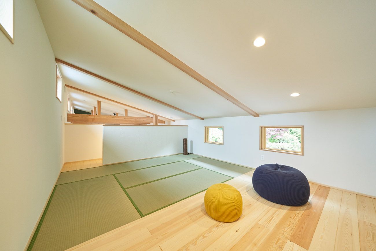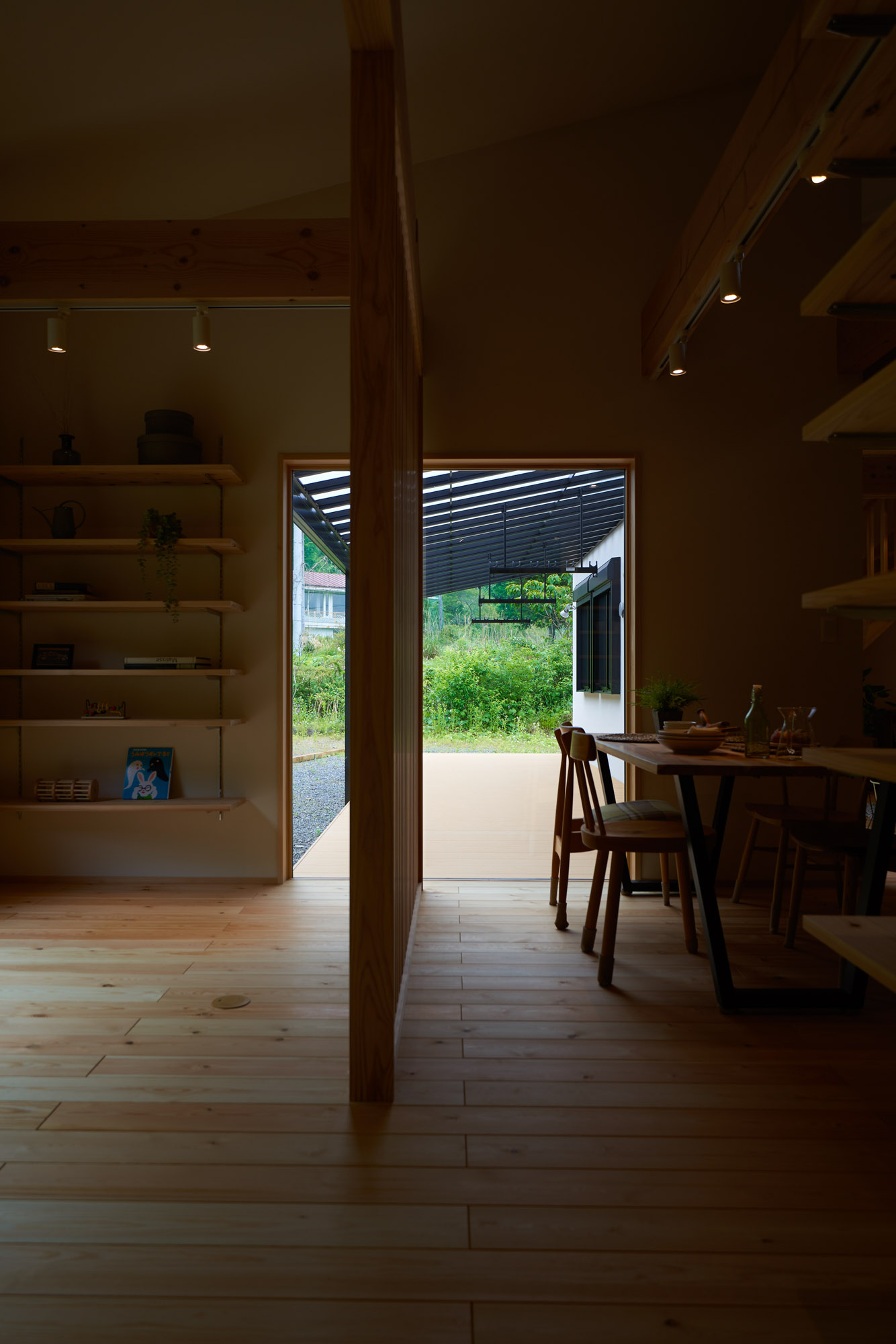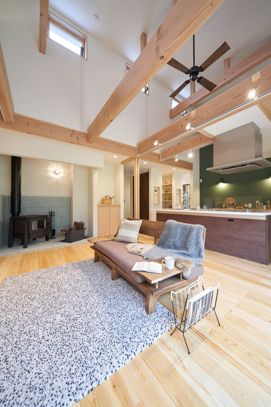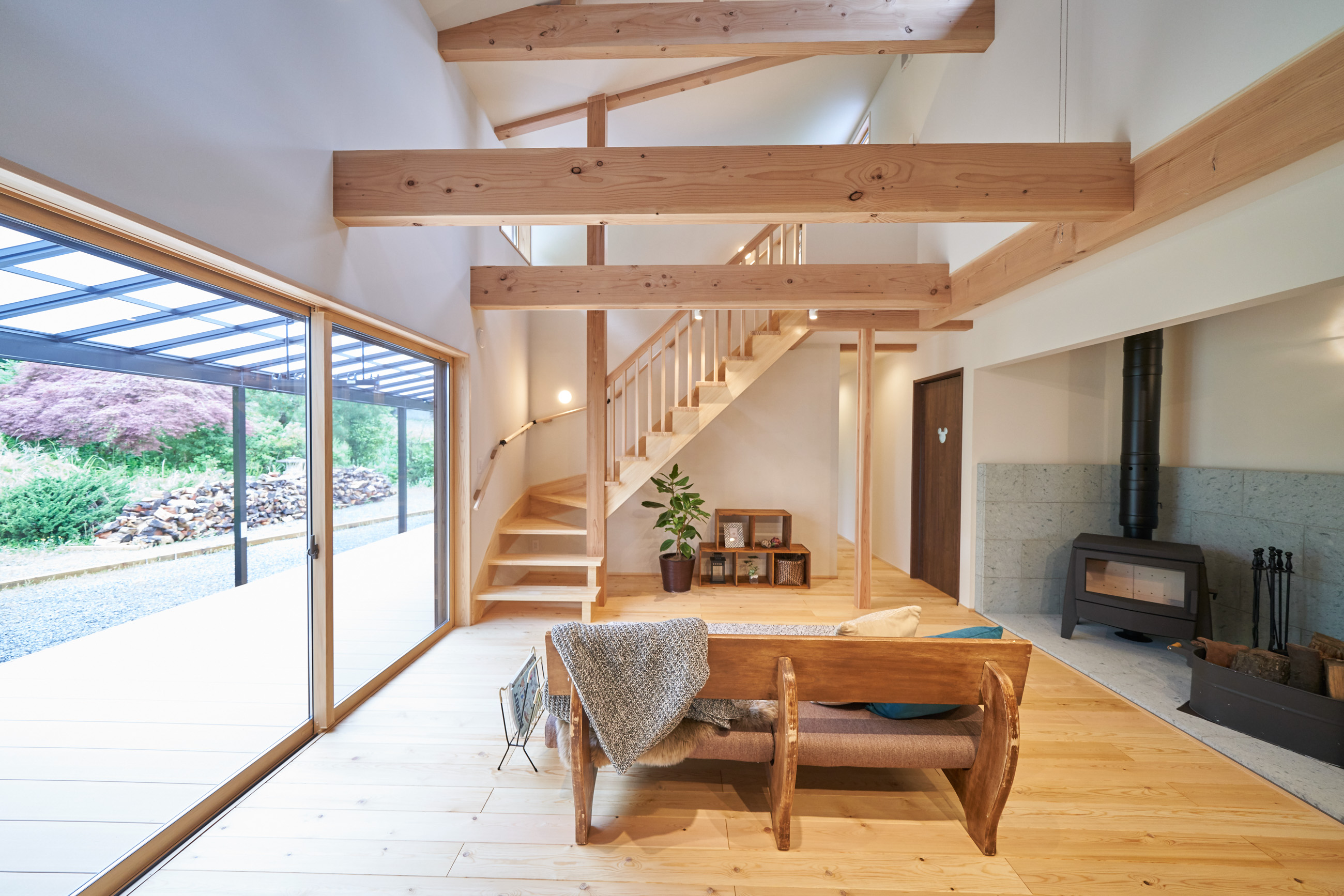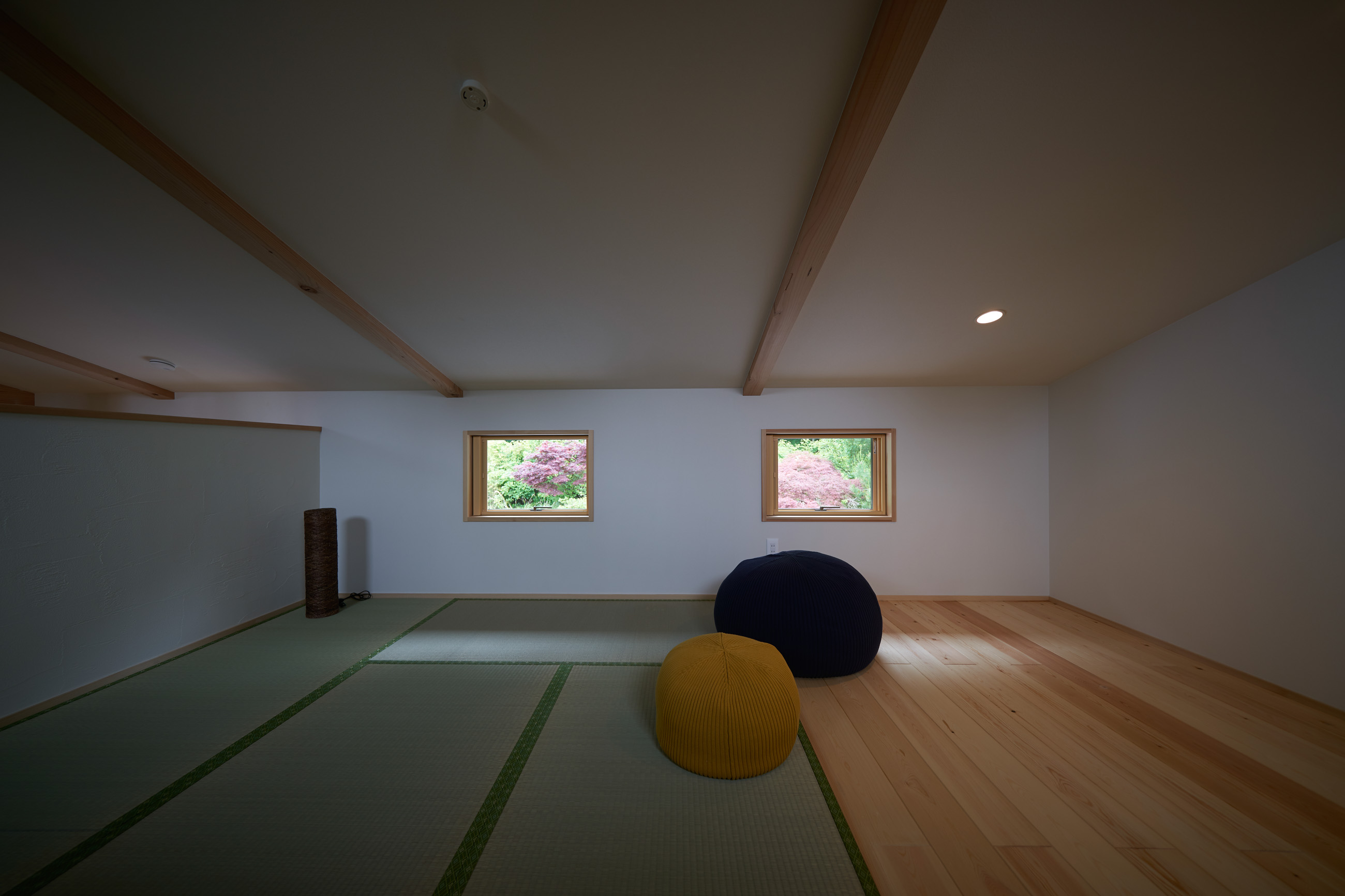 悠々と広がる平屋然とした外観。家族が集まる大きなLDKを内包し、2階には隠れ家のような広い和室。吹き抜けからは家族の気配が程よい距離感で伝わってくる。 Fix窓は一枚の絵のように季節の移ろいを切り取り、それらを楽しみながら、時には雨垂れの音に、時には薪のはぜる音に耳を傾け 思い思いに過ごすライブラリースペース。 プライベートと共用の空間が緩やかにつながり、それぞれが心地よい時間を過ごせる大きな平屋+αのお住まい。 1F 吹抜勾配天井の薪ストーブリビング 借景のライブラリースペース 回遊できる大きな玄関収納 2F 緩やかに隔てられた2階の隠れ家