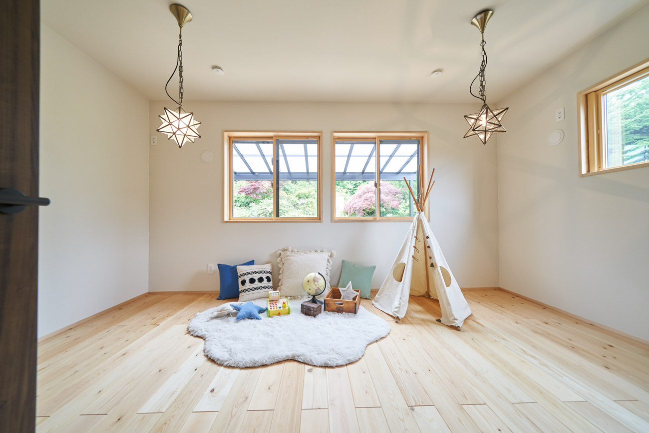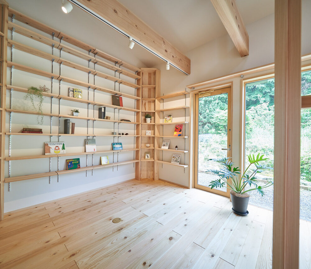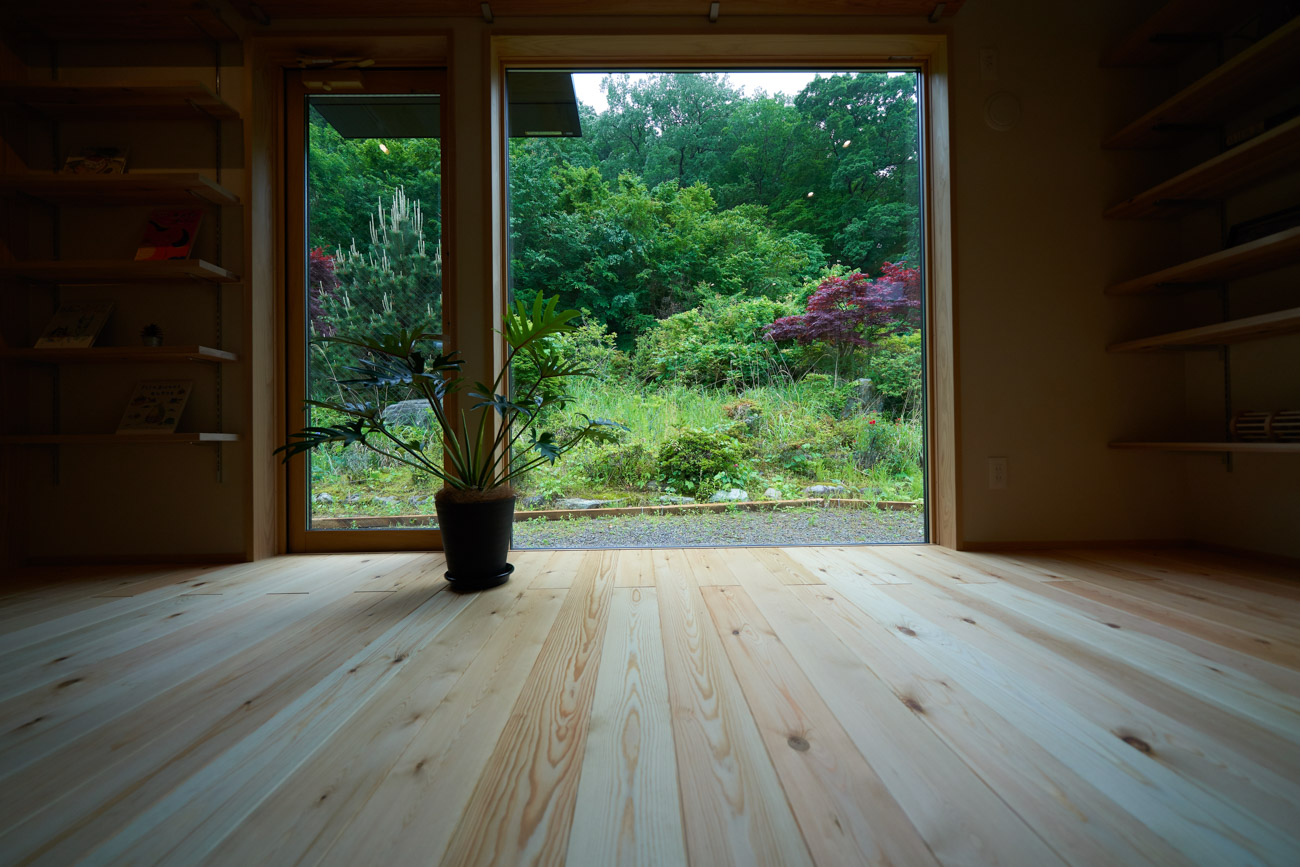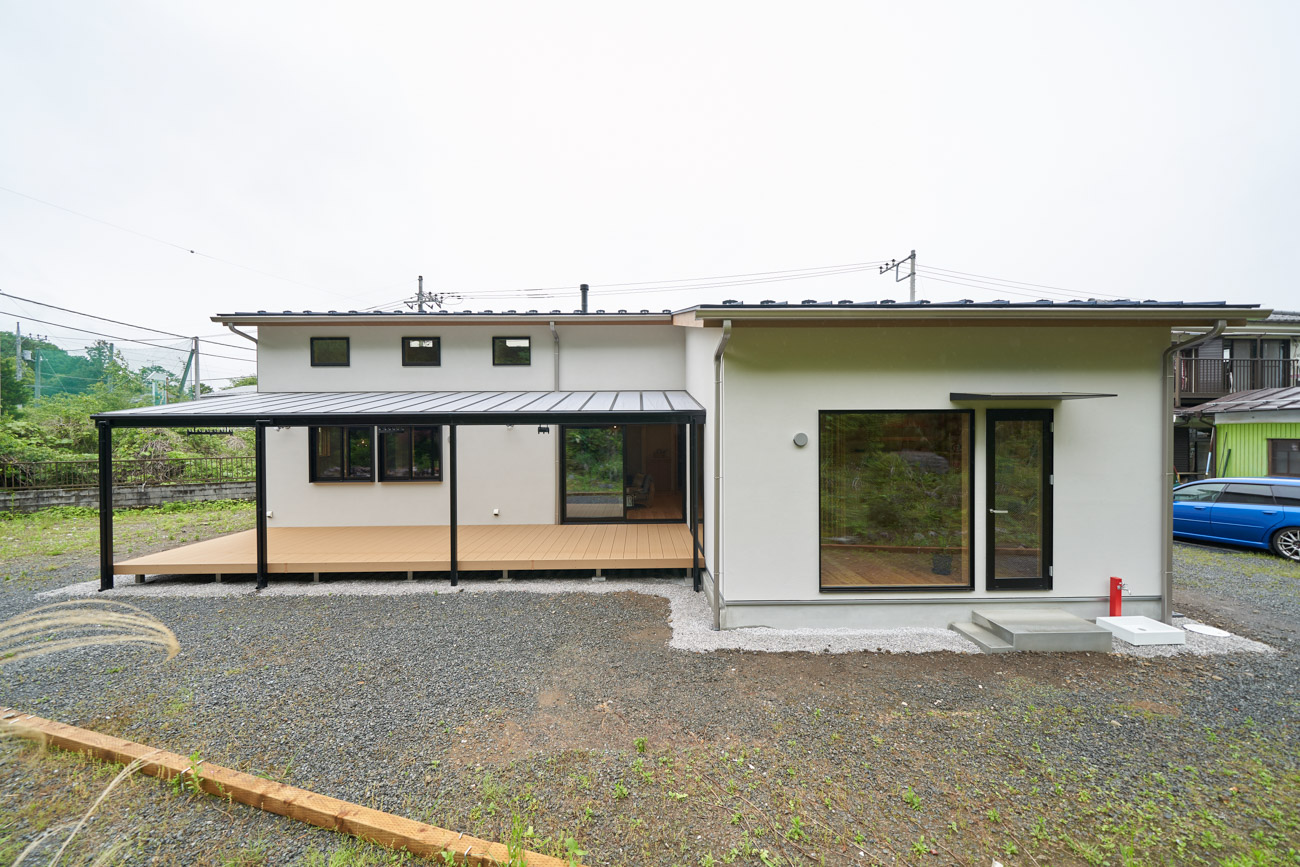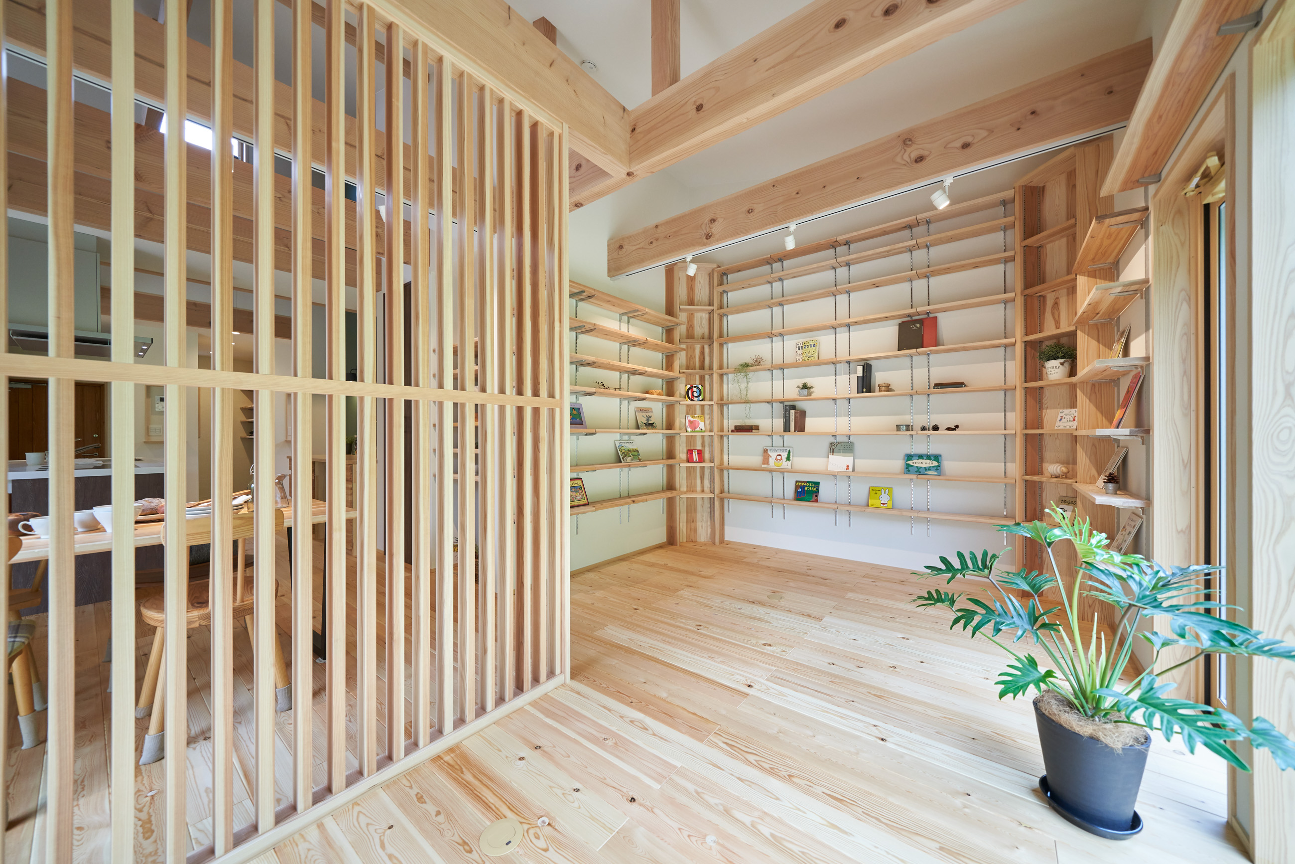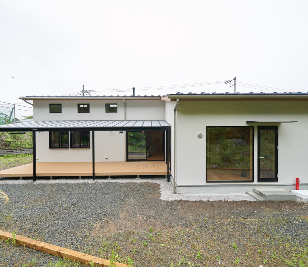 悠々と広がる平屋然とした外観。家族が集まる大きなLDKを内包し、2階には隠れ家のような広い和室。吹き抜けからは家族の気配が程よい距離感で伝わってくる。 Fix窓は一枚の絵のように季節の移ろいを切り取り、それらを楽しみながら、時には雨垂れの音に、時には薪のはぜる音に耳を傾け 思い思いに過ごすライブラリースペース。 プライベートと共用の空間が緩やかにつながり、それぞれが心地よい時間を過ごせる大きな平屋+αのお住まい。 1F 吹抜勾配天井の薪ストーブリビング 借景のライブラリースペース 回遊できる大きな玄関収納 2F 緩やかに隔てられた2階の隠れ家