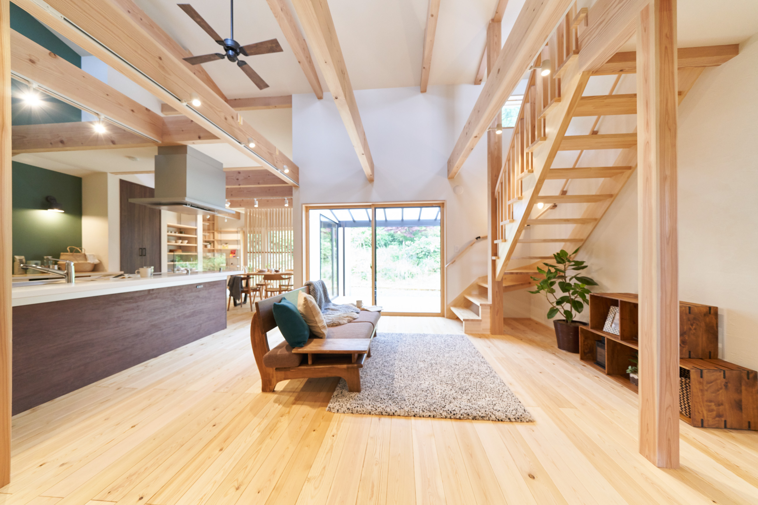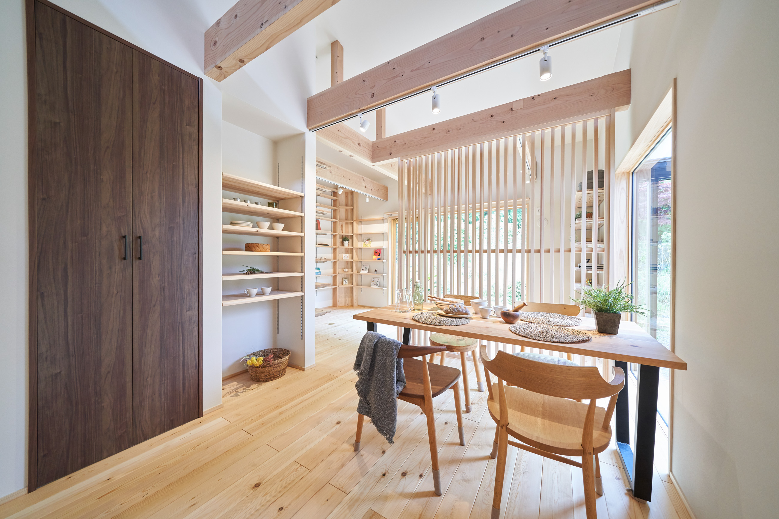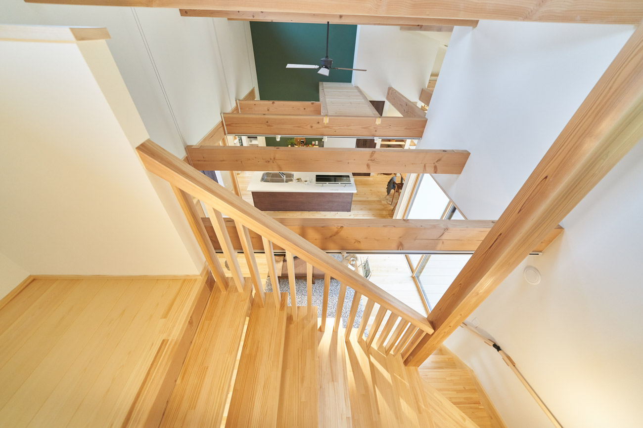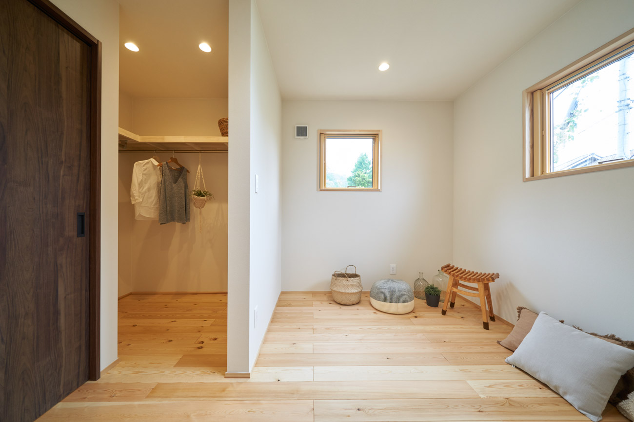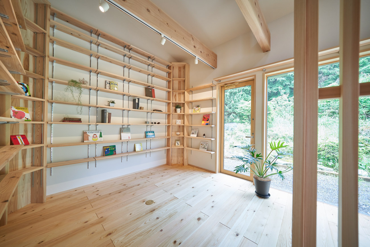 悠々と広がる平屋然とした外観。家族が集まる大きなLDKを内包し、2階には隠れ家のような広い和室。吹き抜けからは家族の気配が程よい距離感で伝わってくる。 Fix窓は一枚の絵のように季節の移ろいを切り取り、それらを楽しみながら、時には雨垂れの音に、時には薪のはぜる音に耳を傾け 思い思いに過ごすライブラリースペース。 プライベートと共用の空間が緩やかにつながり、それぞれが心地よい時間を過ごせる大きな平屋+αのお住まい。 1F 吹抜勾配天井の薪ストーブリビング 借景のライブラリースペース 回遊できる大きな玄関収納 2F 緩やかに隔てられた2階の隠れ家