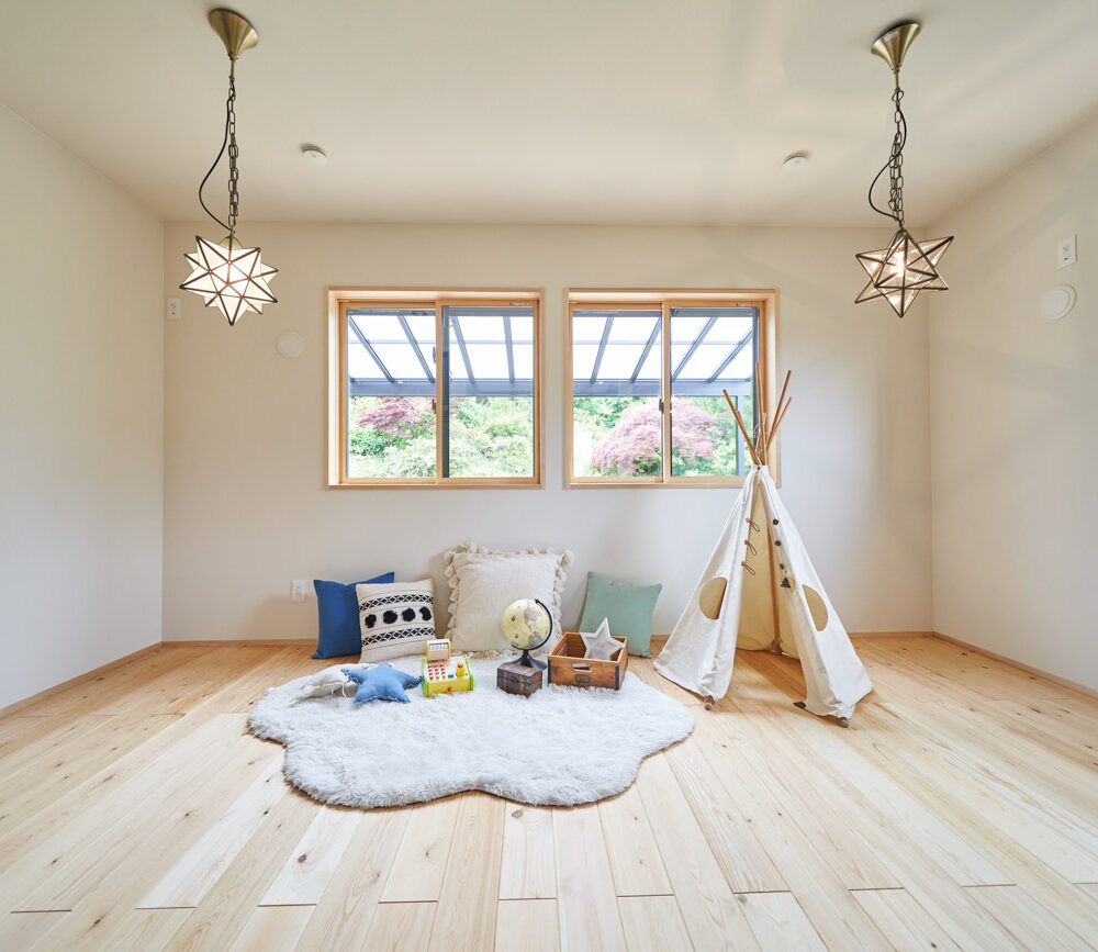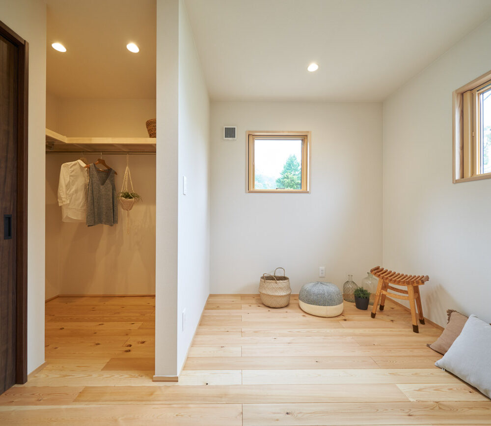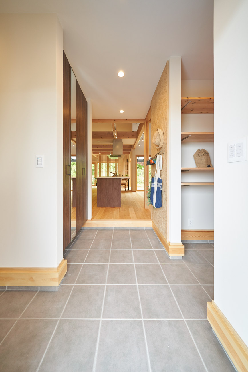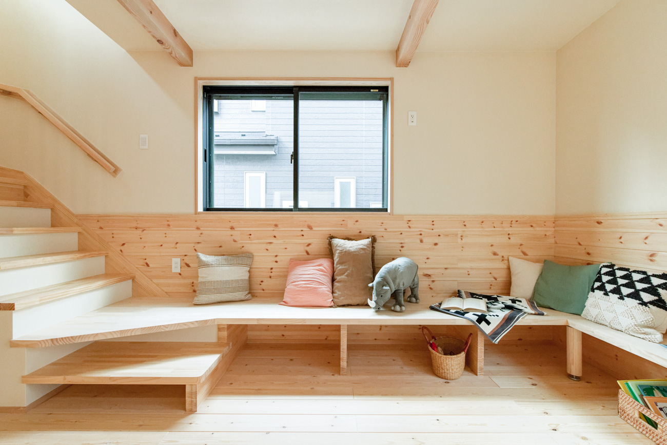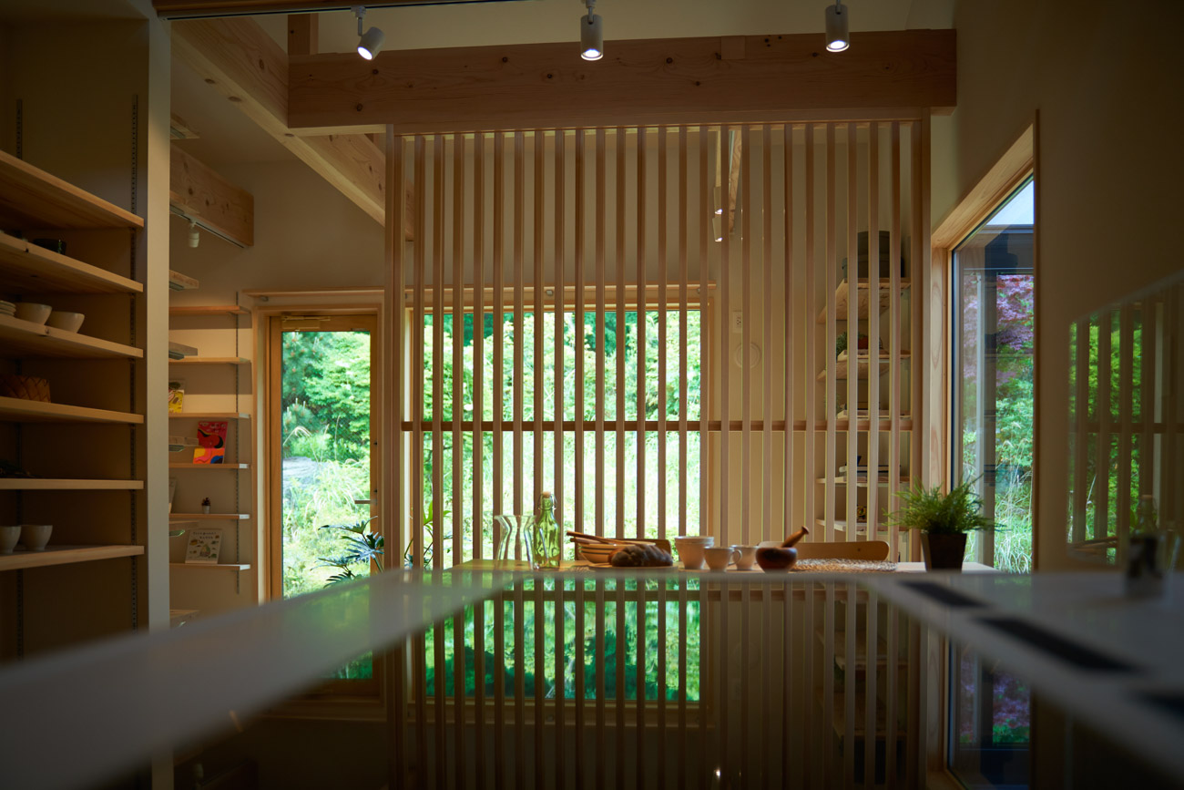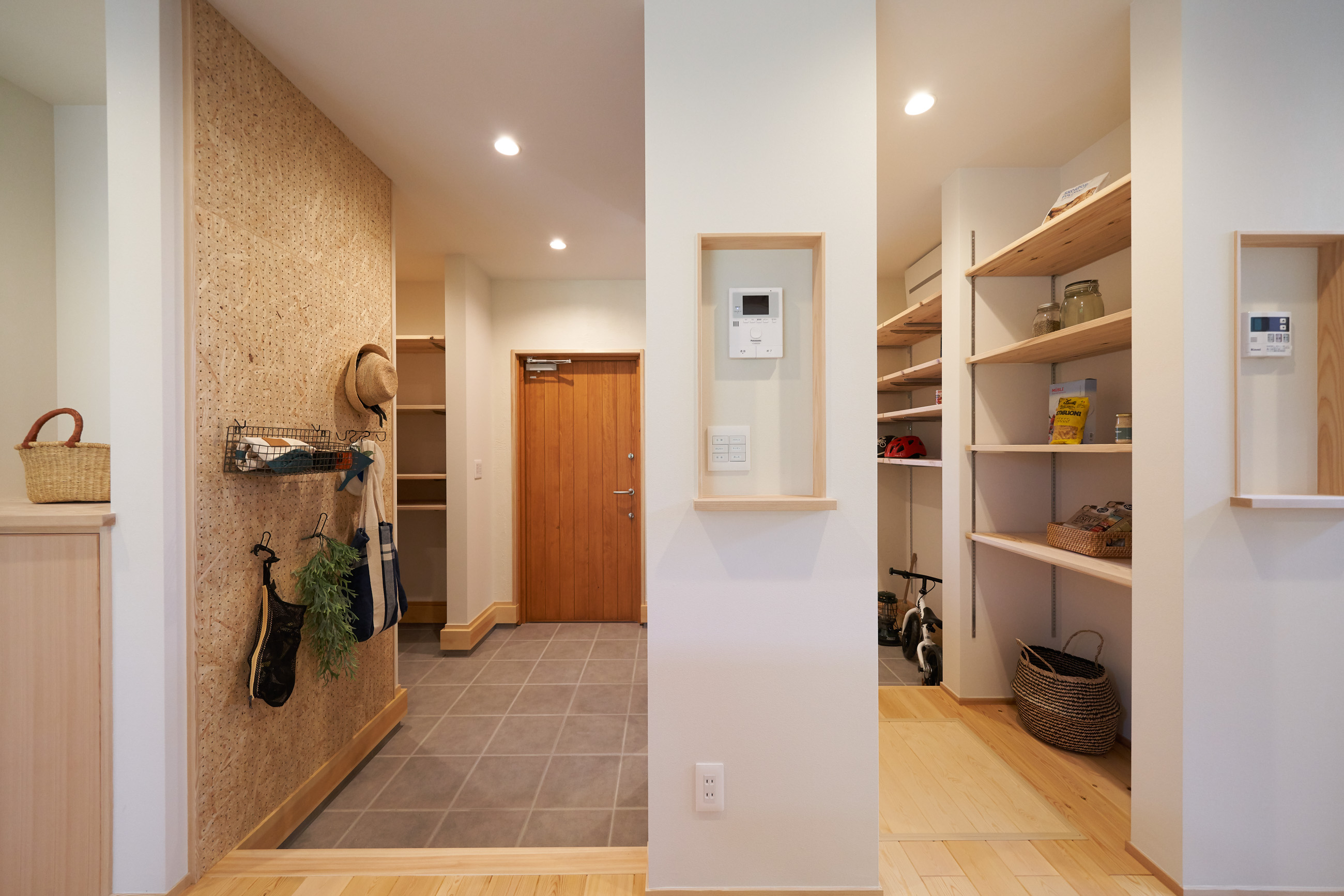 悠々と広がる平屋然とした外観。家族が集まる大きなLDKを内包し、2階には隠れ家のような広い和室。吹き抜けからは家族の気配が程よい距離感で伝わってくる。 Fix窓は一枚の絵のように季節の移ろいを切り取り、それらを楽しみながら、時には雨垂れの音に、時には薪のはぜる音に耳を傾け 思い思いに過ごすライブラリースペース。 プライベートと共用の空間が緩やかにつながり、それぞれが心地よい時間を過ごせる大きな平屋+αのお住まい。 1F 吹抜勾配天井の薪ストーブリビング 借景のライブラリースペース 回遊できる大きな玄関収納 2F 緩やかに隔てられた2階の隠れ家