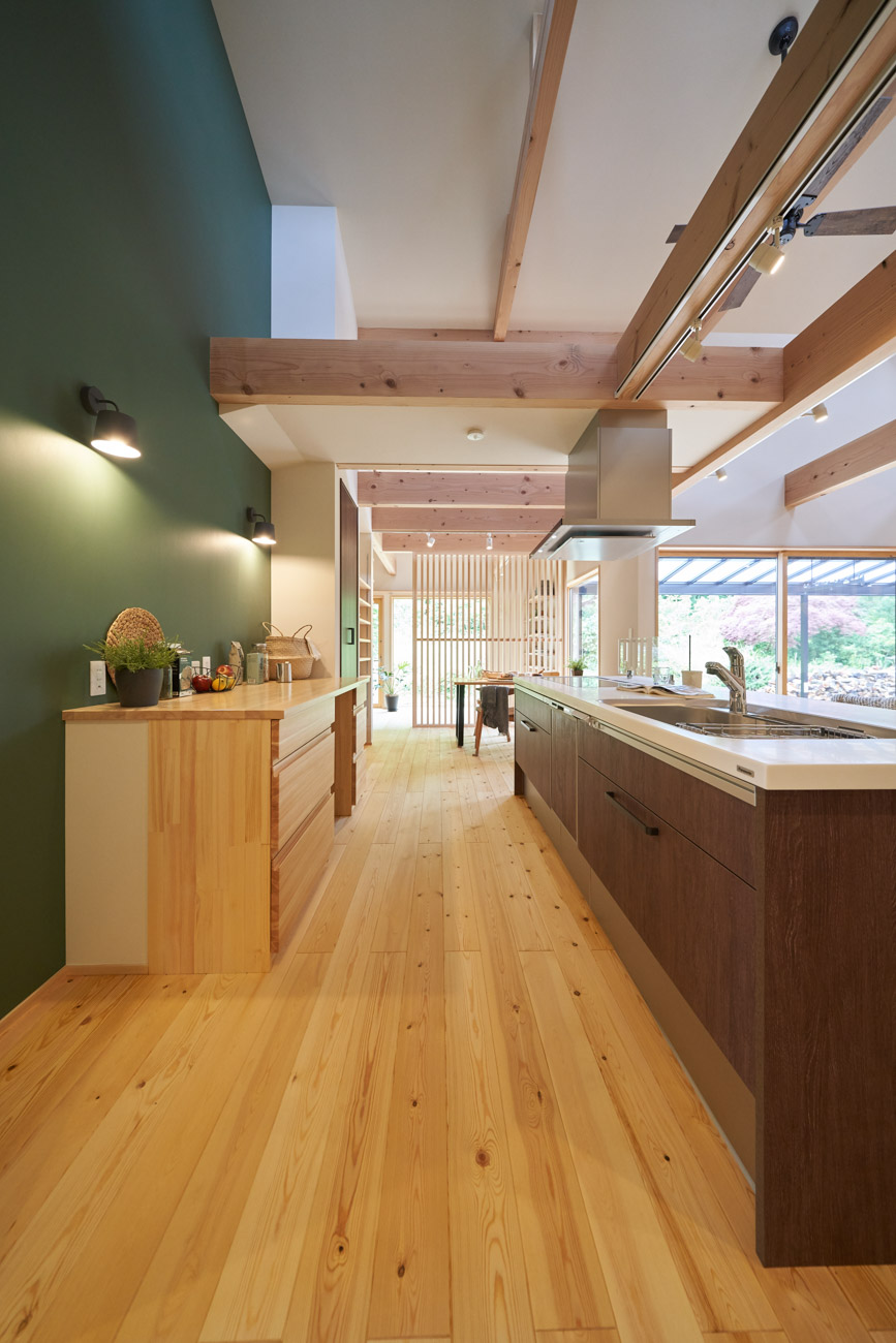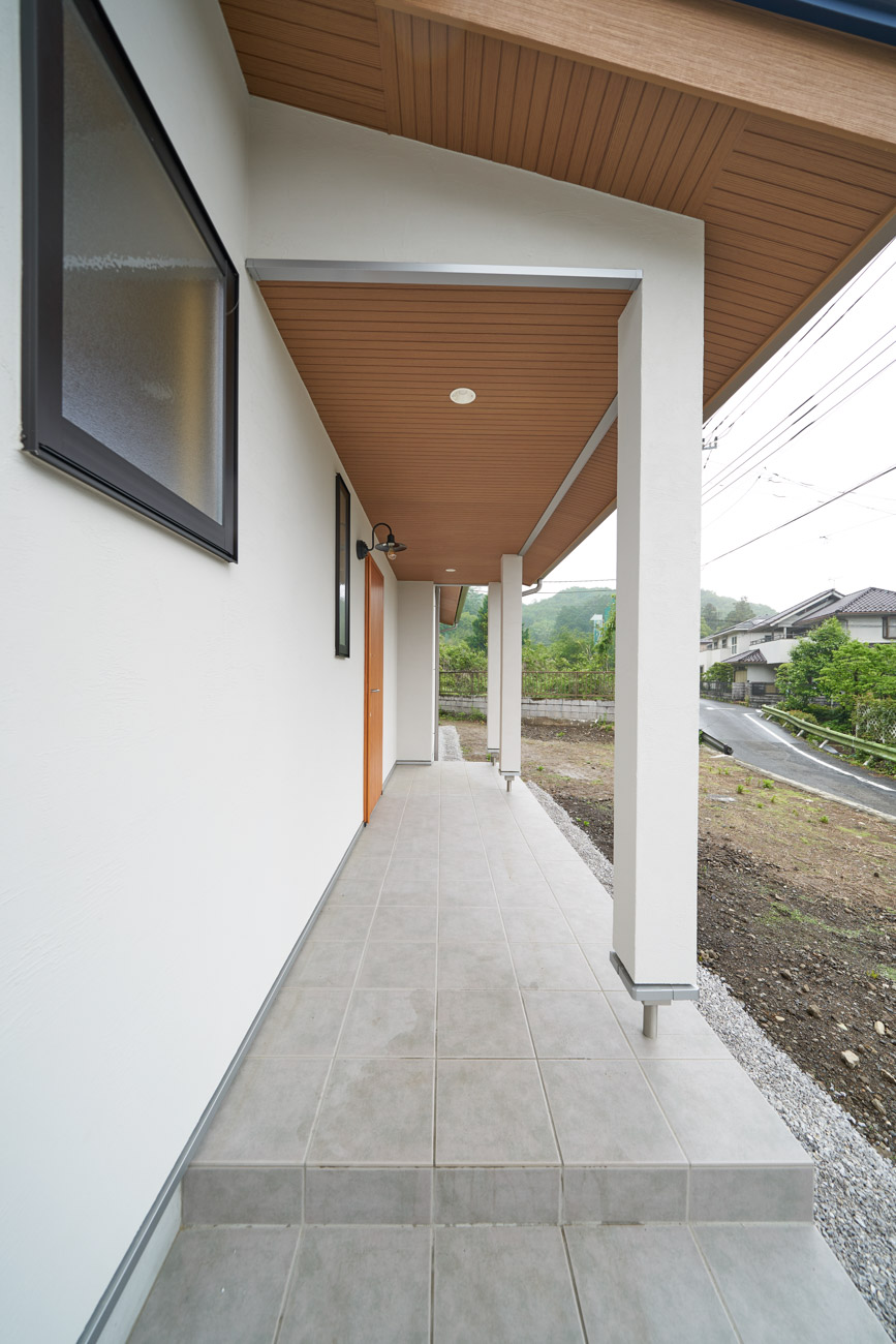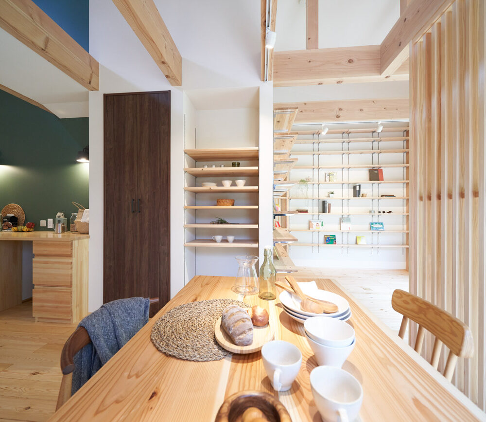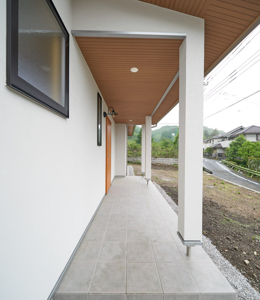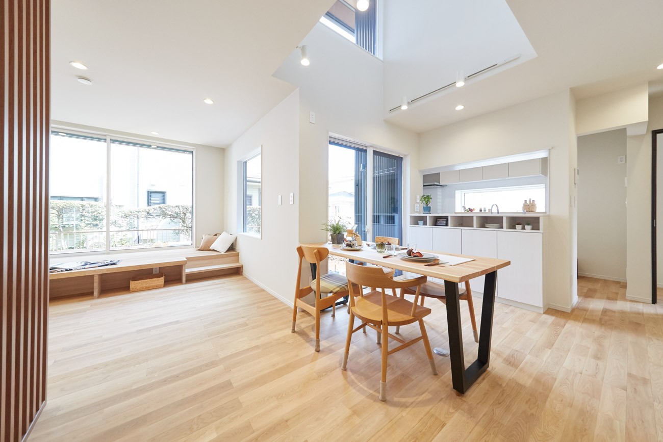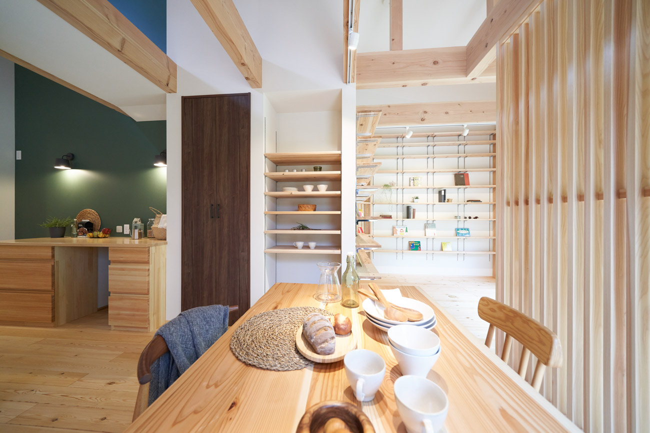 悠々と広がる平屋然とした外観。家族が集まる大きなLDKを内包し、2階には隠れ家のような広い和室。吹き抜けからは家族の気配が程よい距離感で伝わってくる。 Fix窓は一枚の絵のように季節の移ろいを切り取り、それらを楽しみながら、時には雨垂れの音に、時には薪のはぜる音に耳を傾け 思い思いに過ごすライブラリースペース。 プライベートと共用の空間が緩やかにつながり、それぞれが心地よい時間を過ごせる大きな平屋+αのお住まい。 1F 吹抜勾配天井の薪ストーブリビング 借景のライブラリースペース 回遊できる大きな玄関収納 2F 緩やかに隔てられた2階の隠れ家