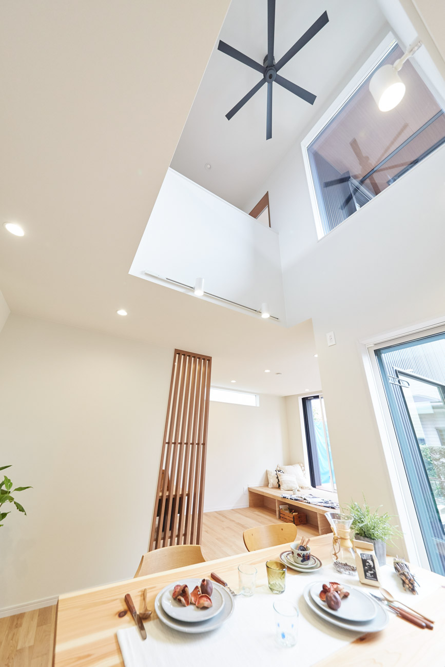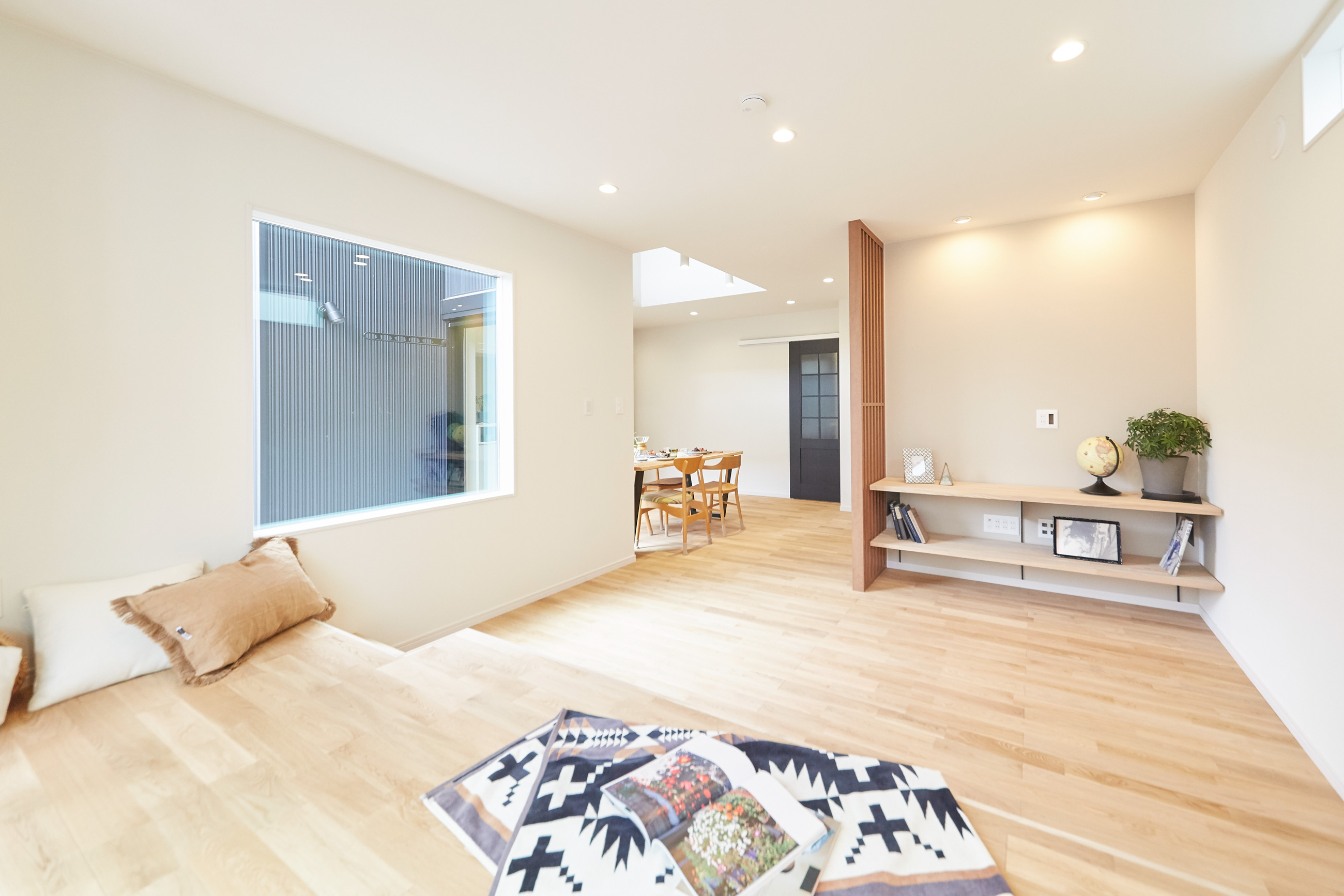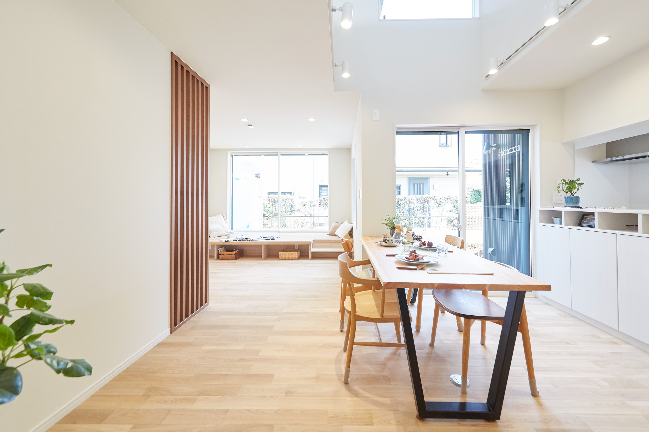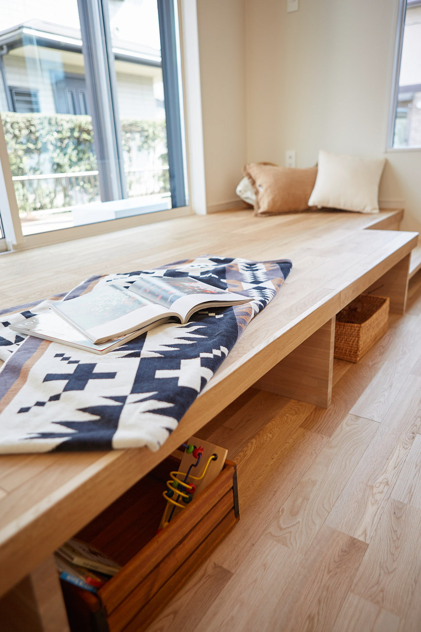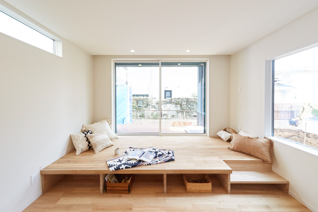 吹き抜けのあるダイニングキッチン側とリビング側は緩く分け、空間に奥行を演出。日当たりの良い窓側には腰掛けたりごろねができる小上がりスペース。家族が共に時間を過ごす憩いの場です。ウッドデッキと小上がりスペースはレベルを合わせ、ひと繋がりのアウトドアリビングのようです。