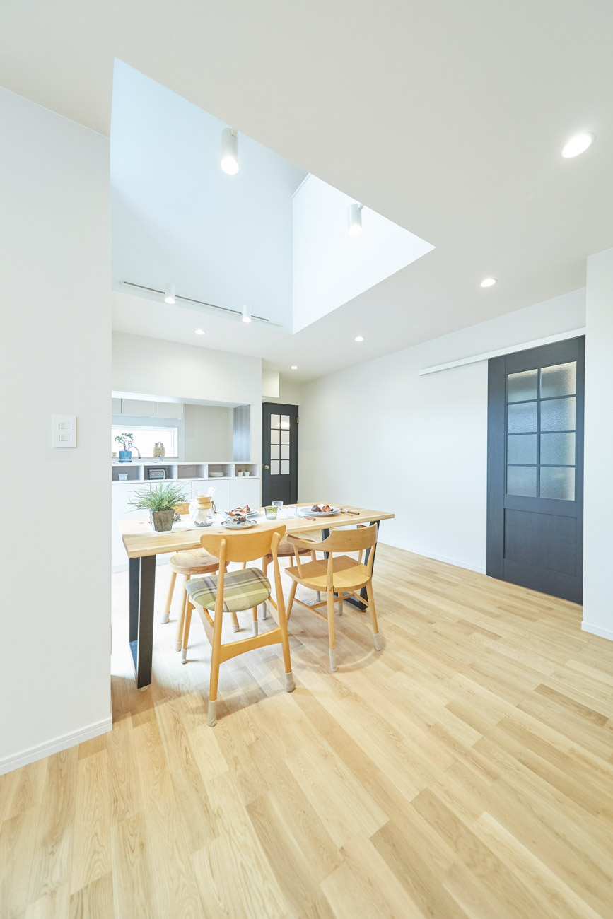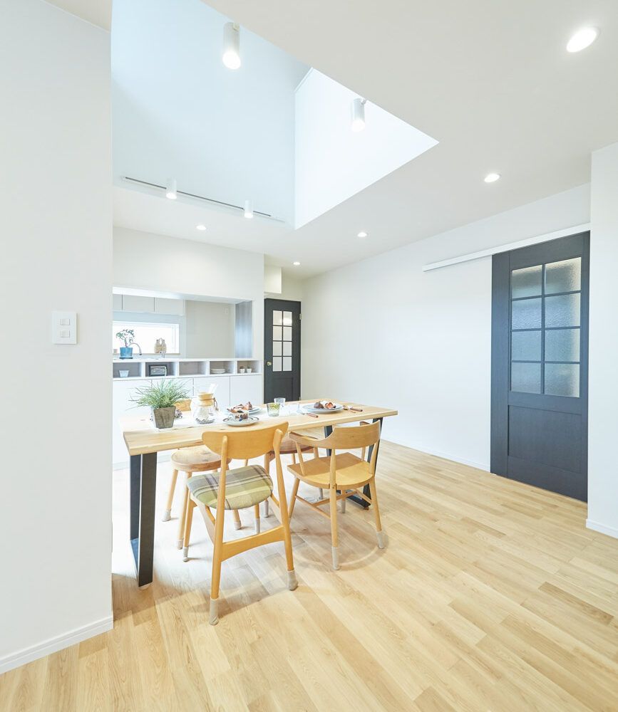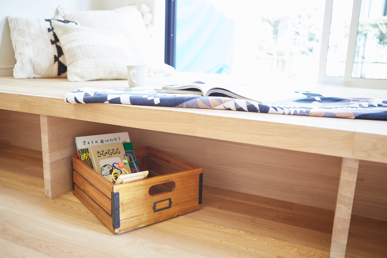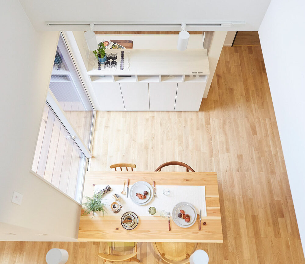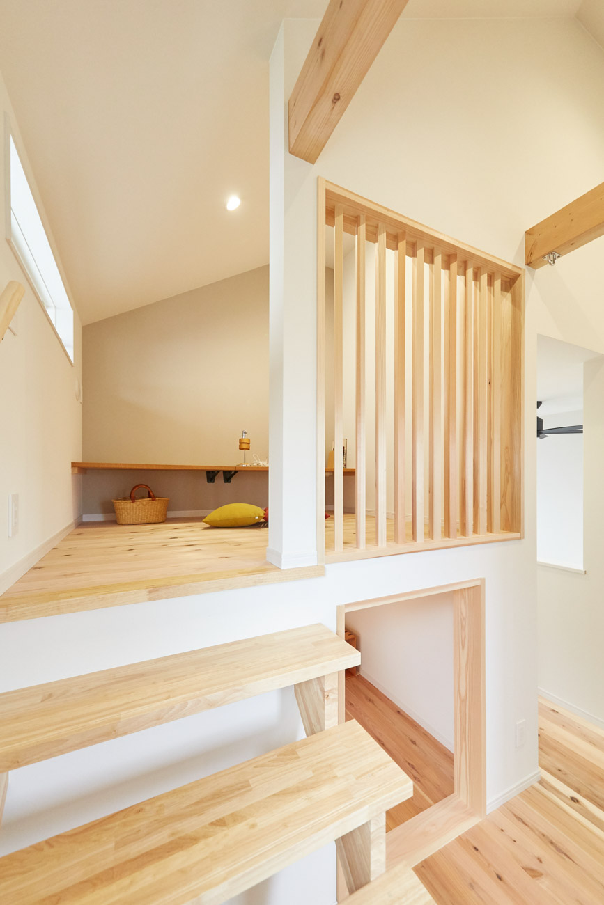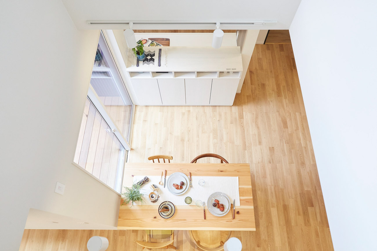 吹き抜けのあるダイニングキッチン側とリビング側は緩く分け、空間に奥行を演出。日当たりの良い窓側には腰掛けたりごろねができる小上がりスペース。家族が共に時間を過ごす憩いの場です。ウッドデッキと小上がりスペースはレベルを合わせ、ひと繋がりのアウトドアリビングのようです。
