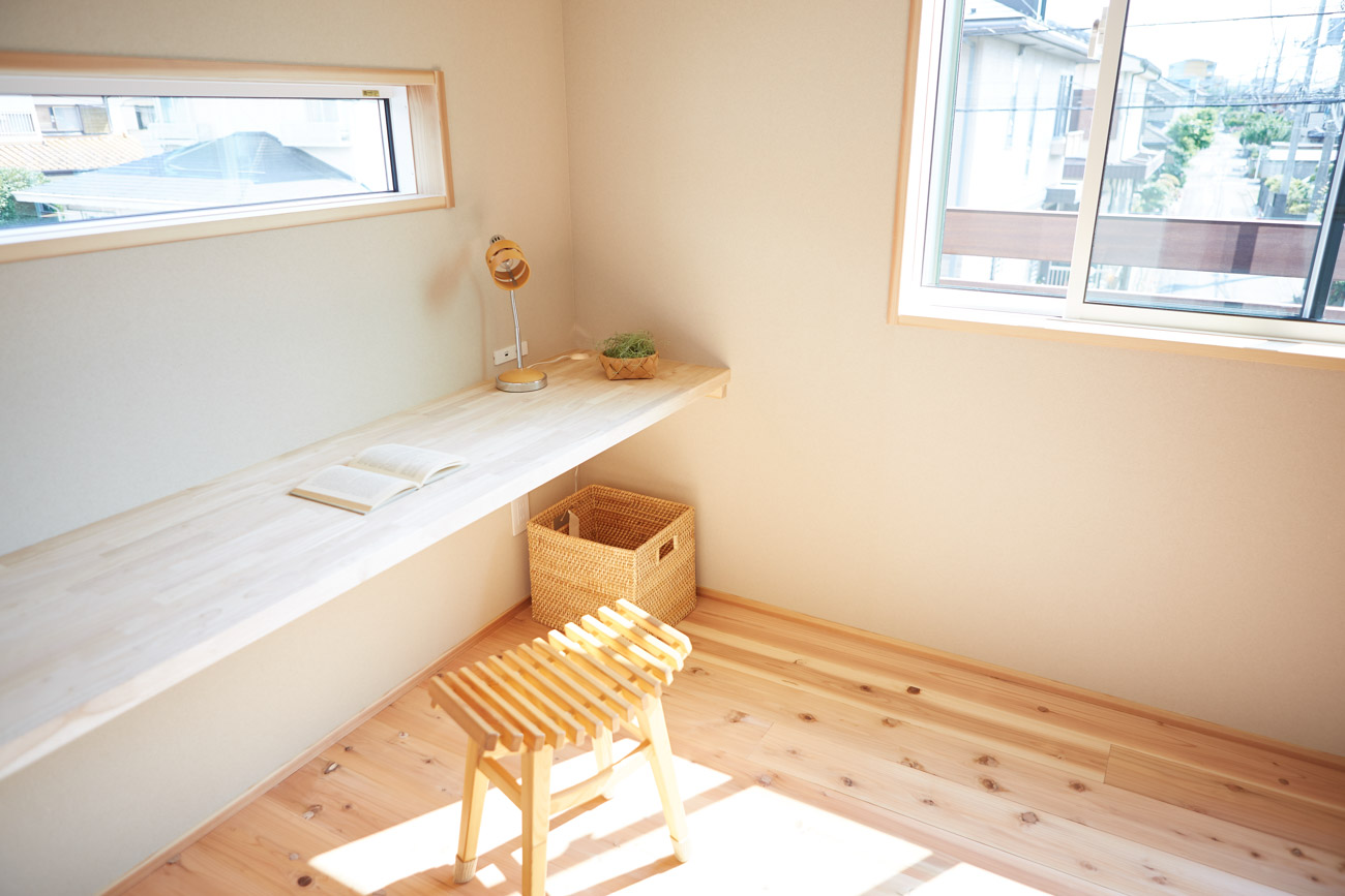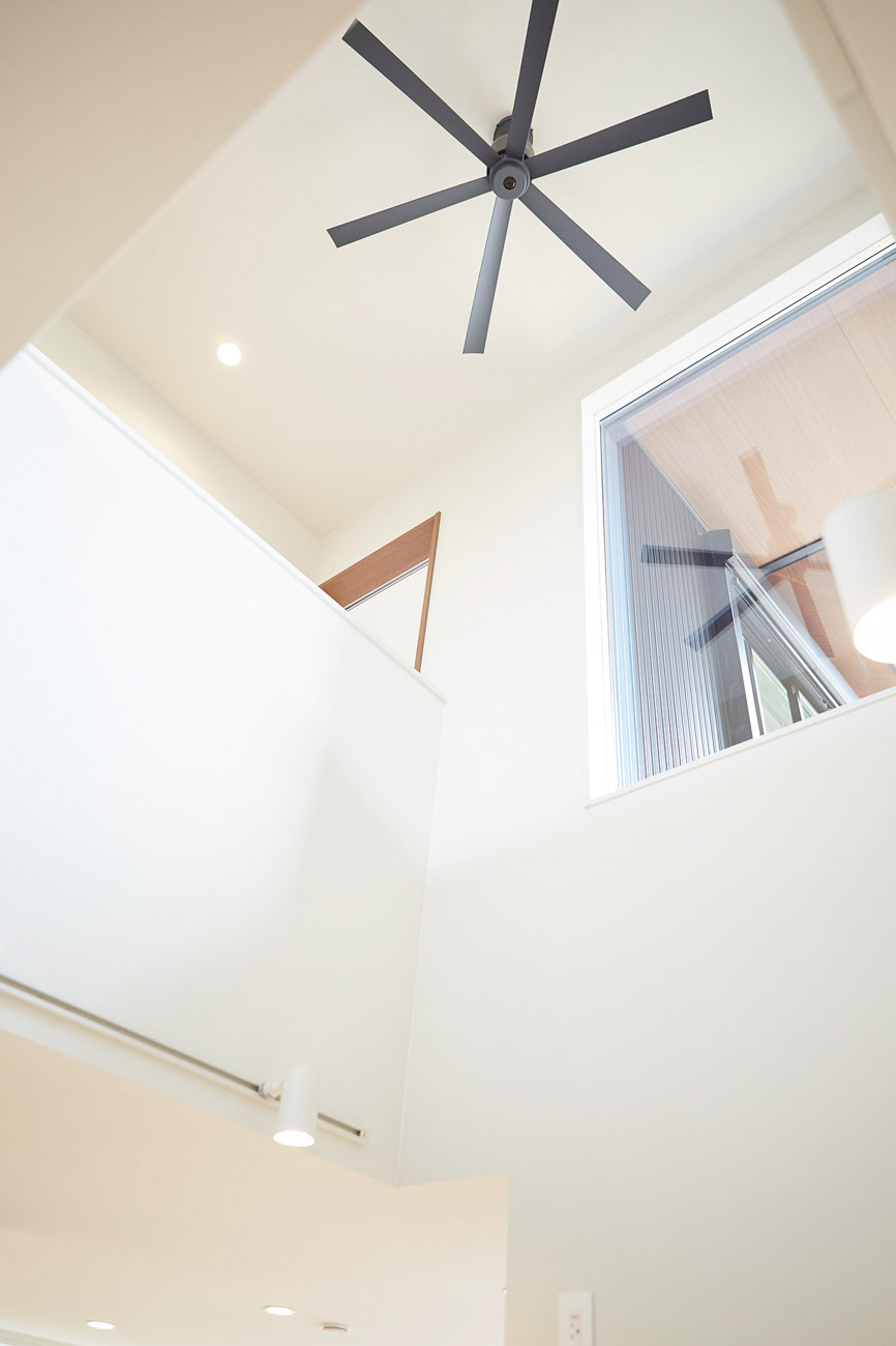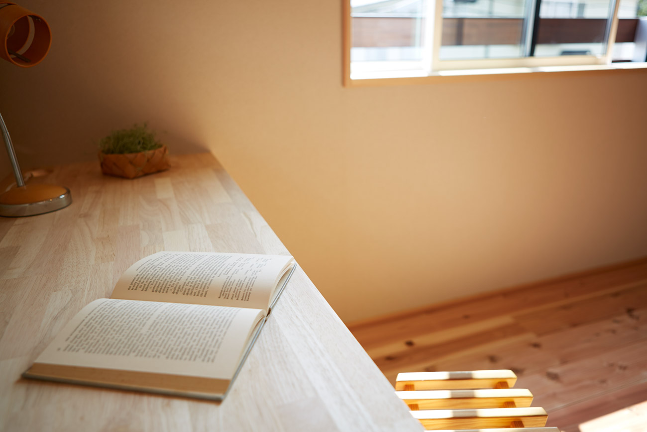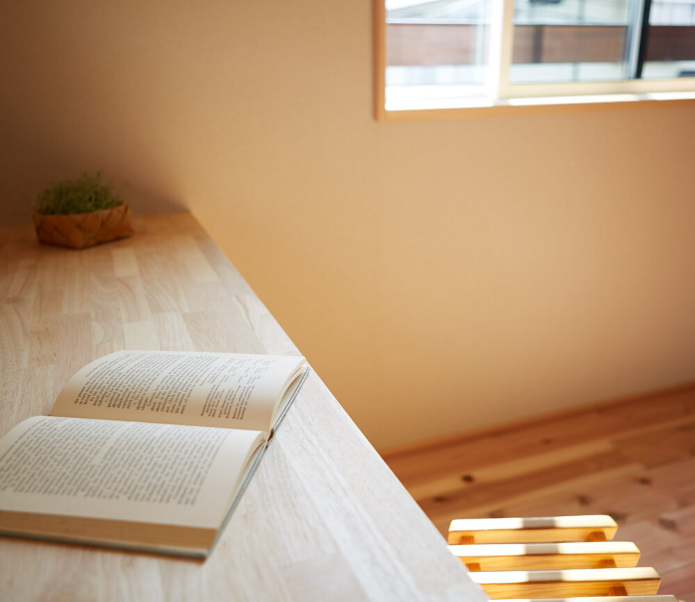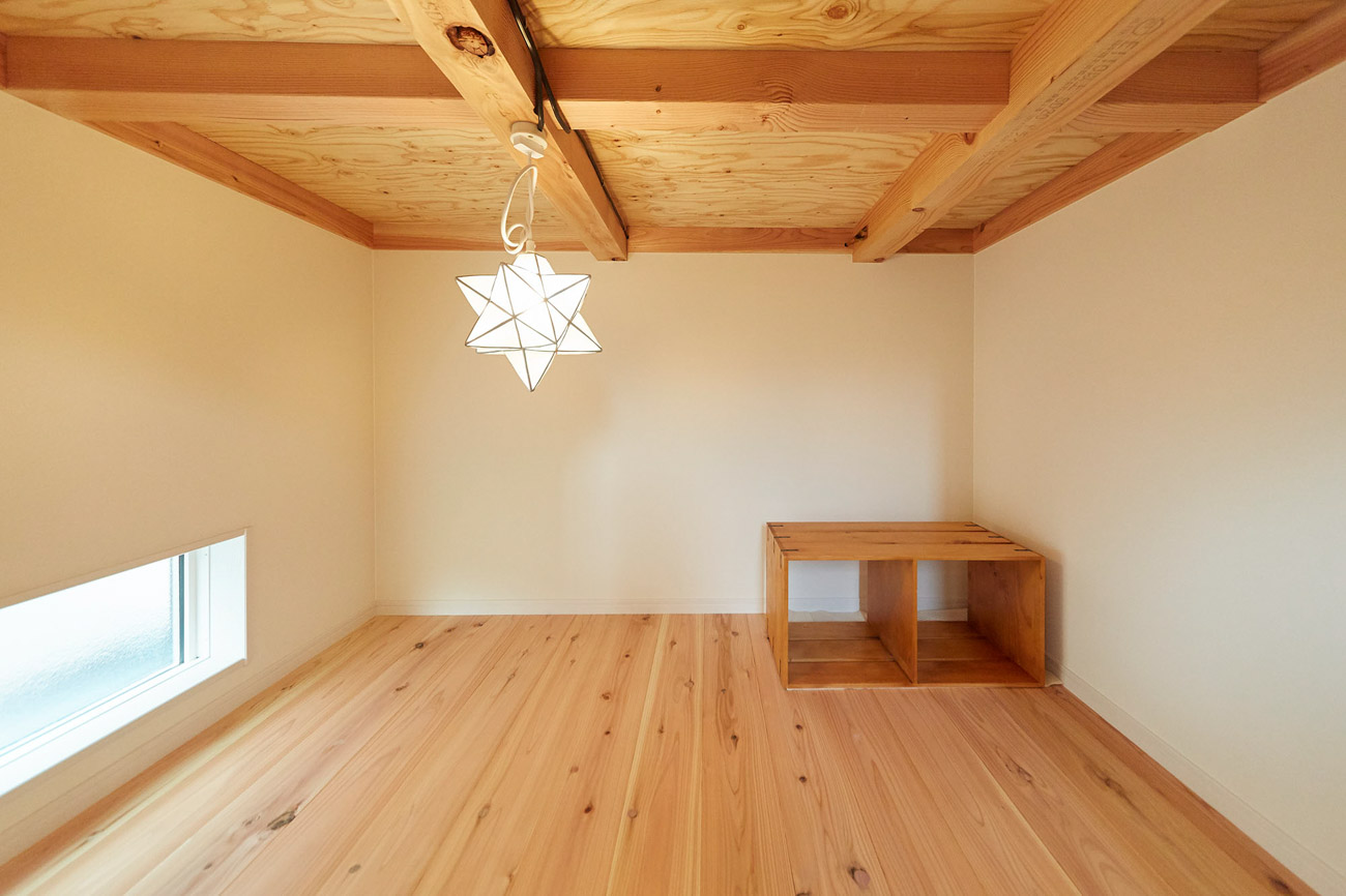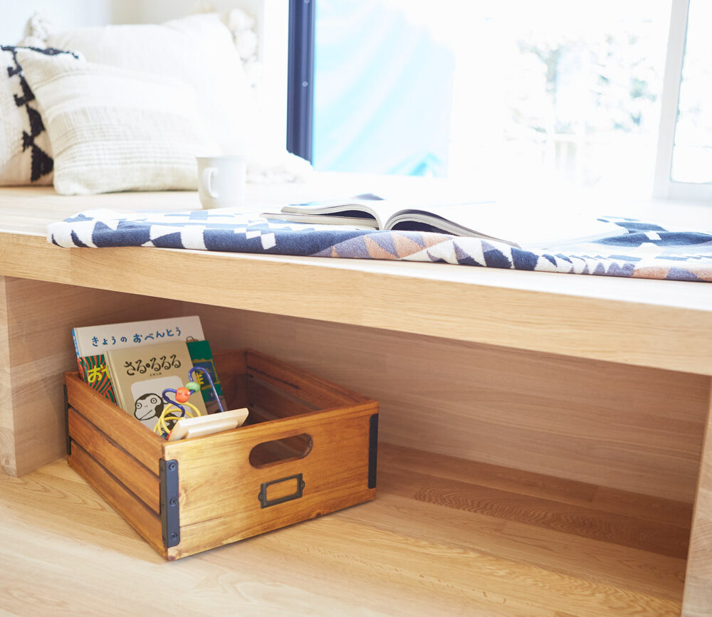 吹き抜けのあるダイニングキッチン側とリビング側は緩く分け、空間に奥行を演出。日当たりの良い窓側には腰掛けたりごろねができる小上がりスペース。家族が共に時間を過ごす憩いの場です。ウッドデッキと小上がりスペースはレベルを合わせ、ひと繋がりのアウトドアリビングのようです。