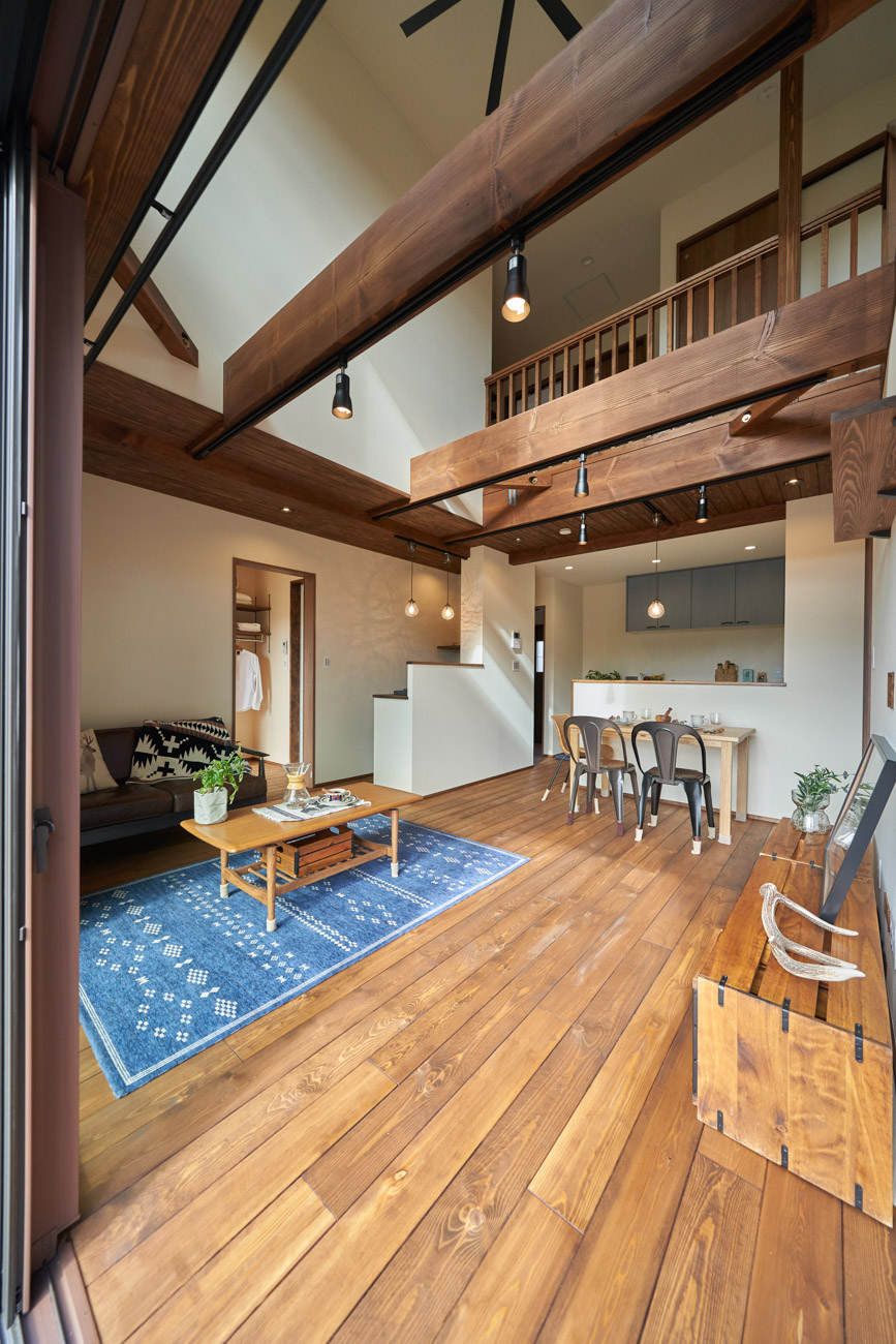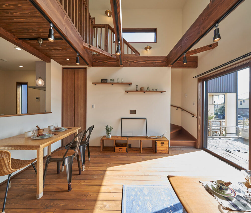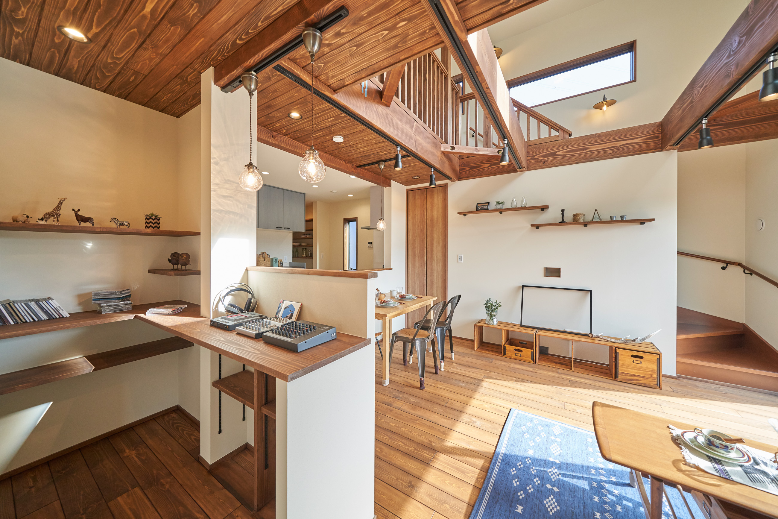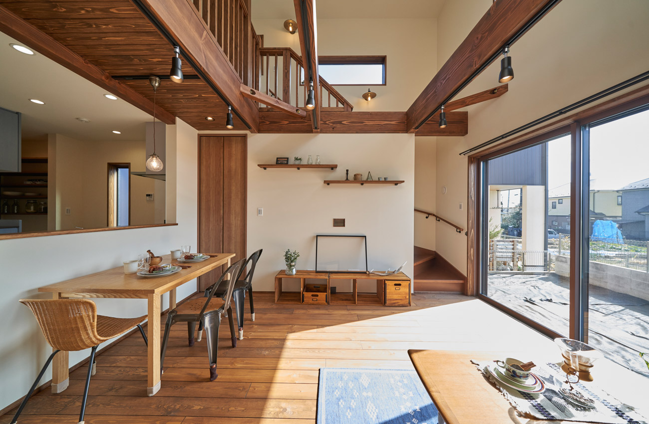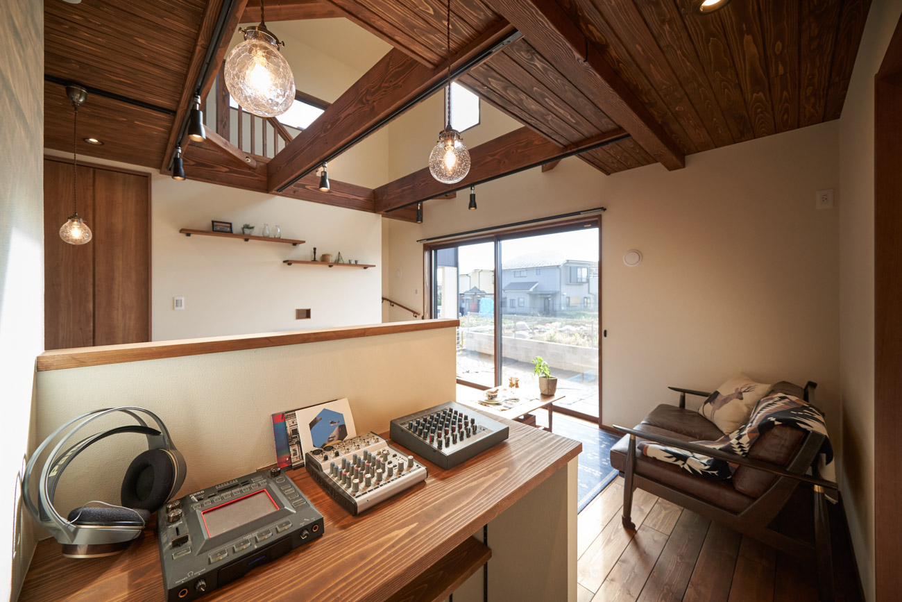 高く明るい吹き抜け。長閑な風景を望む、大きな窓。開放的な空間に、音楽を楽しむためのブースを内包したリビング。音楽好きの建主様が暮らす、大人モダンなお住まい。 借景を望むリビングで音楽を楽しむ時間 無垢を上品に染め上げ、落ち着いたリビング。その一角に作られたDJブース。週末、リビングは趣味の音楽を楽しむ場所へと様変わり。カウンターに配線用の穴を設けてあるため、機材をすっきり収納できます。奥様のご希望で、カウンターキッチンは掃き出し窓の正面に設置。近隣の風景を楽しむことができ、家事の時間もゆったり心地よく過ごせます。 開放的な吹抜け、暮らしやすい設備 吹き抜けの開放感や明るさ、家族の気配を感じるプランニング。共有の本棚や、ランドリールーム、広い玄関収納などの設備の良さ。意匠性の高い、漆喰入り左官仕上げの外壁。住む人のライフスタイルを叶える、多彩なアイテムがたくさん散りばめられています。