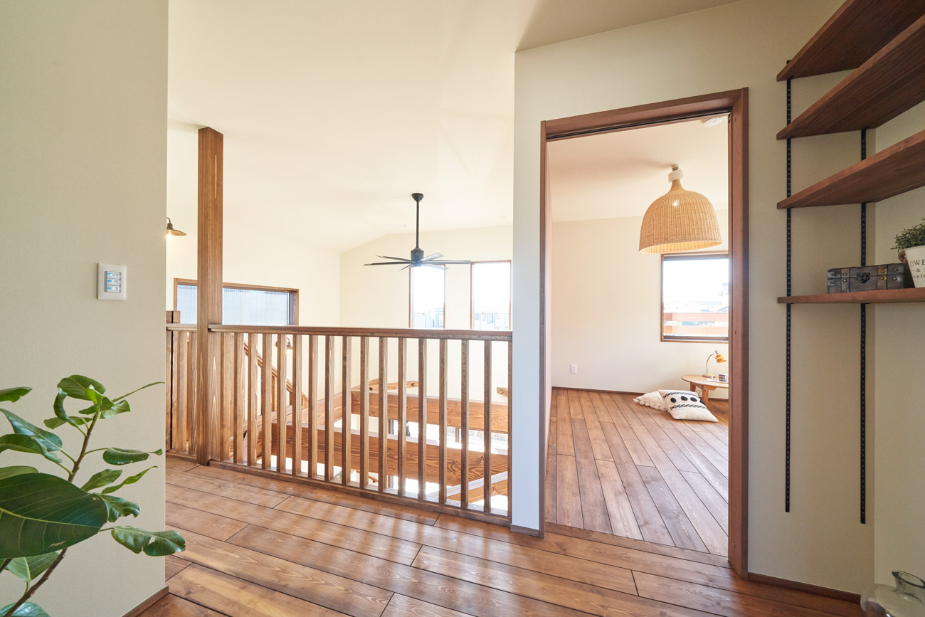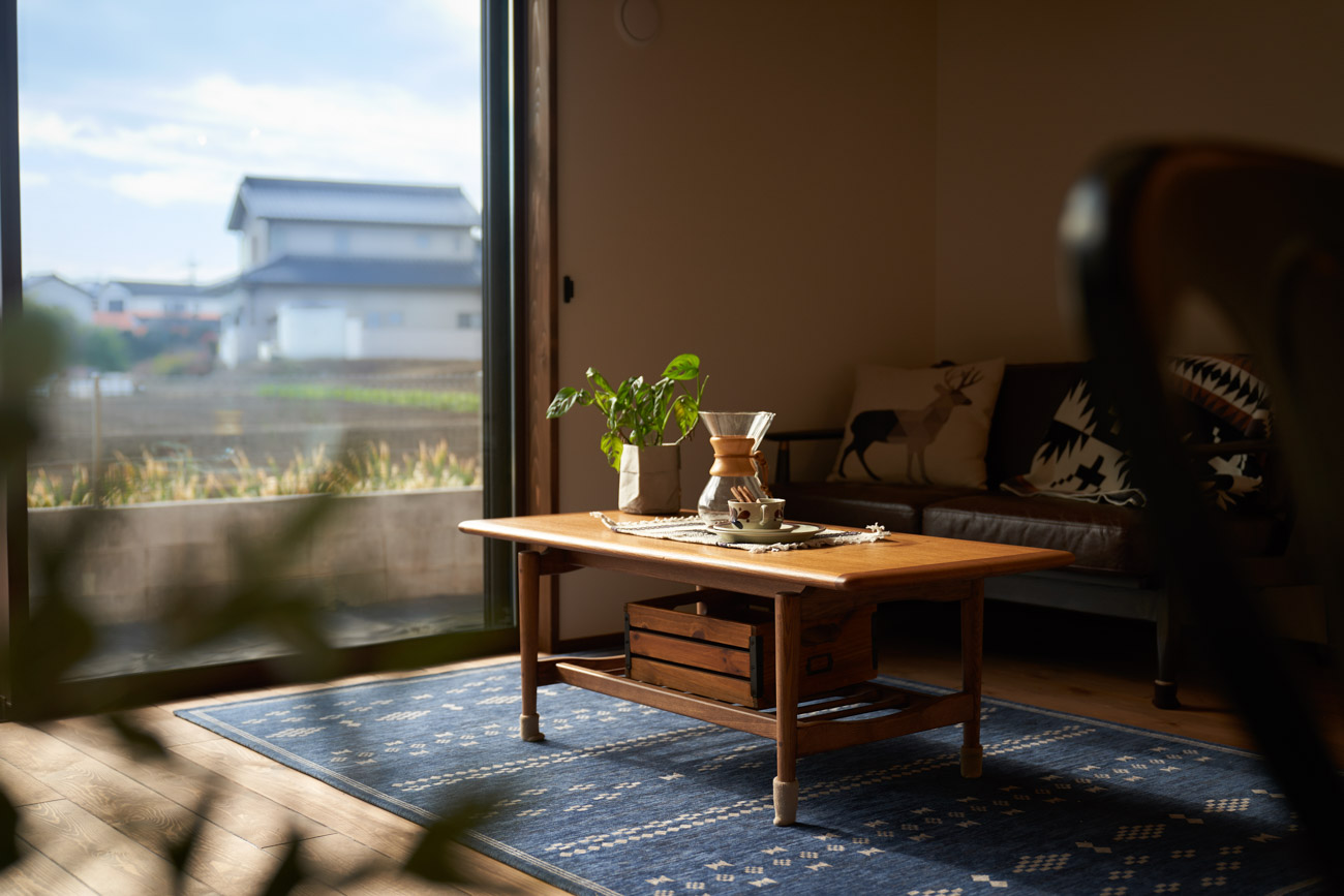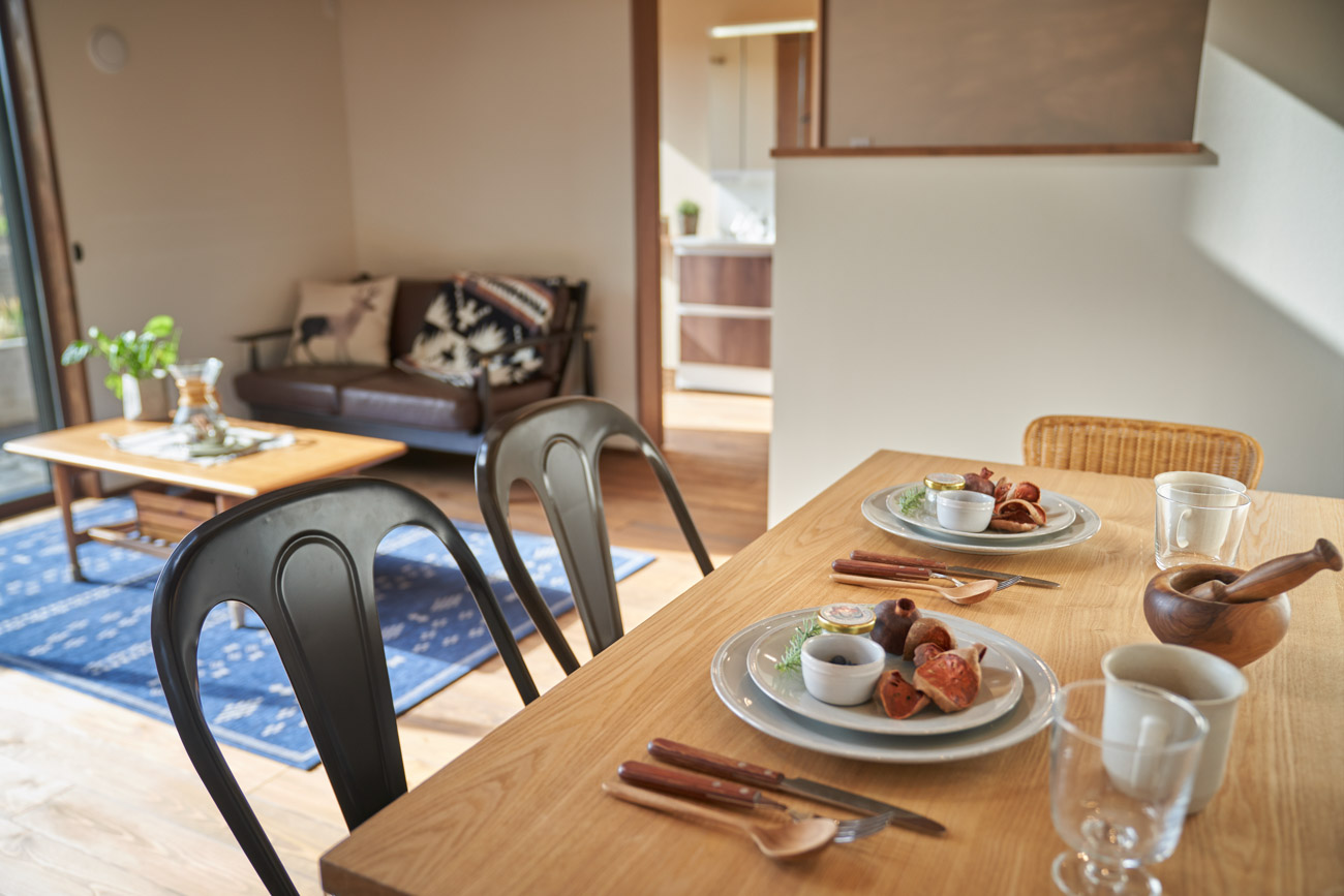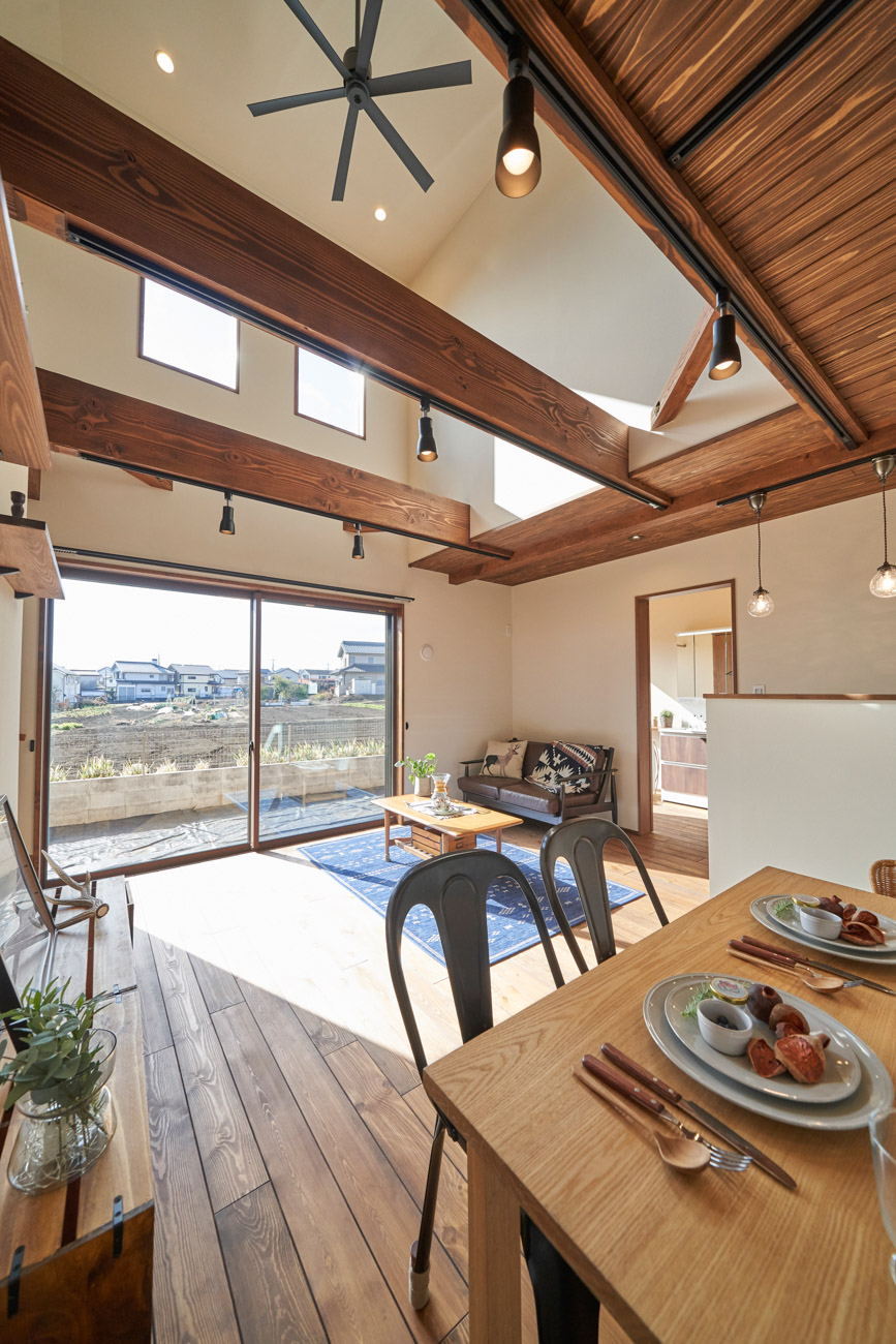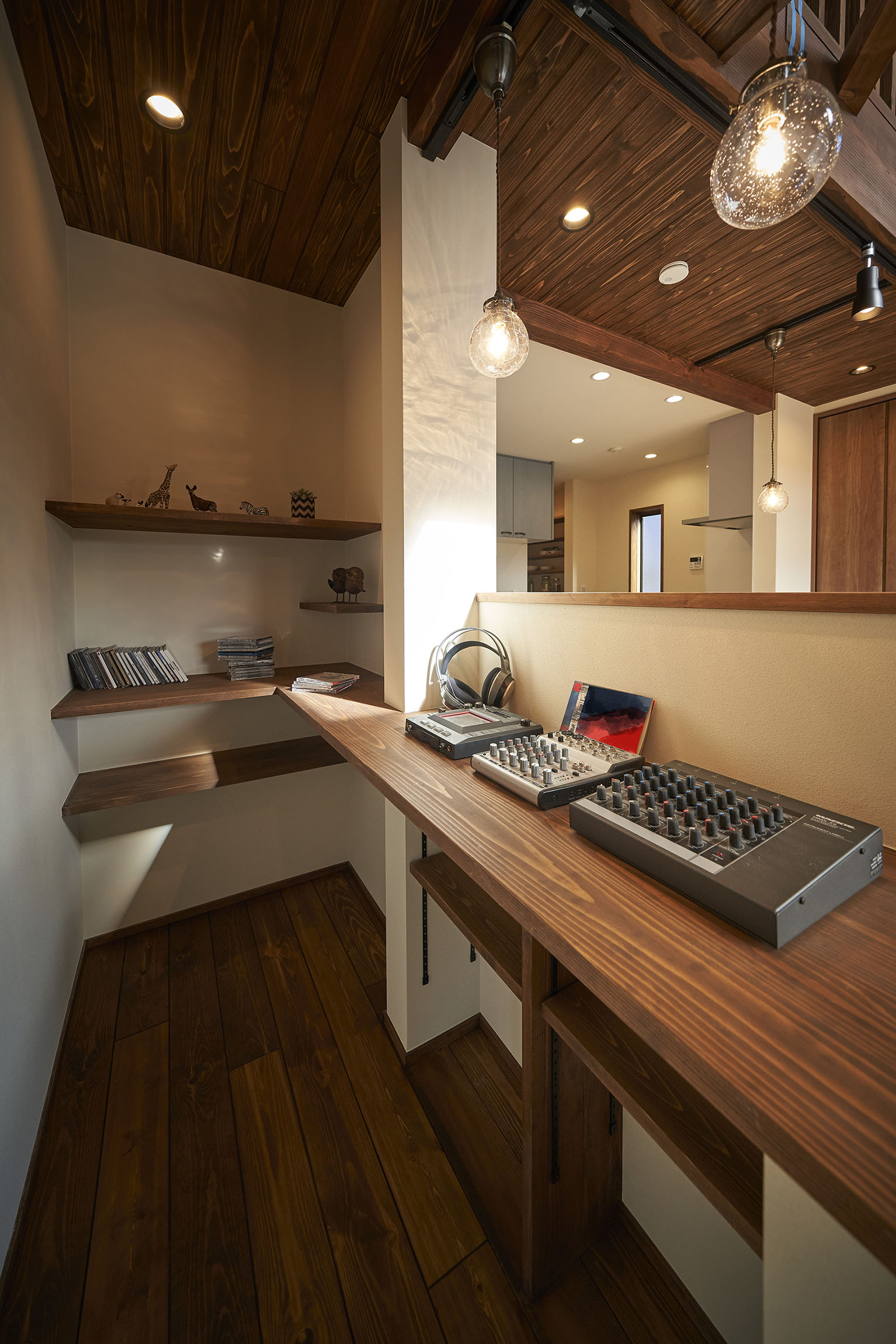 高く明るい吹き抜け。長閑な風景を望む、大きな窓。開放的な空間に、音楽を楽しむためのブースを内包したリビング。音楽好きの建主様が暮らす、大人モダンなお住まい。 借景を望むリビングで音楽を楽しむ時間 無垢を上品に染め上げ、落ち着いたリビング。その一角に作られたDJブース。週末、リビングは趣味の音楽を楽しむ場所へと様変わり。カウンターに配線用の穴を設けてあるため、機材をすっきり収納できます。奥様のご希望で、カウンターキッチンは掃き出し窓の正面に設置。近隣の風景を楽しむことができ、家事の時間もゆったり心地よく過ごせます。 開放的な吹抜け、暮らしやすい設備 吹き抜けの開放感や明るさ、家族の気配を感じるプランニング。共有の本棚や、ランドリールーム、広い玄関収納などの設備の良さ。意匠性の高い、漆喰入り左官仕上げの外壁。住む人のライフスタイルを叶える、多彩なアイテムがたくさん散りばめられています。