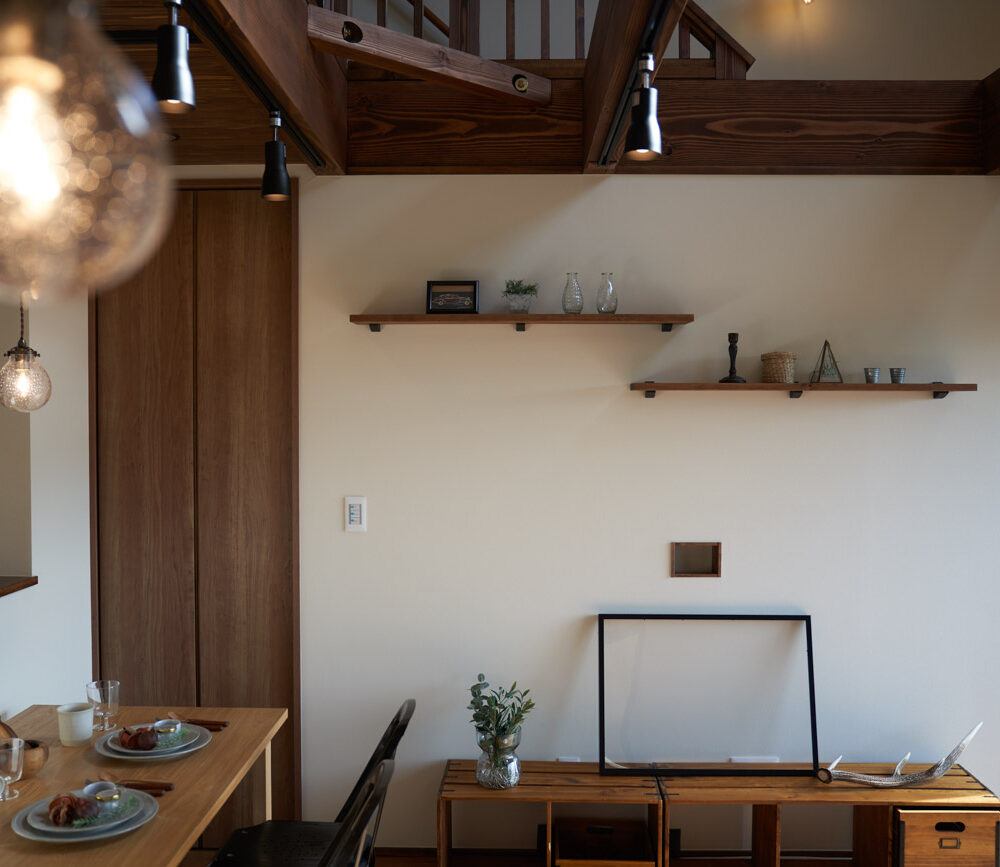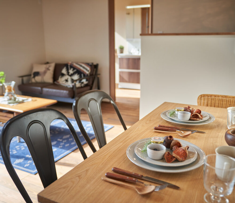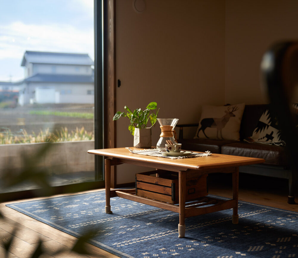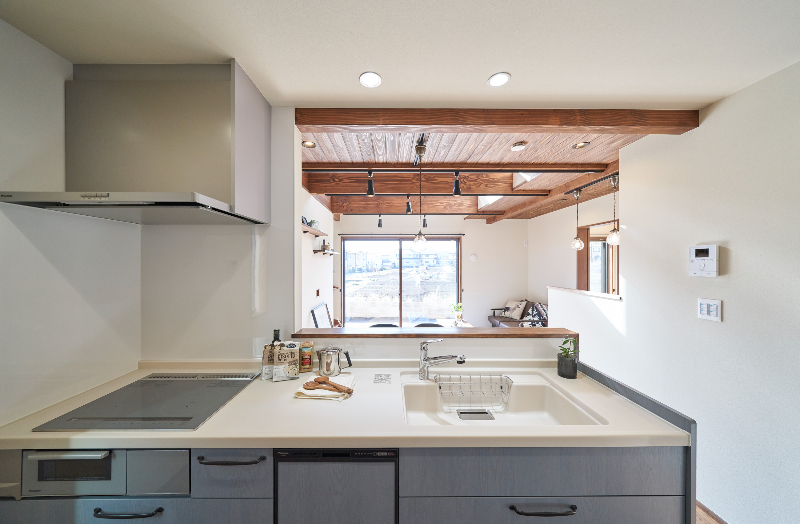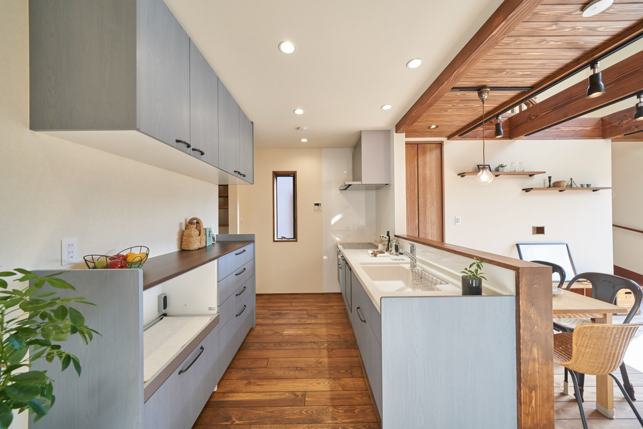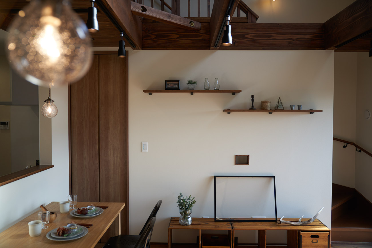 高く明るい吹き抜け。長閑な風景を望む、大きな窓。開放的な空間に、音楽を楽しむためのブースを内包したリビング。音楽好きの建主様が暮らす、大人モダンなお住まい。 借景を望むリビングで音楽を楽しむ時間 無垢を上品に染め上げ、落ち着いたリビング。その一角に作られたDJブース。週末、リビングは趣味の音楽を楽しむ場所へと様変わり。カウンターに配線用の穴を設けてあるため、機材をすっきり収納できます。奥様のご希望で、カウンターキッチンは掃き出し窓の正面に設置。近隣の風景を楽しむことができ、家事の時間もゆったり心地よく過ごせます。 開放的な吹抜け、暮らしやすい設備 吹き抜けの開放感や明るさ、家族の気配を感じるプランニング。共有の本棚や、ランドリールーム、広い玄関収納などの設備の良さ。意匠性の高い、漆喰入り左官仕上げの外壁。住む人のライフスタイルを叶える、多彩なアイテムがたくさん散りばめられています。