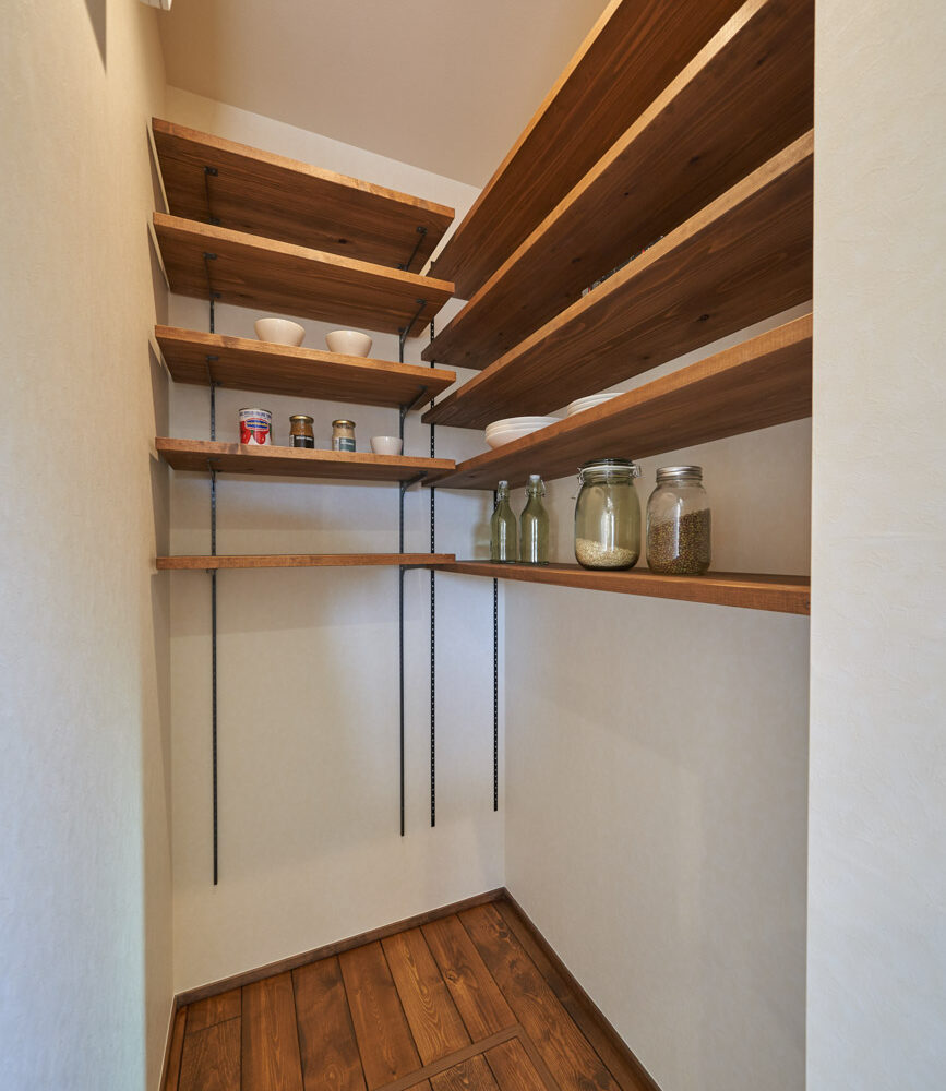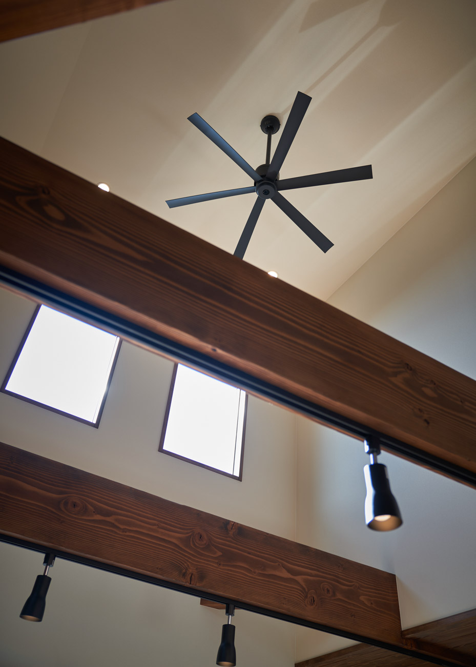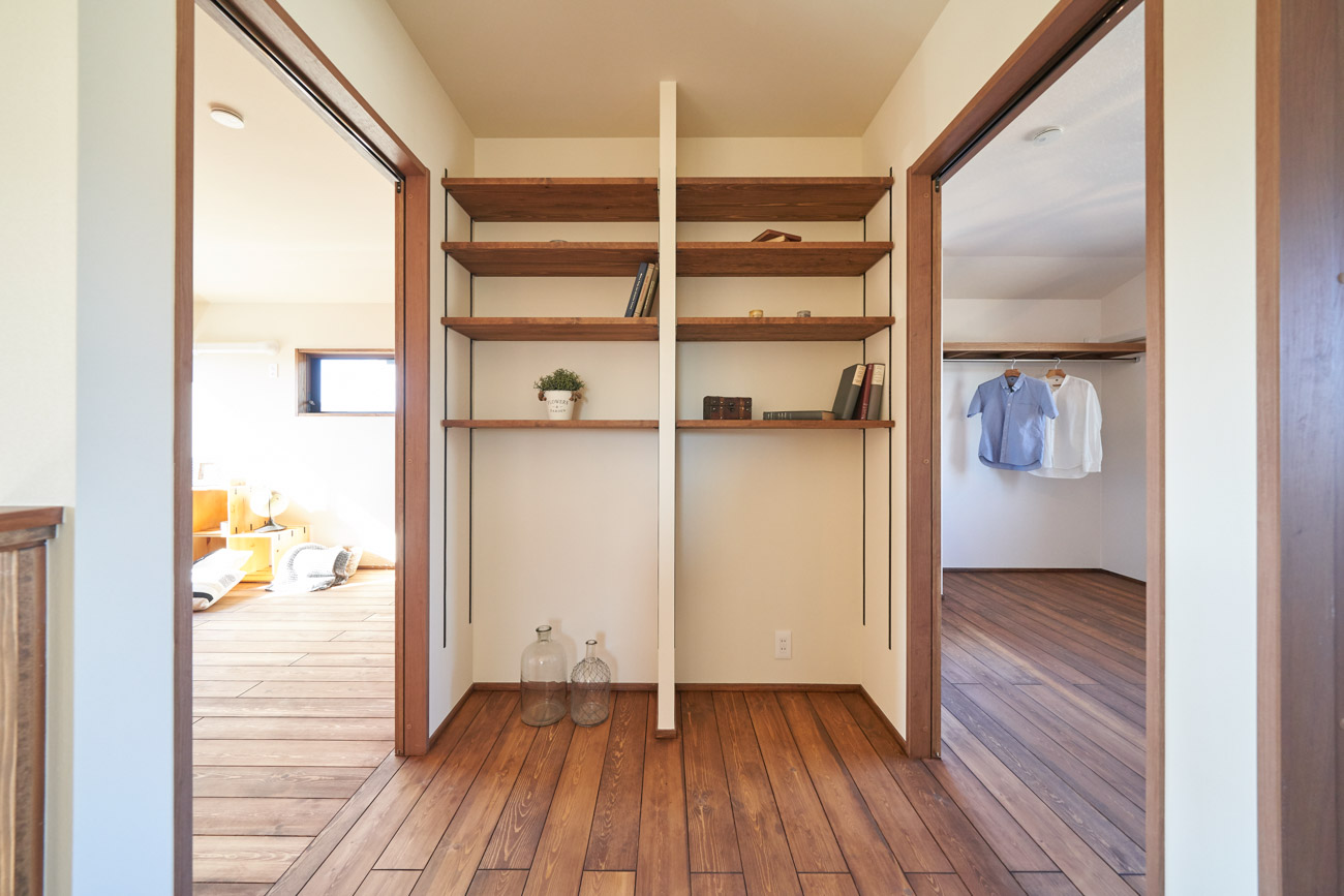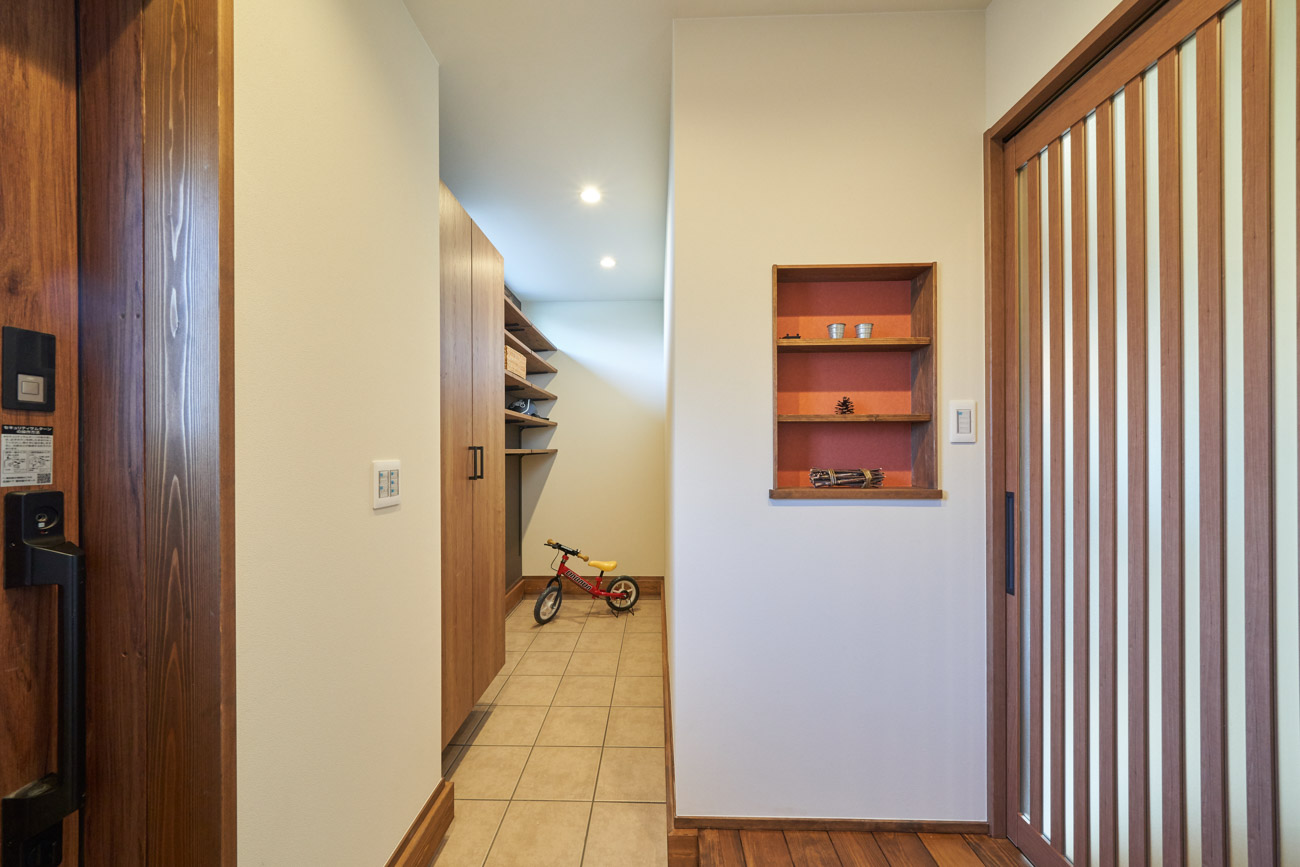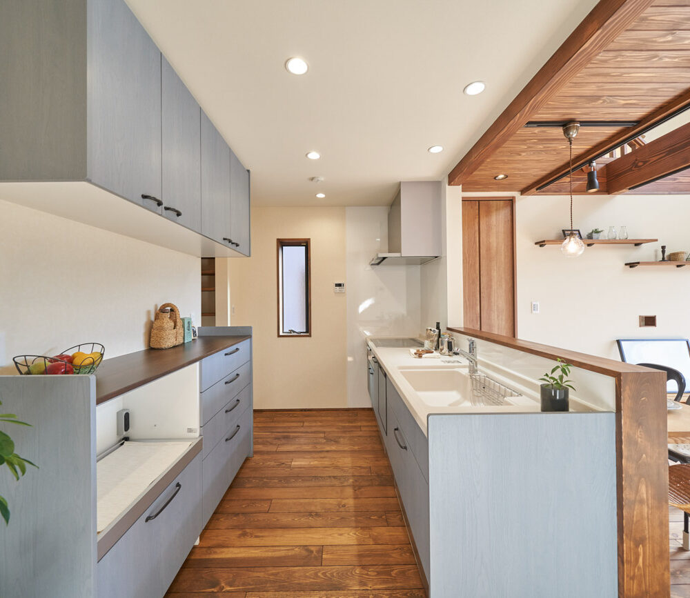 高く明るい吹き抜け。長閑な風景を望む、大きな窓。開放的な空間に、音楽を楽しむためのブースを内包したリビング。音楽好きの建主様が暮らす、大人モダンなお住まい。 借景を望むリビングで音楽を楽しむ時間 無垢を上品に染め上げ、落ち着いたリビング。その一角に作られたDJブース。週末、リビングは趣味の音楽を楽しむ場所へと様変わり。カウンターに配線用の穴を設けてあるため、機材をすっきり収納できます。奥様のご希望で、カウンターキッチンは掃き出し窓の正面に設置。近隣の風景を楽しむことができ、家事の時間もゆったり心地よく過ごせます。 開放的な吹抜け、暮らしやすい設備 吹き抜けの開放感や明るさ、家族の気配を感じるプランニング。共有の本棚や、ランドリールーム、広い玄関収納などの設備の良さ。意匠性の高い、漆喰入り左官仕上げの外壁。住む人のライフスタイルを叶える、多彩なアイテムがたくさん散りばめられています。