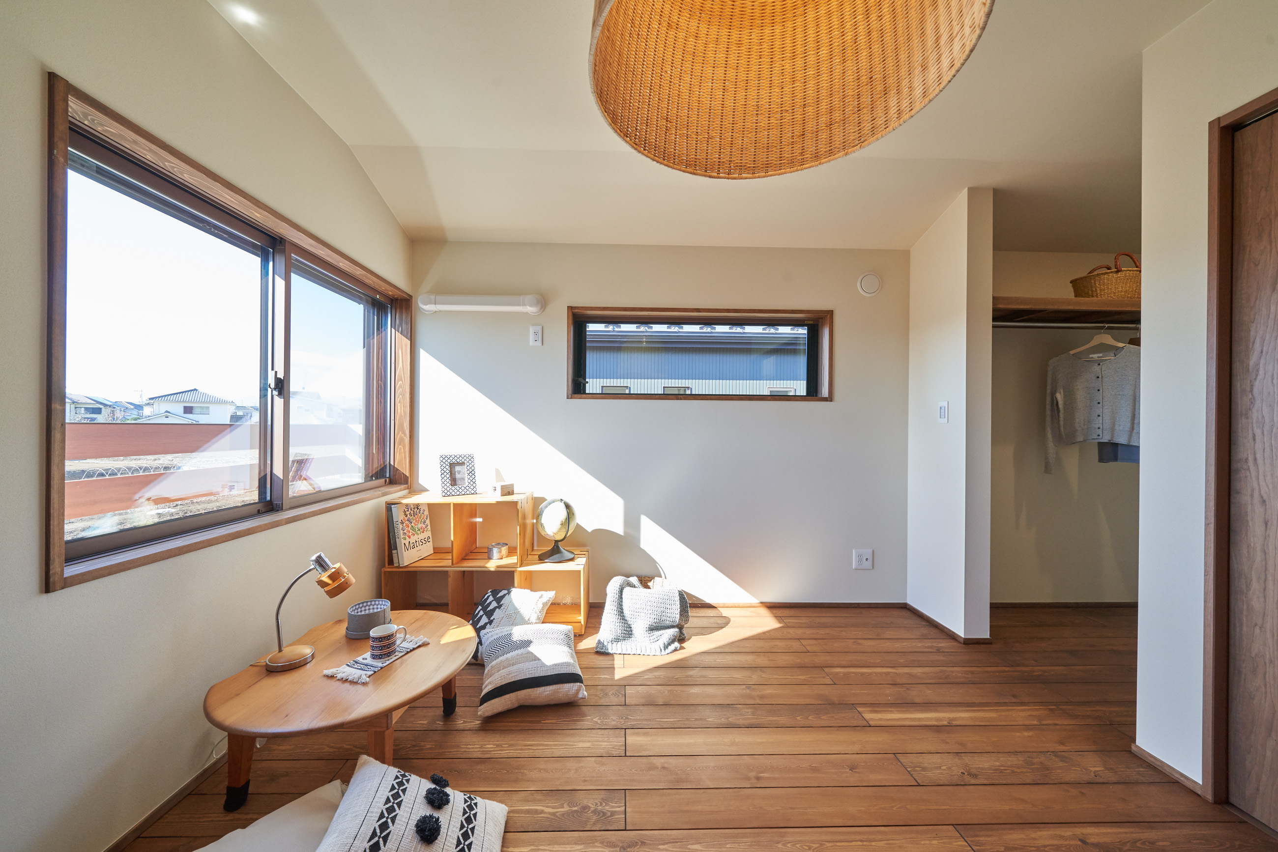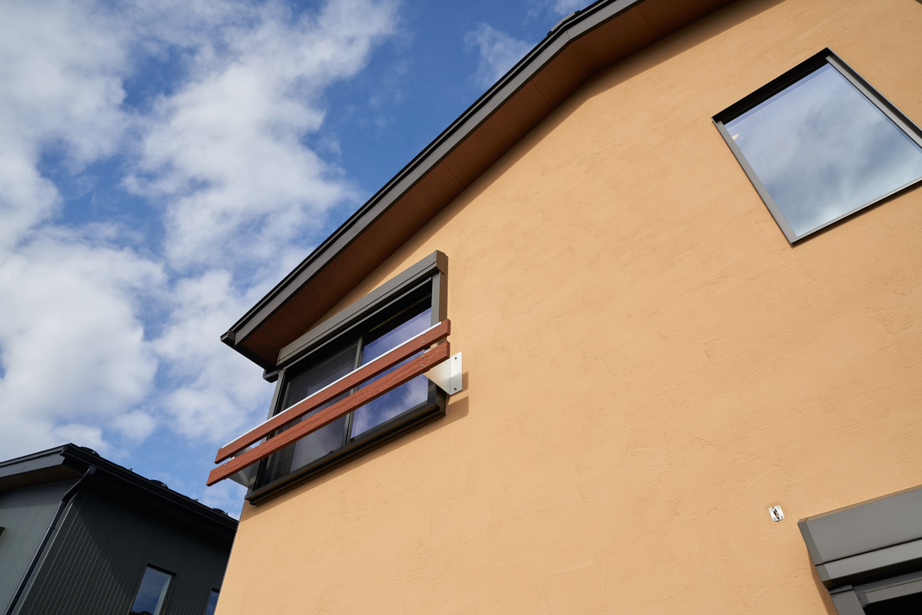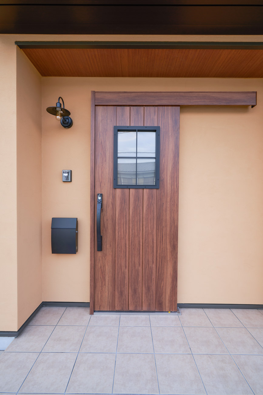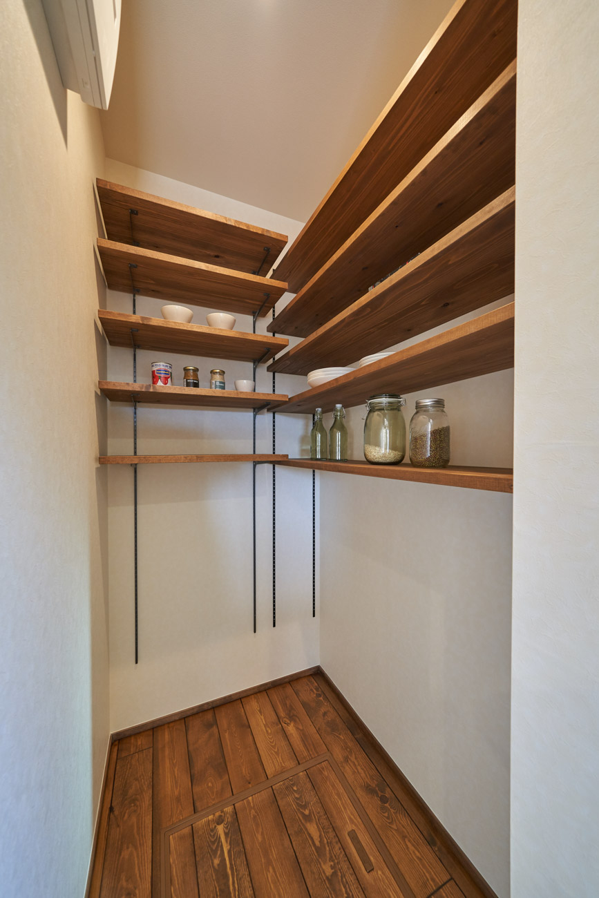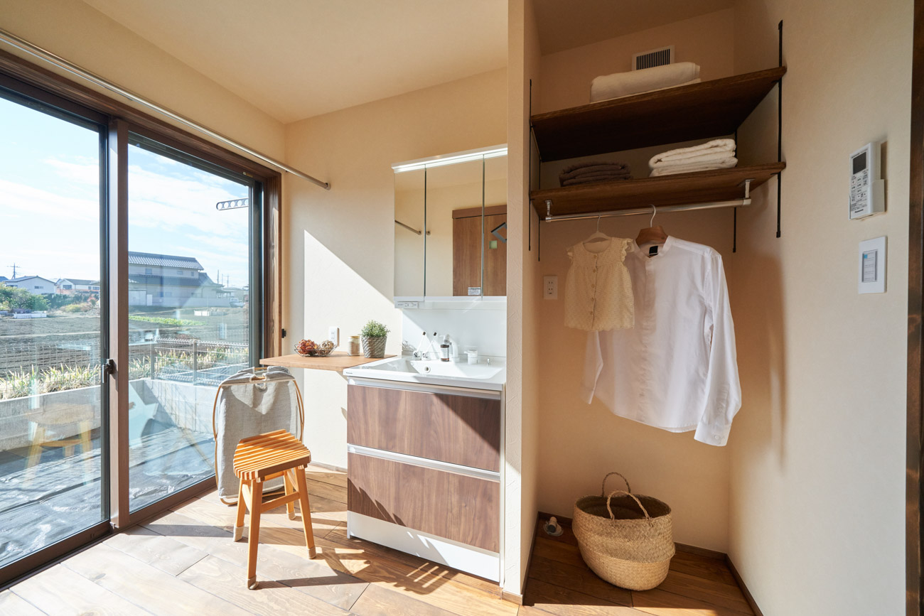 高く明るい吹き抜け。長閑な風景を望む、大きな窓。開放的な空間に、音楽を楽しむためのブースを内包したリビング。音楽好きの建主様が暮らす、大人モダンなお住まい。 借景を望むリビングで音楽を楽しむ時間 無垢を上品に染め上げ、落ち着いたリビング。その一角に作られたDJブース。週末、リビングは趣味の音楽を楽しむ場所へと様変わり。カウンターに配線用の穴を設けてあるため、機材をすっきり収納できます。奥様のご希望で、カウンターキッチンは掃き出し窓の正面に設置。近隣の風景を楽しむことができ、家事の時間もゆったり心地よく過ごせます。 開放的な吹抜け、暮らしやすい設備 吹き抜けの開放感や明るさ、家族の気配を感じるプランニング。共有の本棚や、ランドリールーム、広い玄関収納などの設備の良さ。意匠性の高い、漆喰入り左官仕上げの外壁。住む人のライフスタイルを叶える、多彩なアイテムがたくさん散りばめられています。