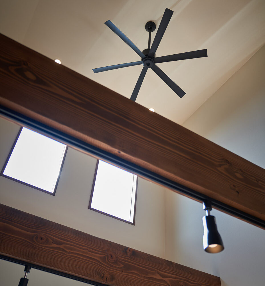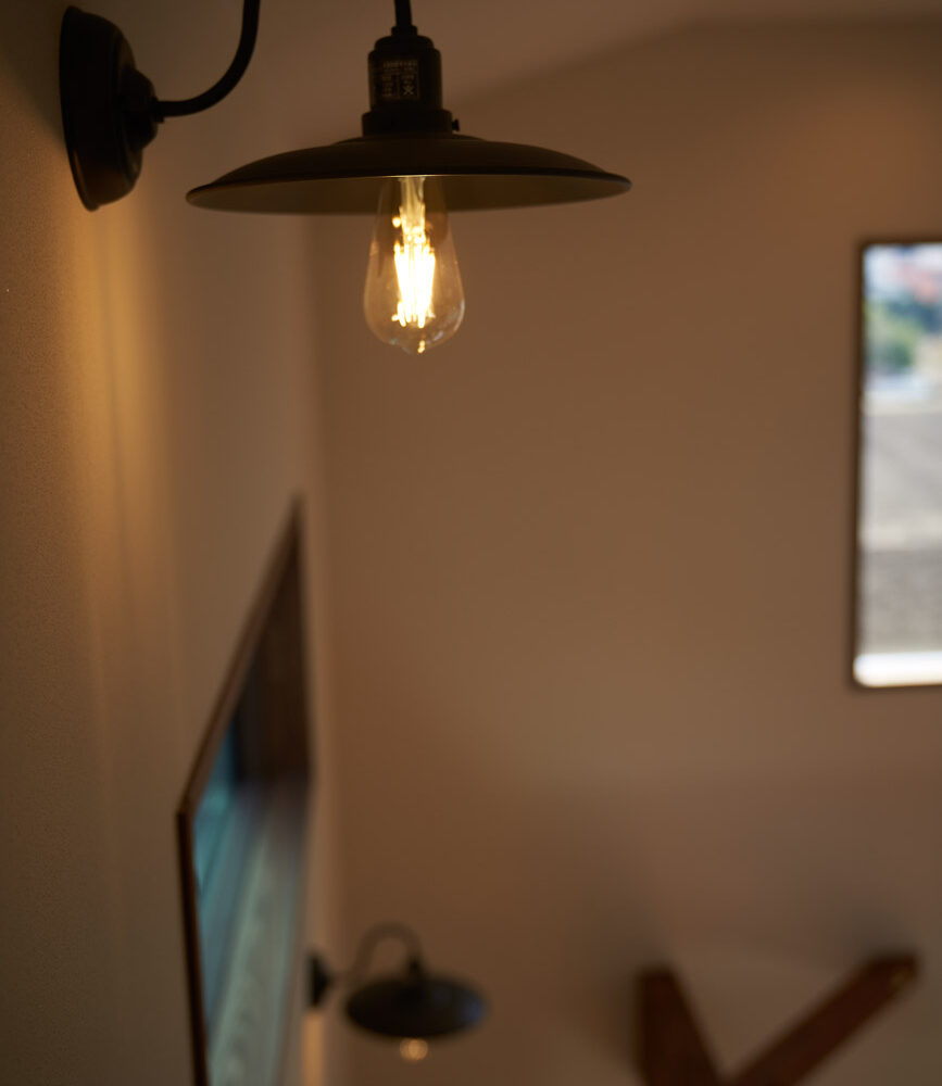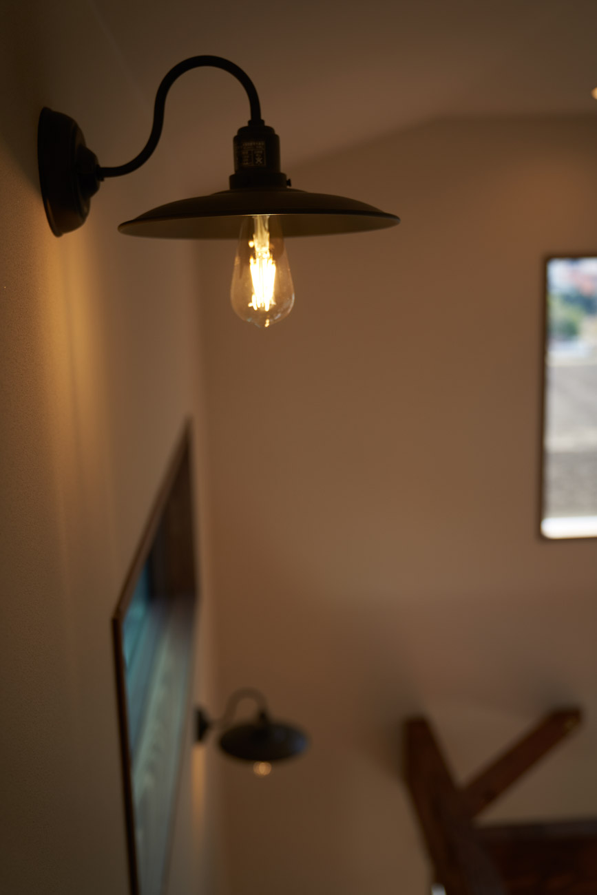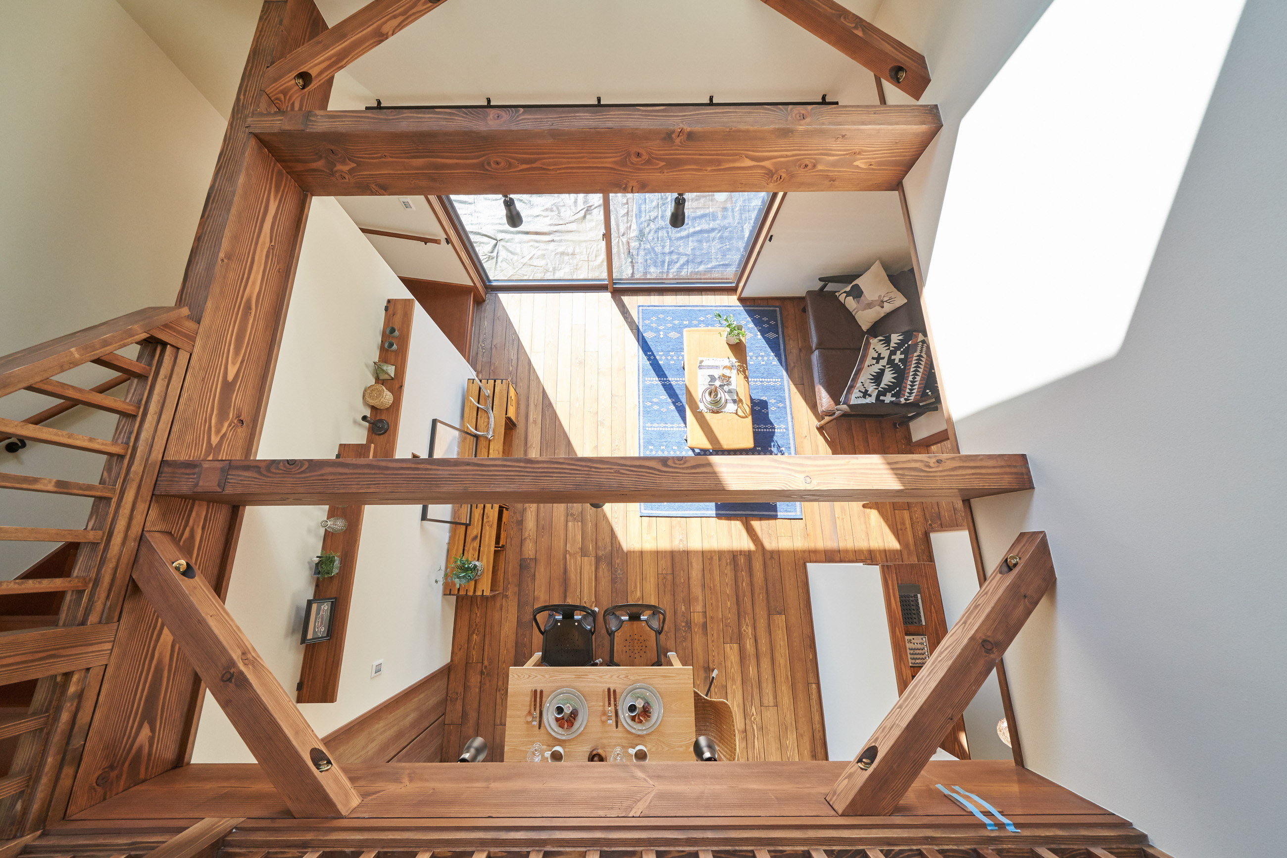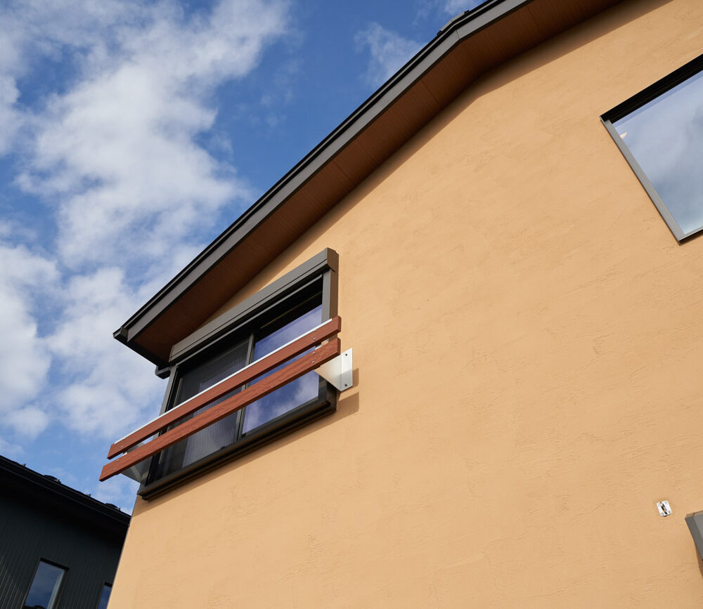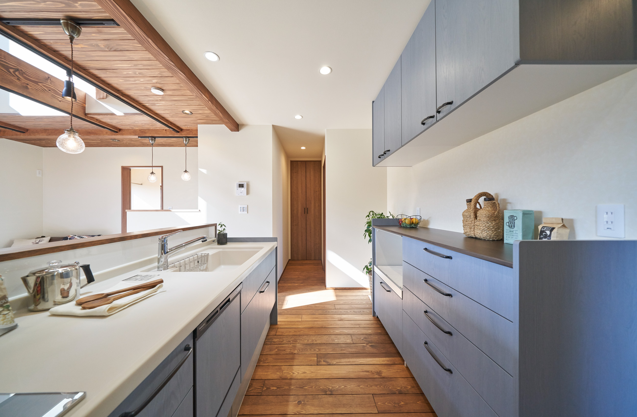 高く明るい吹き抜け。長閑な風景を望む、大きな窓。開放的な空間に、音楽を楽しむためのブースを内包したリビング。音楽好きの建主様が暮らす、大人モダンなお住まい。 借景を望むリビングで音楽を楽しむ時間 無垢を上品に染め上げ、落ち着いたリビング。その一角に作られたDJブース。週末、リビングは趣味の音楽を楽しむ場所へと様変わり。カウンターに配線用の穴を設けてあるため、機材をすっきり収納できます。奥様のご希望で、カウンターキッチンは掃き出し窓の正面に設置。近隣の風景を楽しむことができ、家事の時間もゆったり心地よく過ごせます。 開放的な吹抜け、暮らしやすい設備 吹き抜けの開放感や明るさ、家族の気配を感じるプランニング。共有の本棚や、ランドリールーム、広い玄関収納などの設備の良さ。意匠性の高い、漆喰入り左官仕上げの外壁。住む人のライフスタイルを叶える、多彩なアイテムがたくさん散りばめられています。