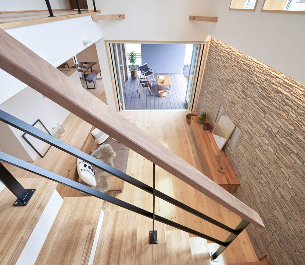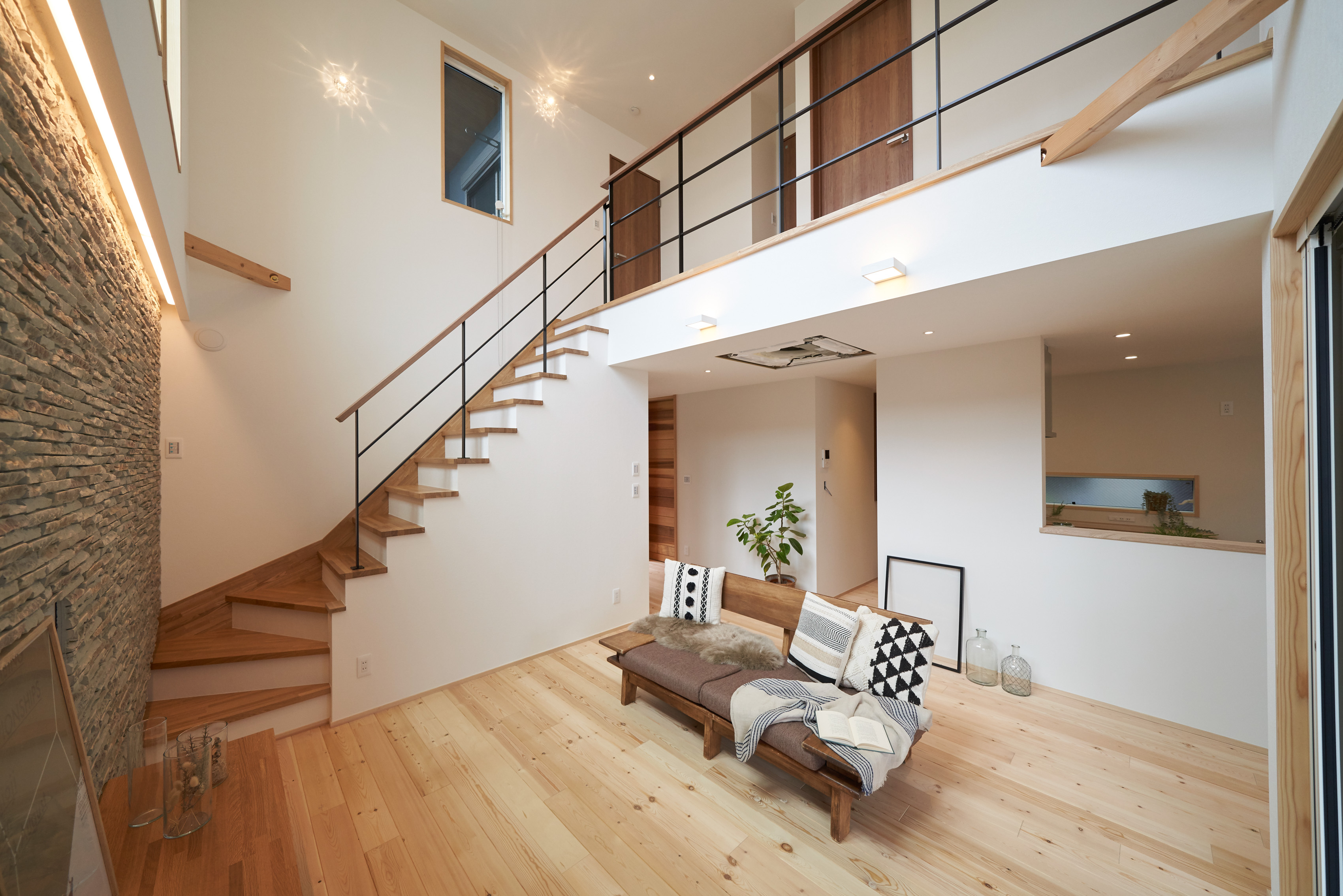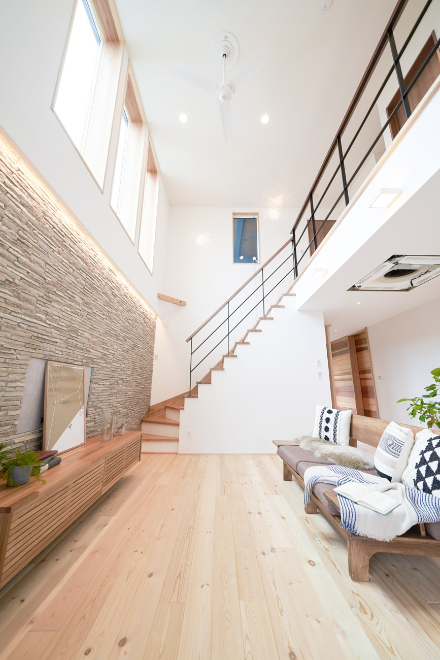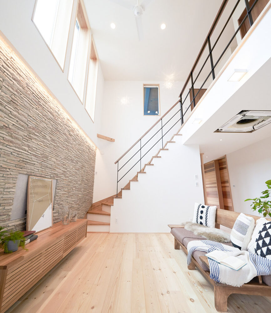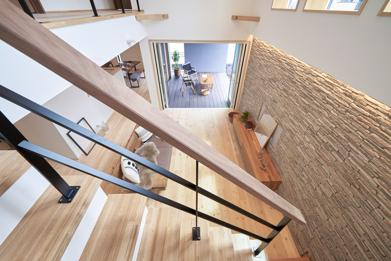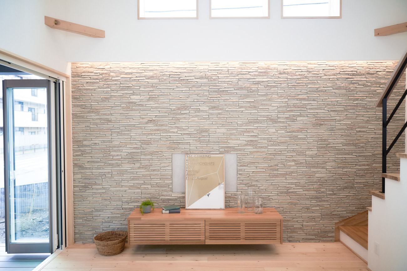 デザイン・仕様・素材。一つ一つのこだわりを散りばめ、趣向を凝らしたお住まい。壁と繋がるように仕上げたレッドシダーの造作引き戸。深くシャープな質感が印象的な石積み調のアクセントウォール。職人が丹精込めた家具や建具。それぞれがリズムよく配置され、奥行きや高さの工夫で心地よい空間を実現したお住まい。 質感と配置の工夫で 心地よい空間演出。 リビングのTVボードの壁には、外壁材としても使用される、天然石風の壁材を使用。意匠性が高く深い質感が上質な空間を演出してくれます。吹き抜けのあるリビングと、緩く分けられたダイニングキッチンの配置で奥行きと高さが生まれ、より広さを体感できます。空間が繋がるように配置されたアウトドアリビングは、外壁を上手に配置する事で、風の流れは遮らず、道路からの目線は遮る工夫がされています。 職人と設計士のコラボレーション。 オリジナルの建具や家具。 レッドシダーの造作引き戸、ウォールナットの階段手すりやトイレの造作棚、床受けのないすっきりとした仕切り格子など、自由設計ならではの造作アイテムが多数。