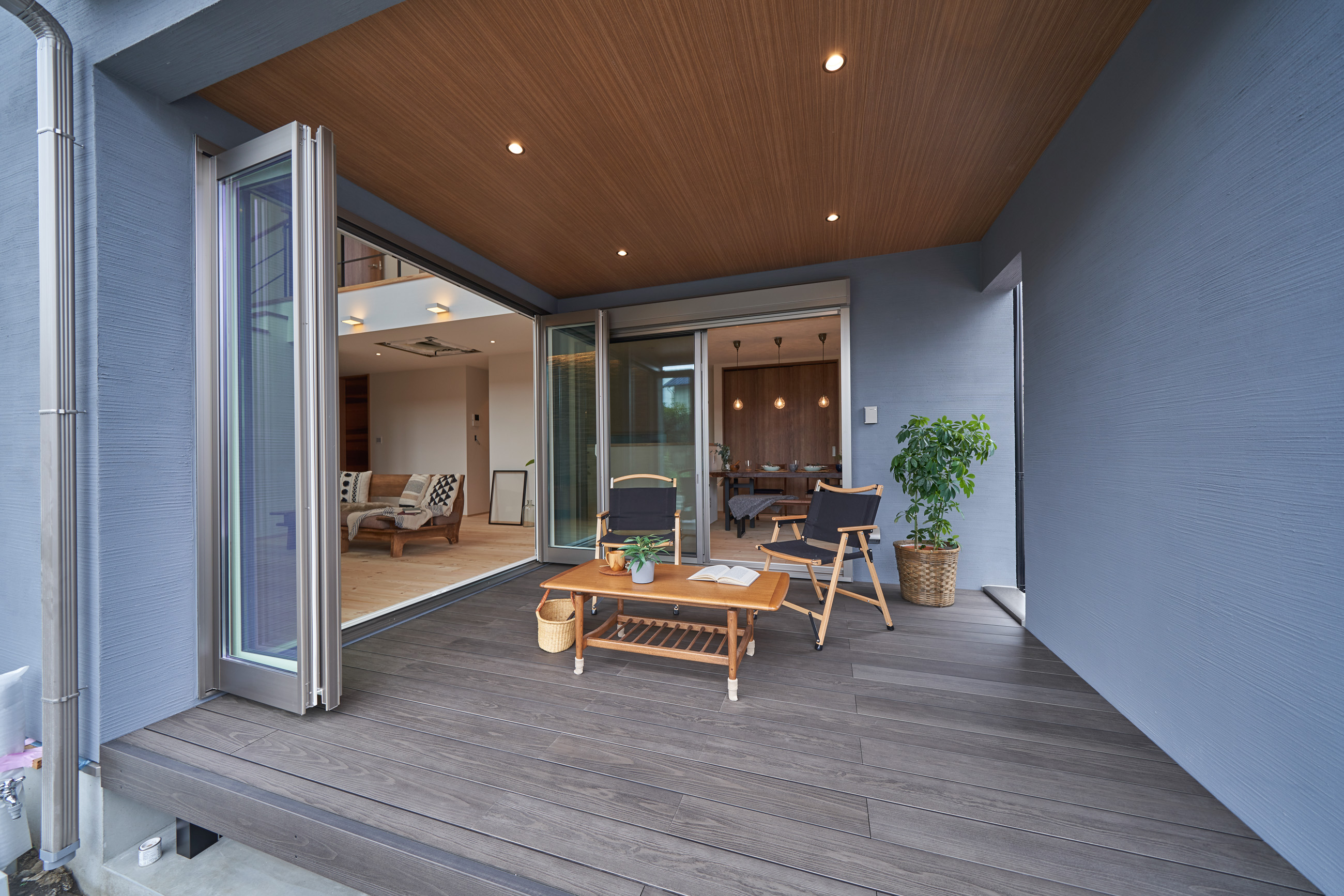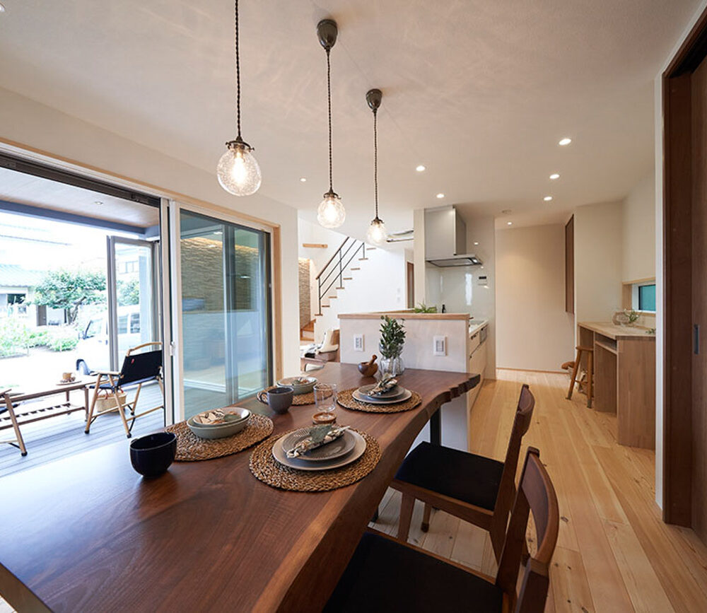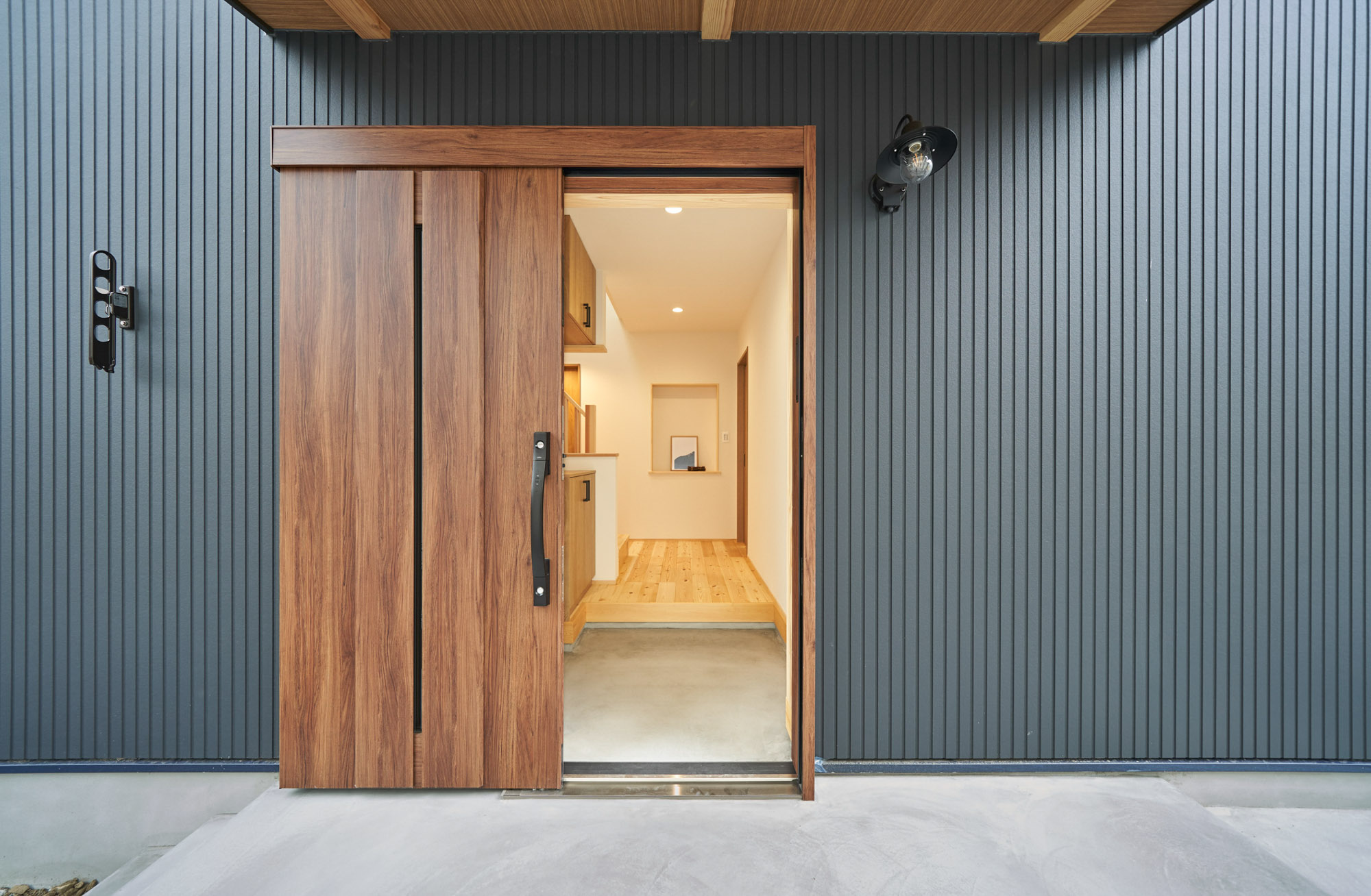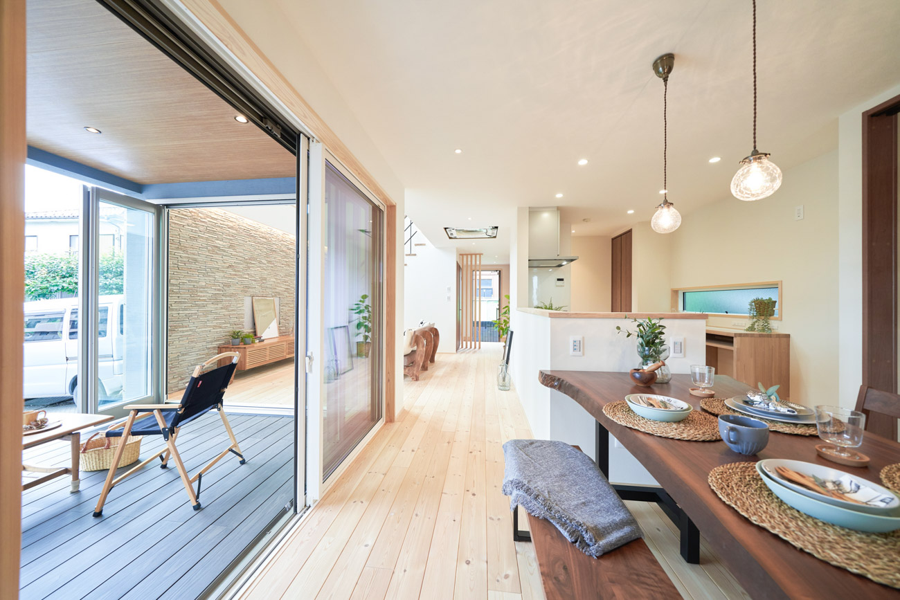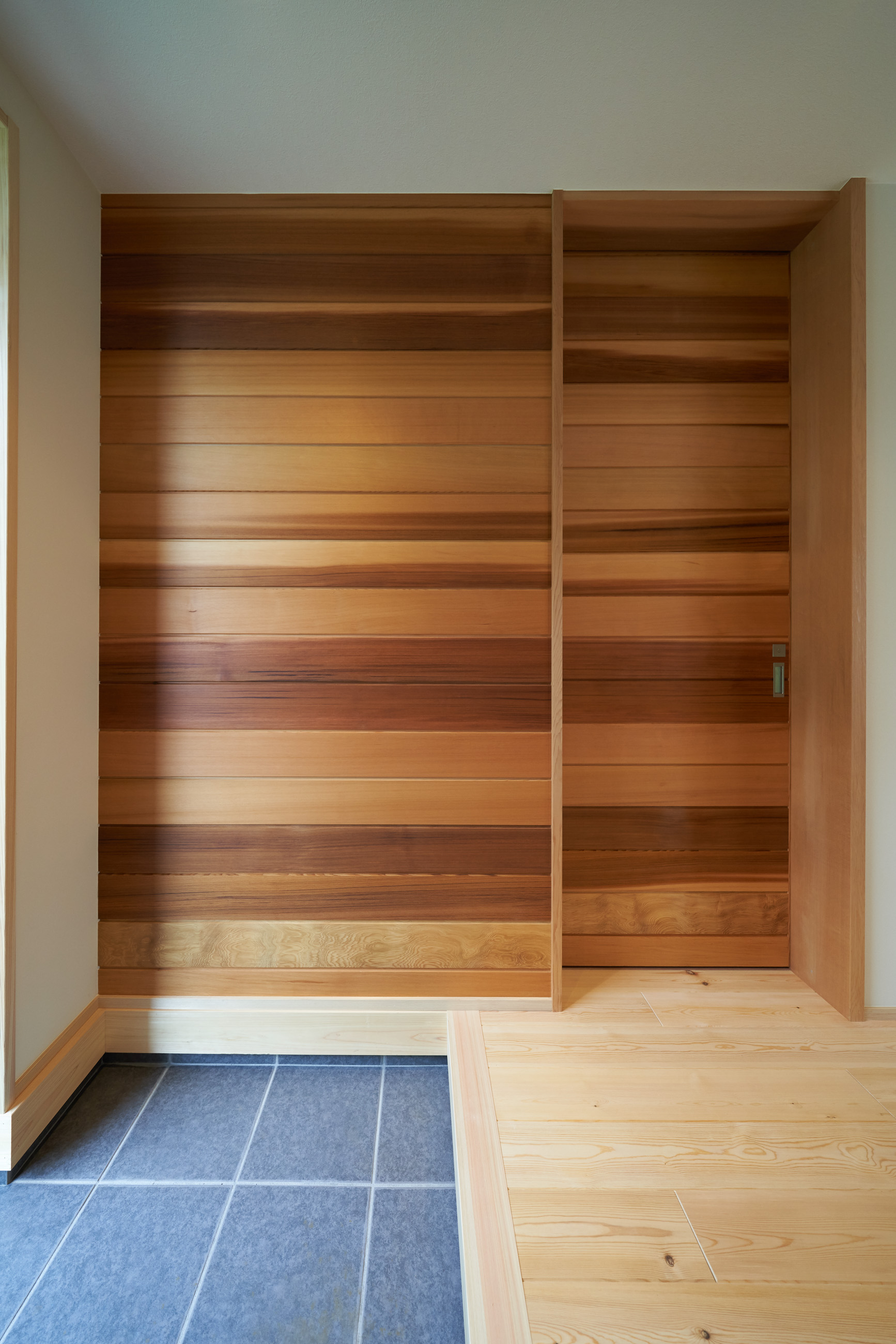 デザイン・仕様・素材。一つ一つのこだわりを散りばめ、趣向を凝らしたお住まい。壁と繋がるように仕上げたレッドシダーの造作引き戸。深くシャープな質感が印象的な石積み調のアクセントウォール。職人が丹精込めた家具や建具。それぞれがリズムよく配置され、奥行きや高さの工夫で心地よい空間を実現したお住まい。 質感と配置の工夫で 心地よい空間演出。 リビングのTVボードの壁には、外壁材としても使用される、天然石風の壁材を使用。意匠性が高く深い質感が上質な空間を演出してくれます。吹き抜けのあるリビングと、緩く分けられたダイニングキッチンの配置で奥行きと高さが生まれ、より広さを体感できます。空間が繋がるように配置されたアウトドアリビングは、外壁を上手に配置する事で、風の流れは遮らず、道路からの目線は遮る工夫がされています。 職人と設計士のコラボレーション。 オリジナルの建具や家具。 レッドシダーの造作引き戸、ウォールナットの階段手すりやトイレの造作棚、床受けのないすっきりとした仕切り格子など、自由設計ならではの造作アイテムが多数。