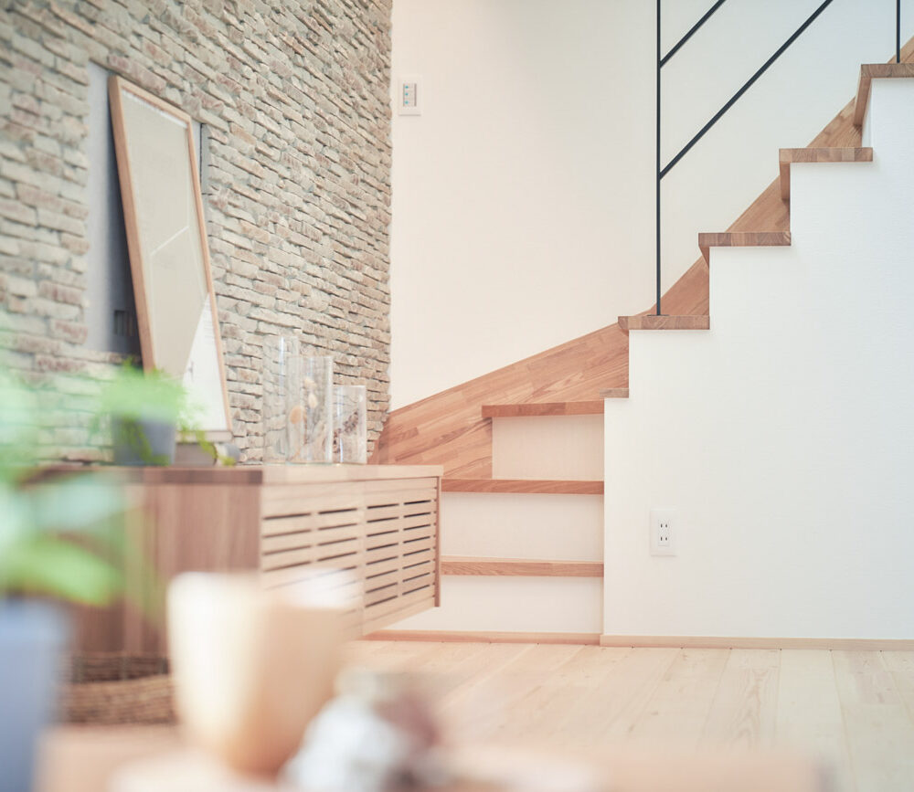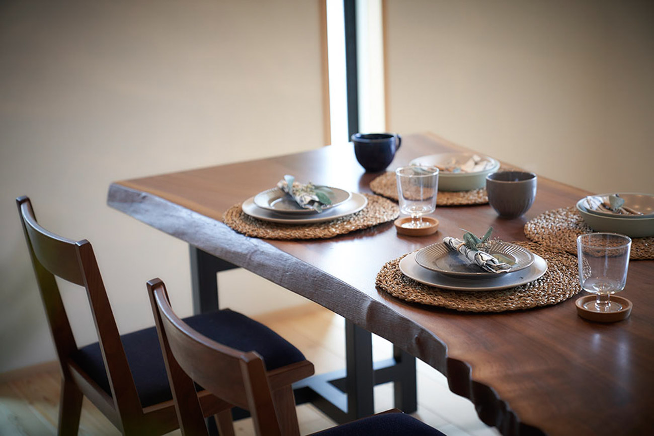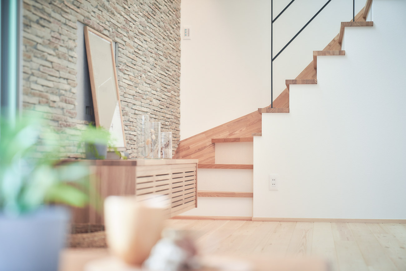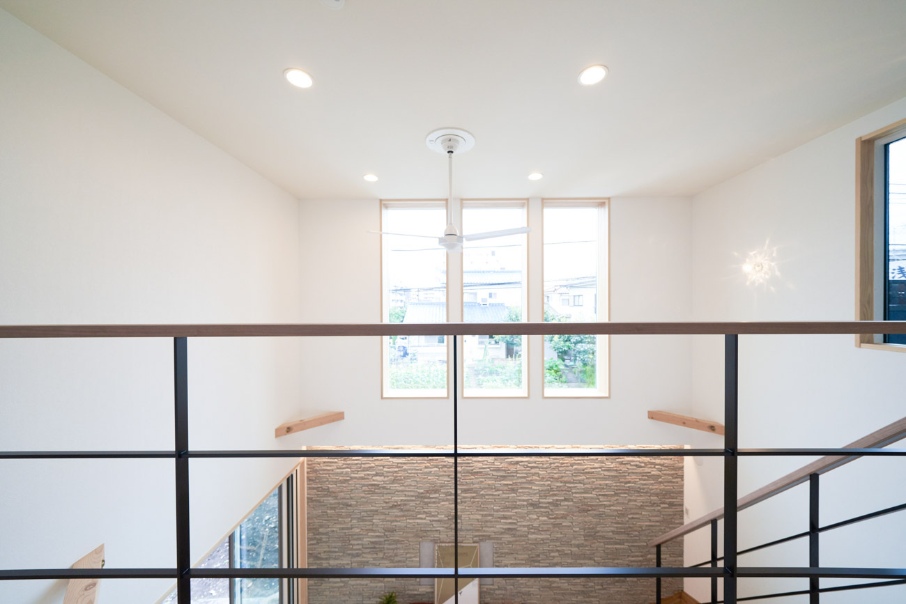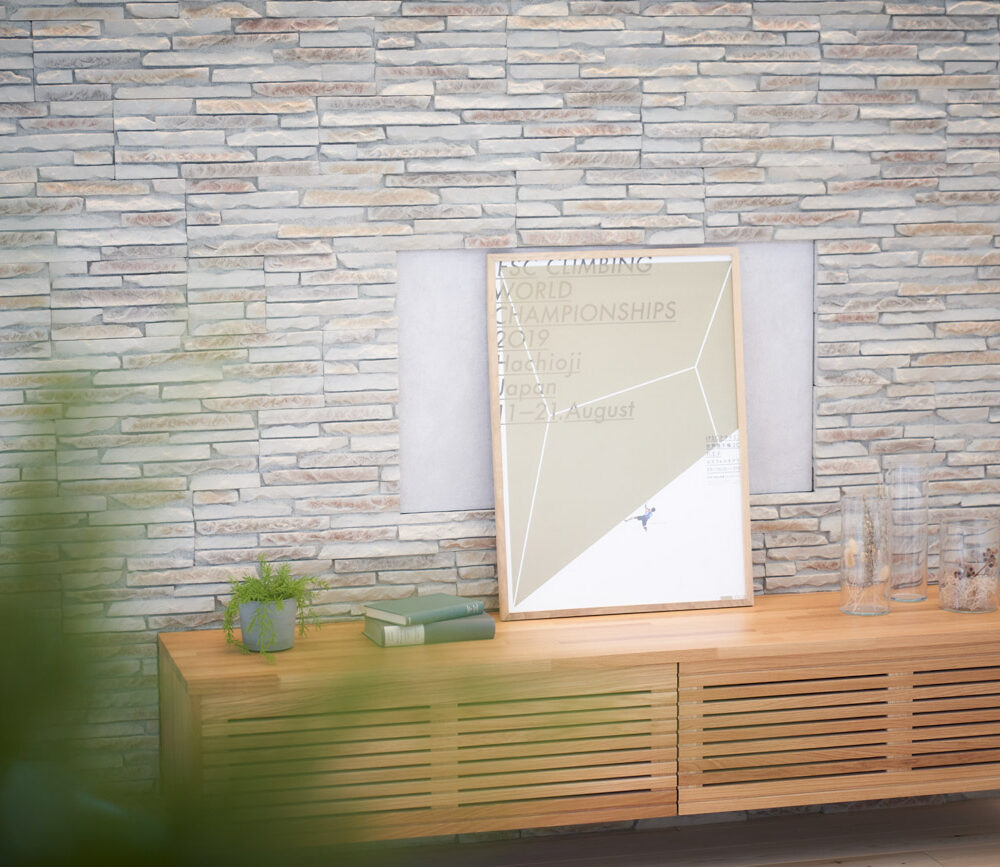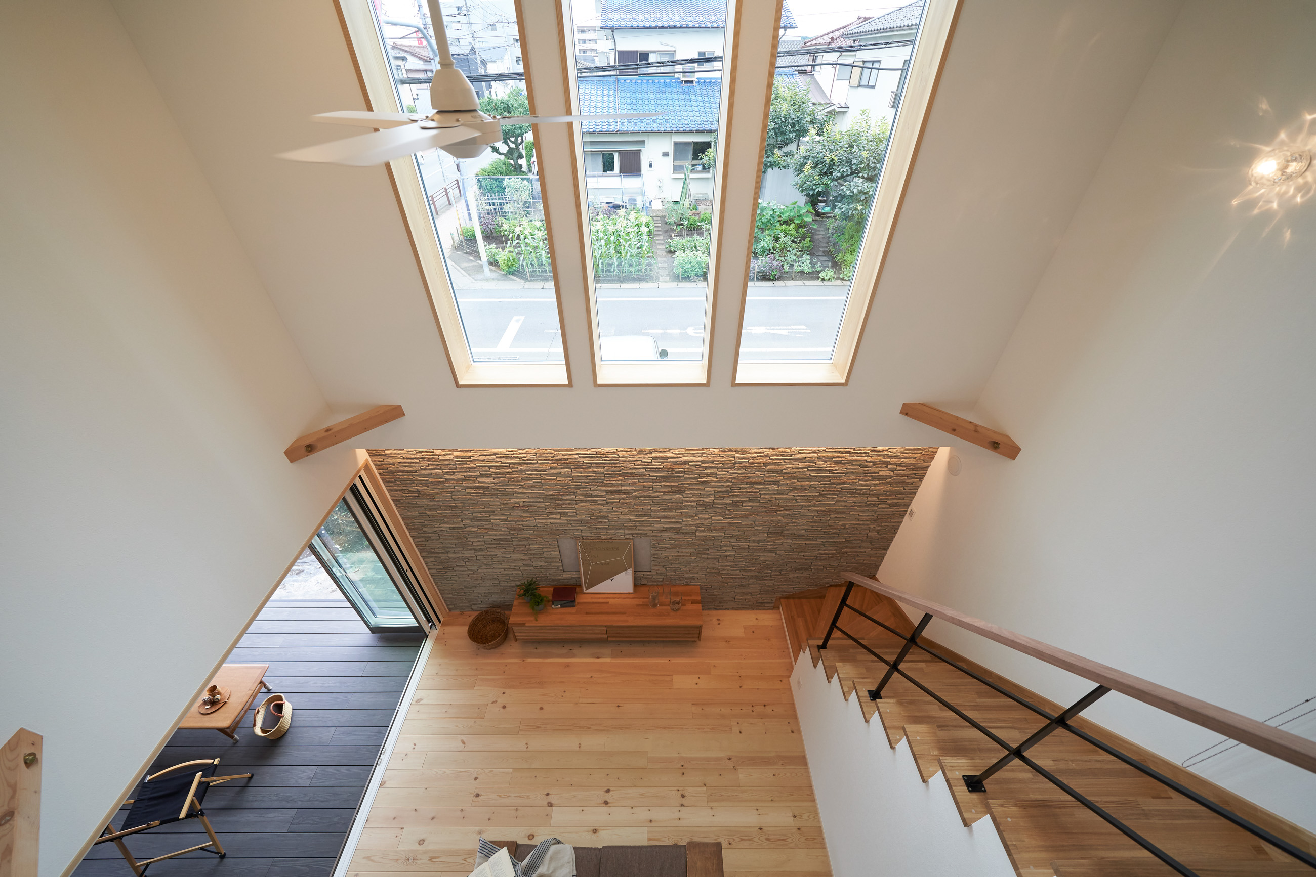 デザイン・仕様・素材。一つ一つのこだわりを散りばめ、趣向を凝らしたお住まい。壁と繋がるように仕上げたレッドシダーの造作引き戸。深くシャープな質感が印象的な石積み調のアクセントウォール。職人が丹精込めた家具や建具。それぞれがリズムよく配置され、奥行きや高さの工夫で心地よい空間を実現したお住まい。 質感と配置の工夫で 心地よい空間演出。 リビングのTVボードの壁には、外壁材としても使用される、天然石風の壁材を使用。意匠性が高く深い質感が上質な空間を演出してくれます。吹き抜けのあるリビングと、緩く分けられたダイニングキッチンの配置で奥行きと高さが生まれ、より広さを体感できます。空間が繋がるように配置されたアウトドアリビングは、外壁を上手に配置する事で、風の流れは遮らず、道路からの目線は遮る工夫がされています。 職人と設計士のコラボレーション。 オリジナルの建具や家具。 レッドシダーの造作引き戸、ウォールナットの階段手すりやトイレの造作棚、床受けのないすっきりとした仕切り格子など、自由設計ならではの造作アイテムが多数。