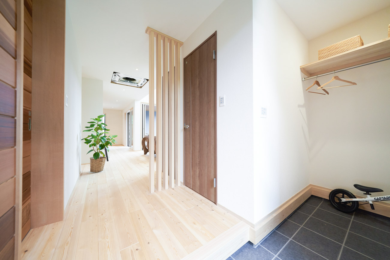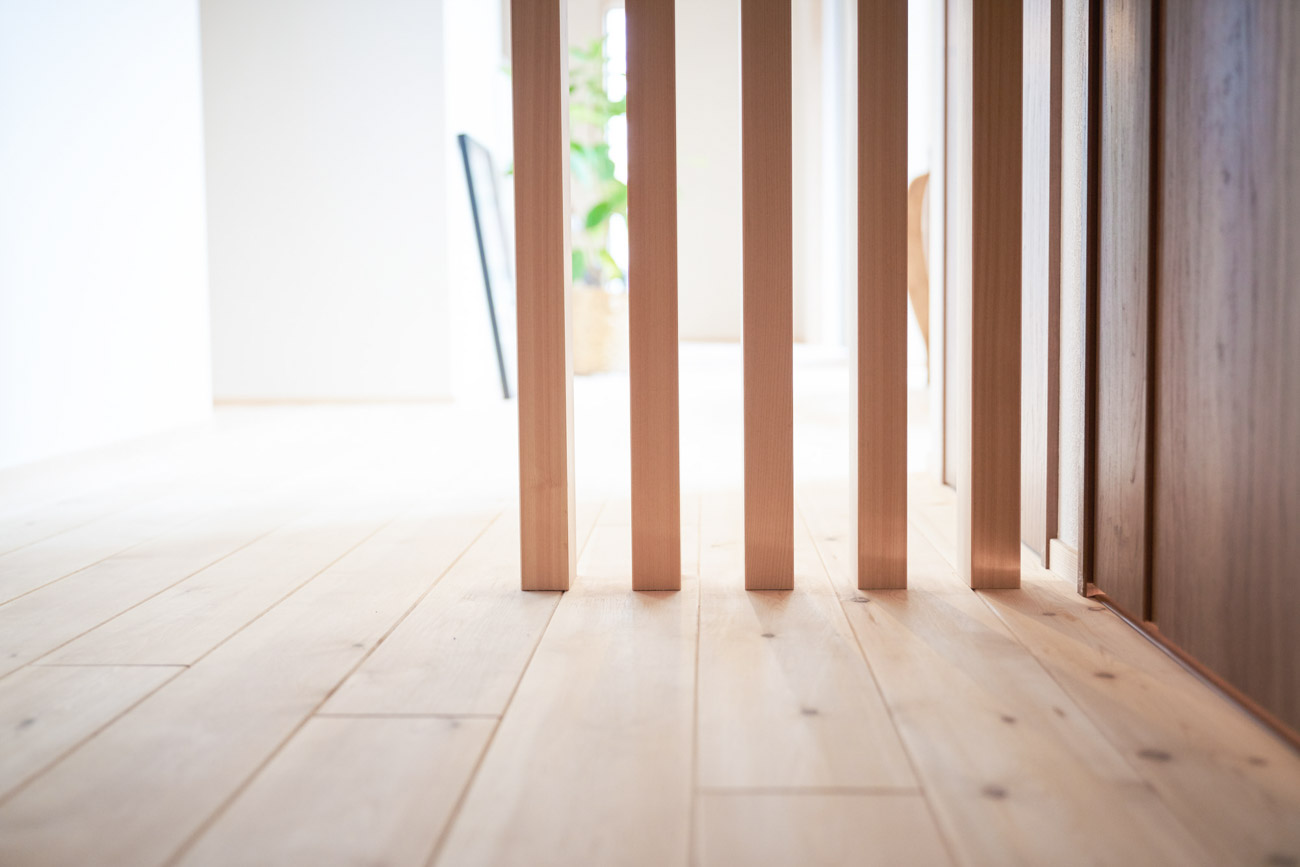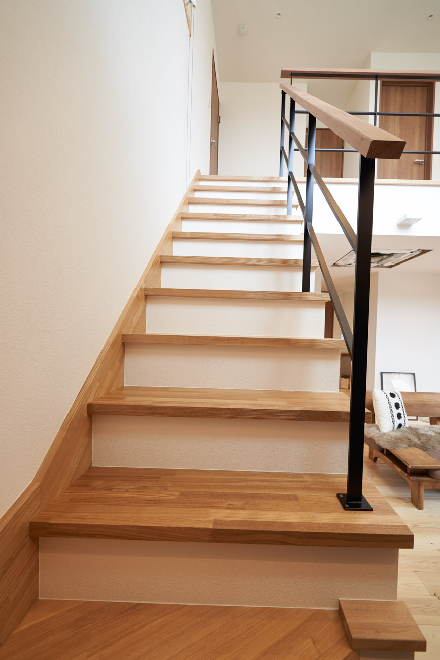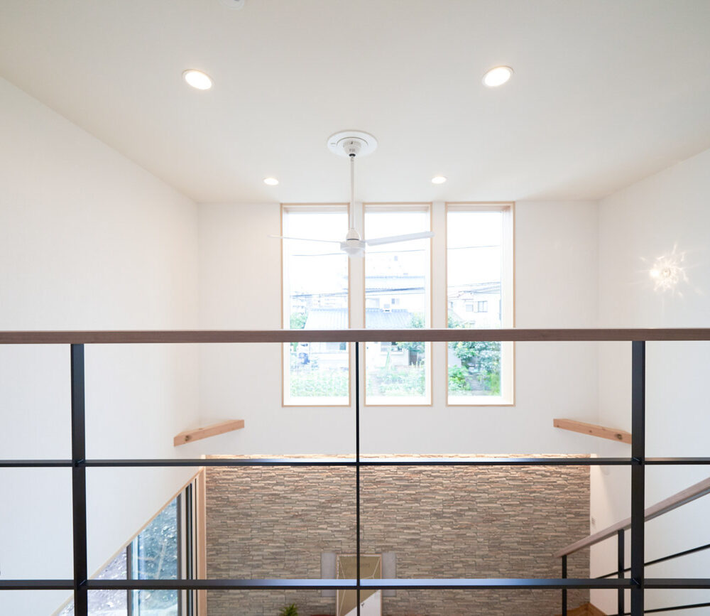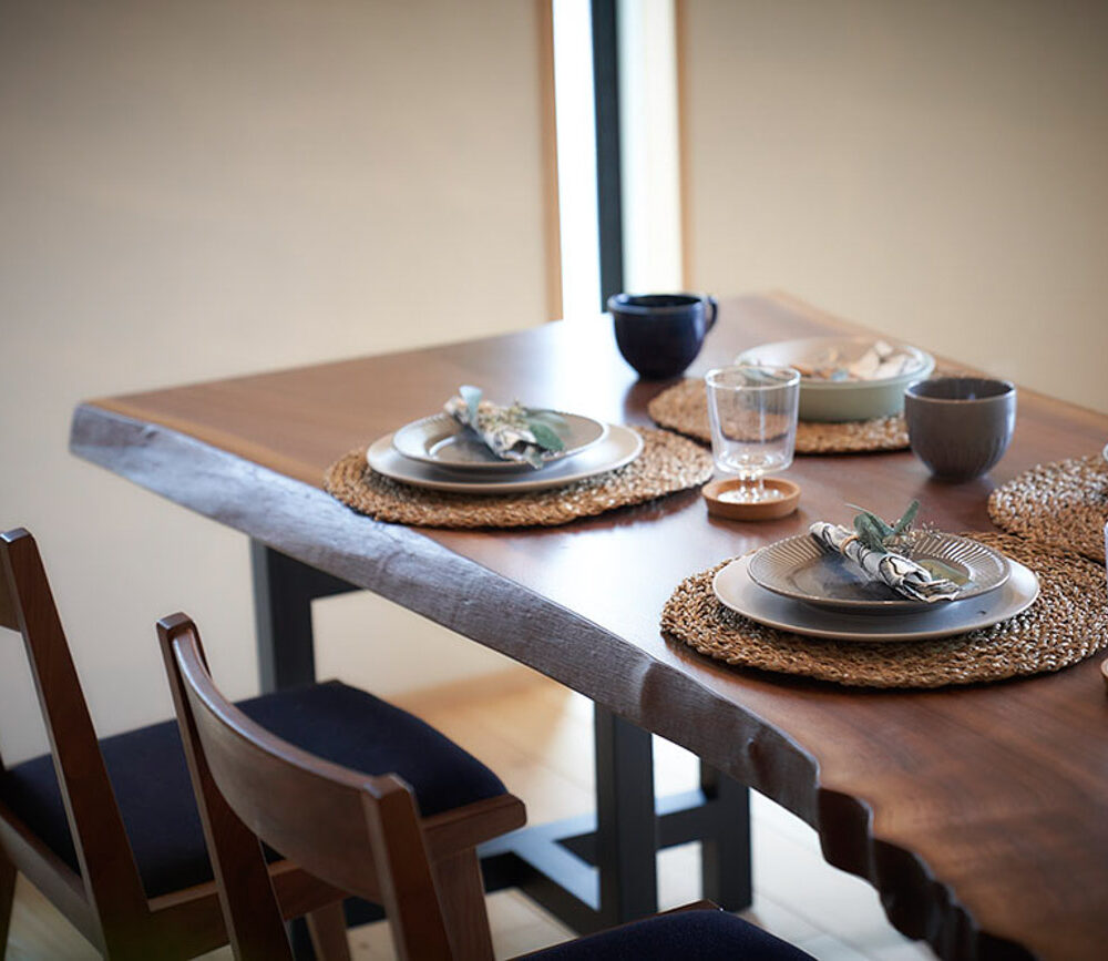 デザイン・仕様・素材。一つ一つのこだわりを散りばめ、趣向を凝らしたお住まい。壁と繋がるように仕上げたレッドシダーの造作引き戸。深くシャープな質感が印象的な石積み調のアクセントウォール。職人が丹精込めた家具や建具。それぞれがリズムよく配置され、奥行きや高さの工夫で心地よい空間を実現したお住まい。 質感と配置の工夫で 心地よい空間演出。 リビングのTVボードの壁には、外壁材としても使用される、天然石風の壁材を使用。意匠性が高く深い質感が上質な空間を演出してくれます。吹き抜けのあるリビングと、緩く分けられたダイニングキッチンの配置で奥行きと高さが生まれ、より広さを体感できます。空間が繋がるように配置されたアウトドアリビングは、外壁を上手に配置する事で、風の流れは遮らず、道路からの目線は遮る工夫がされています。 職人と設計士のコラボレーション。 オリジナルの建具や家具。 レッドシダーの造作引き戸、ウォールナットの階段手すりやトイレの造作棚、床受けのないすっきりとした仕切り格子など、自由設計ならではの造作アイテムが多数。
